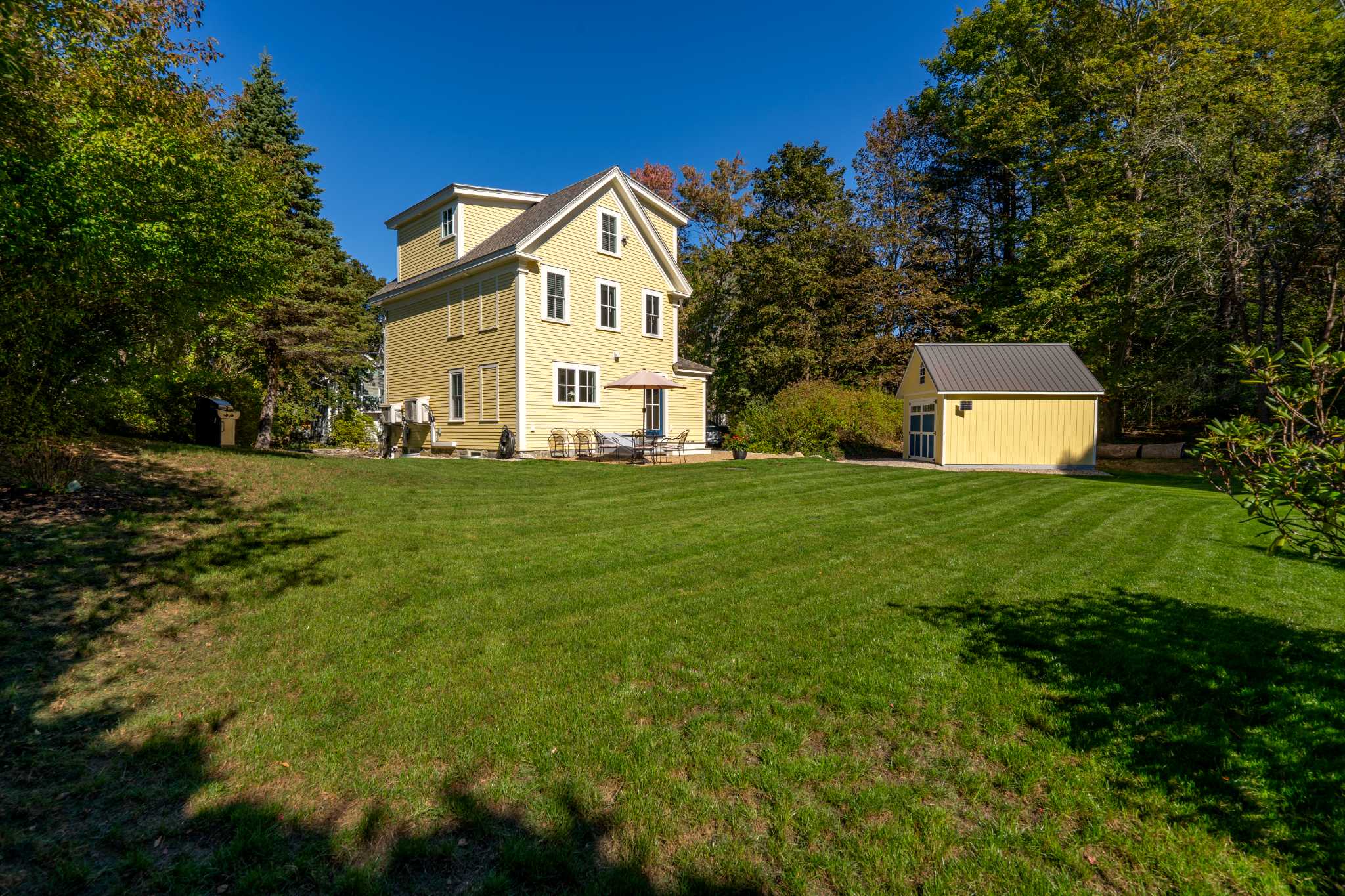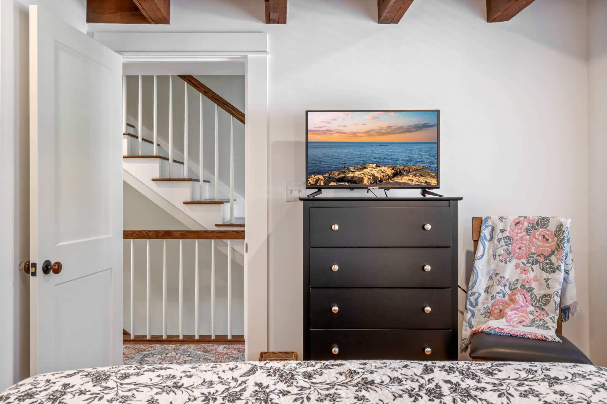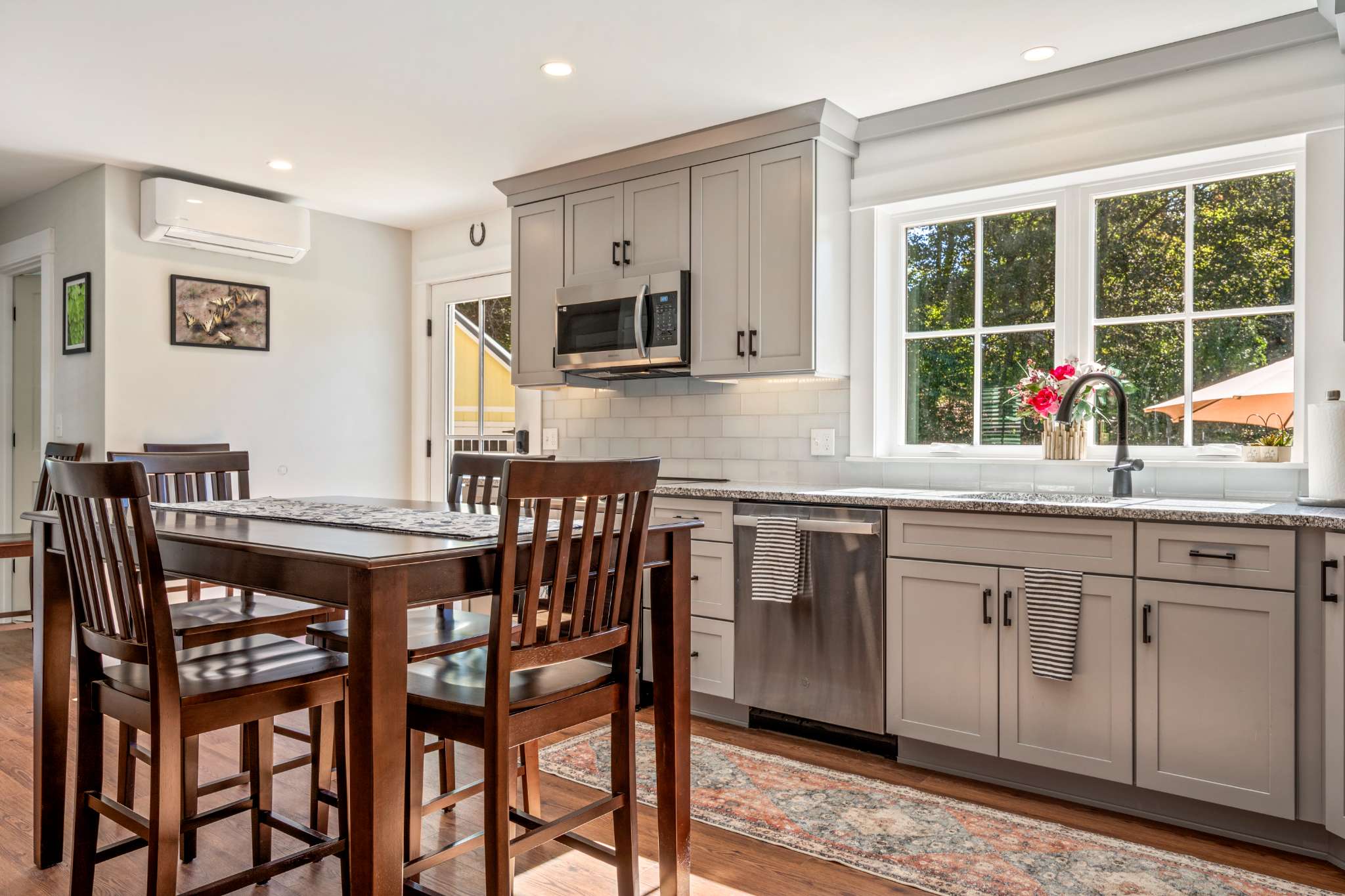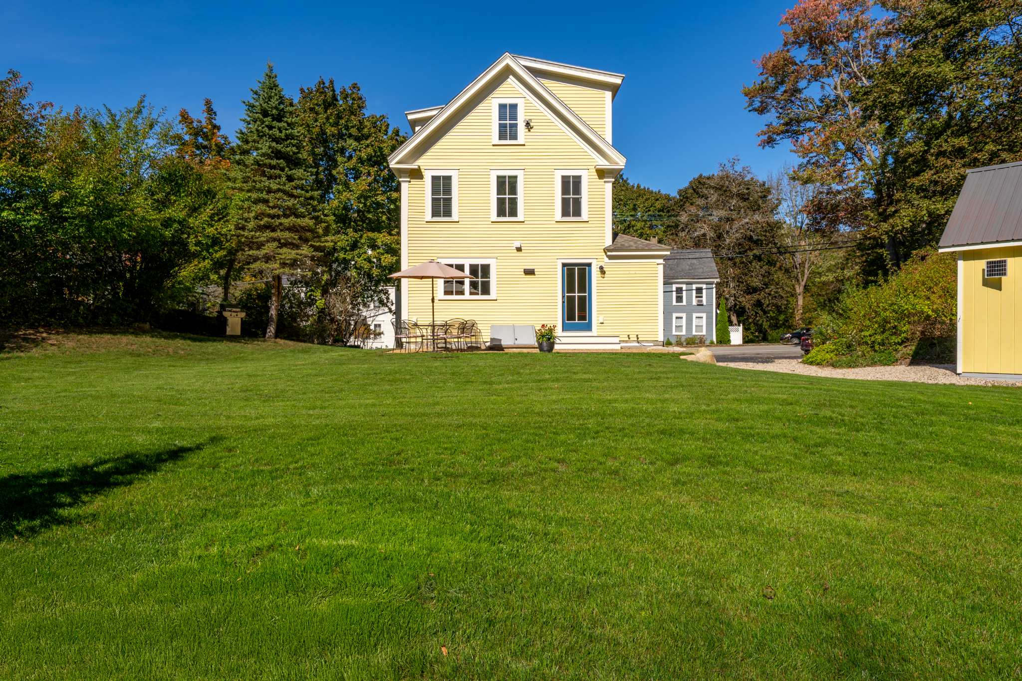 When you arrive, you’ll feel right at ease in the cozy living room, where a smart TV, comfortable couch, and two armchairs invite you to relax after a day of seaside adventures. A small desk in the corner offers a quiet spot to catch up on work or write postcards home. The eat-in kitchen features sleek stainless steel appliances and granite countertops, perfectly blending modern convenience with classic style. Enjoy meals together at the dining table for six before heading outdoors to make the most of Maine’s fresh air—fire up the grill, dine at the table for six under the umbrella, or unwind in the spacious backyard surrounded by nature.