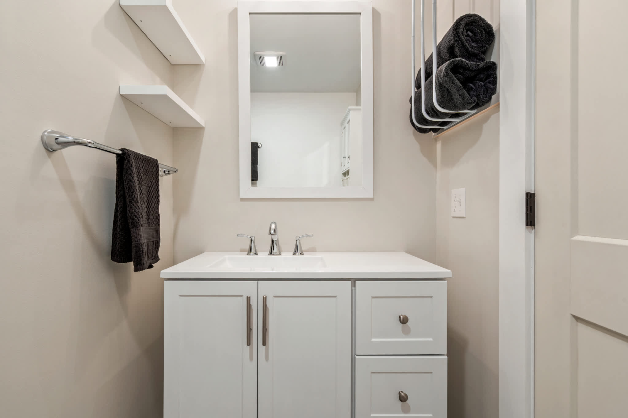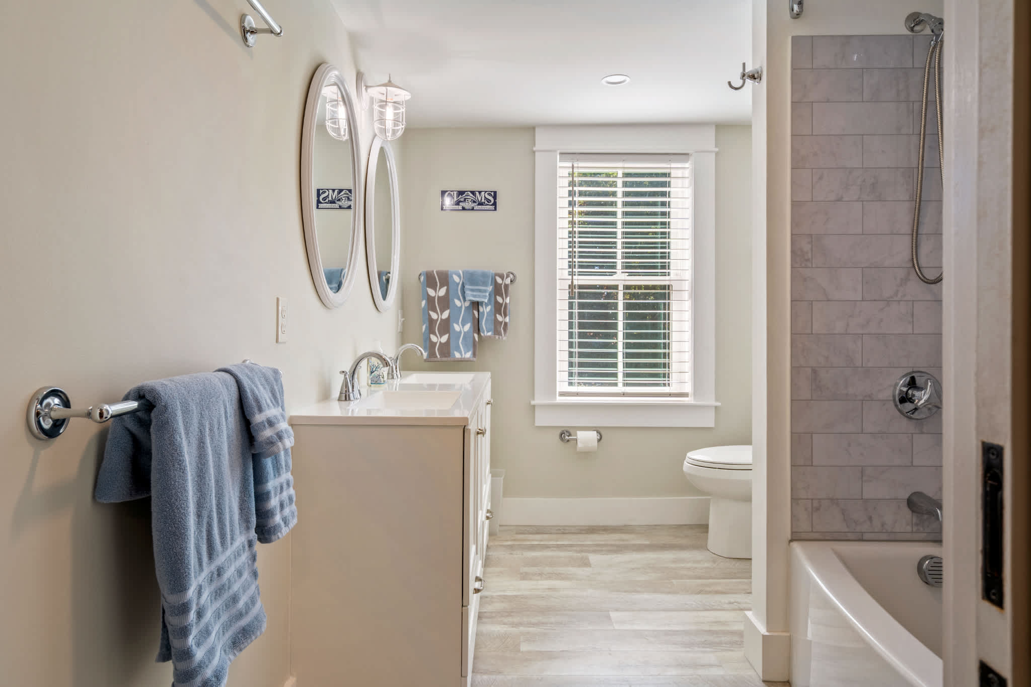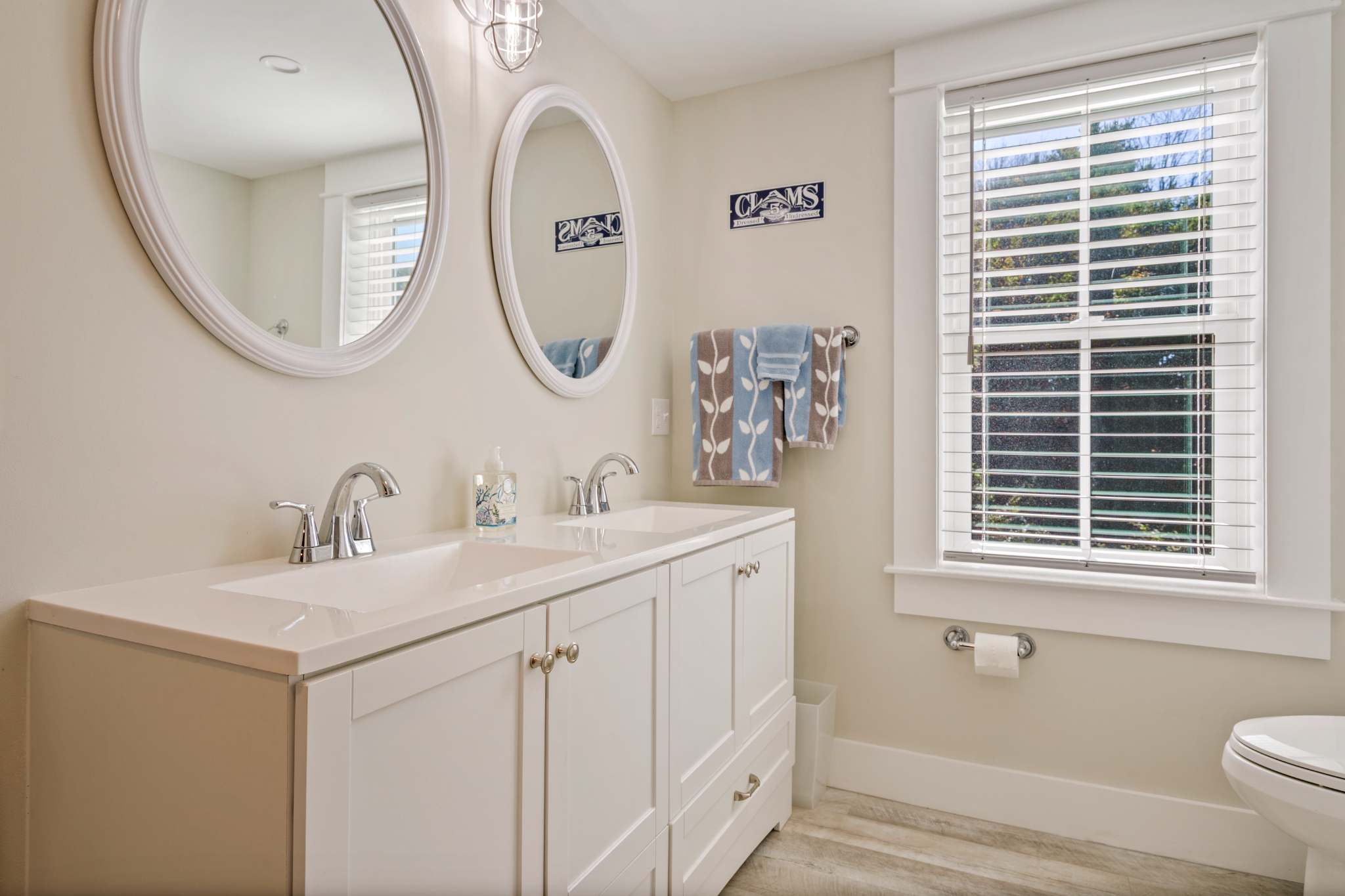 This home also includes a half bathroom and an additional full guest bathroom with a dual vanity and a shower/tub combo.