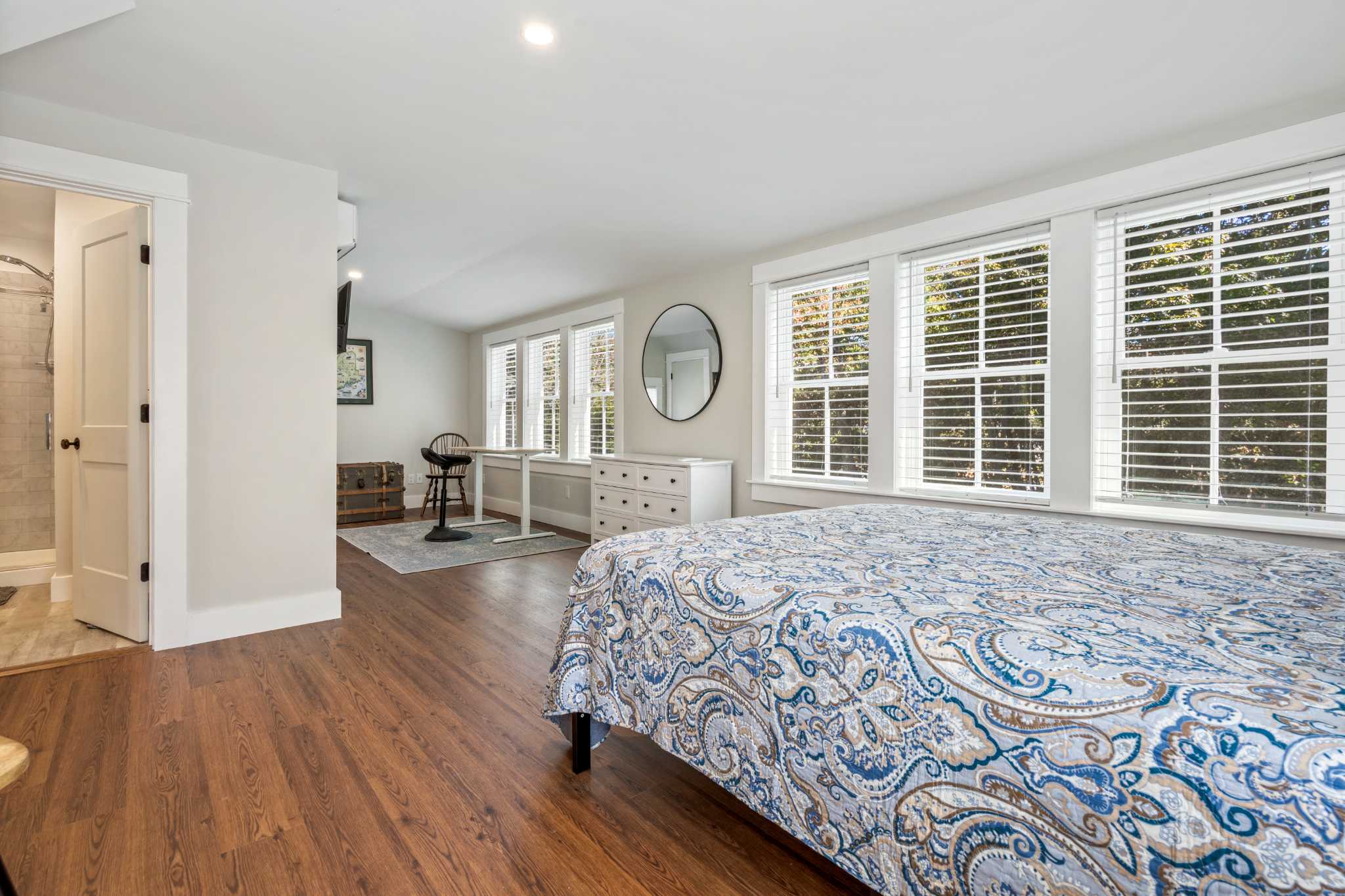 Bedroom #3 includes a queen size bed, with smart TV and an ensuite bathroom with a single vanity and a glass walk-in shower.