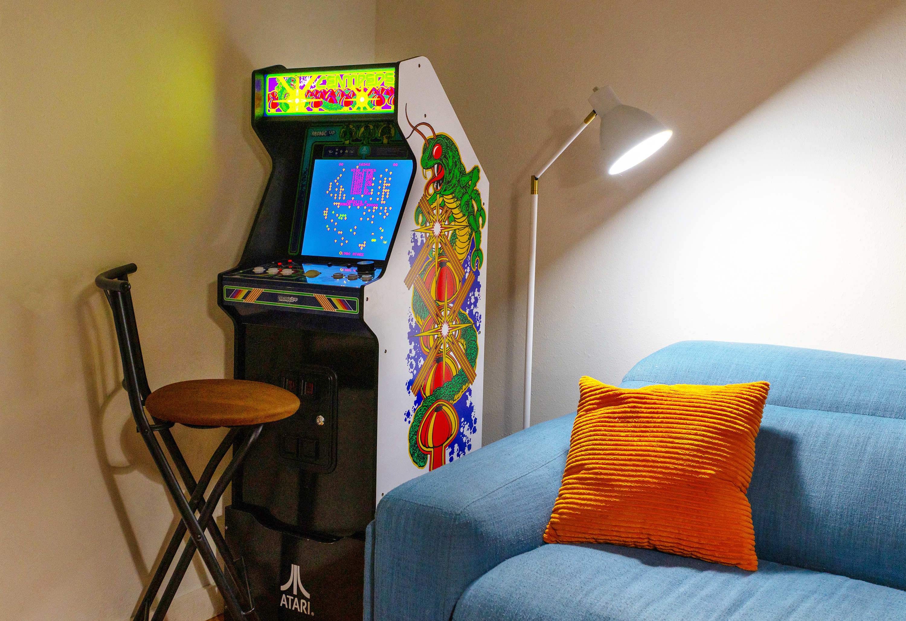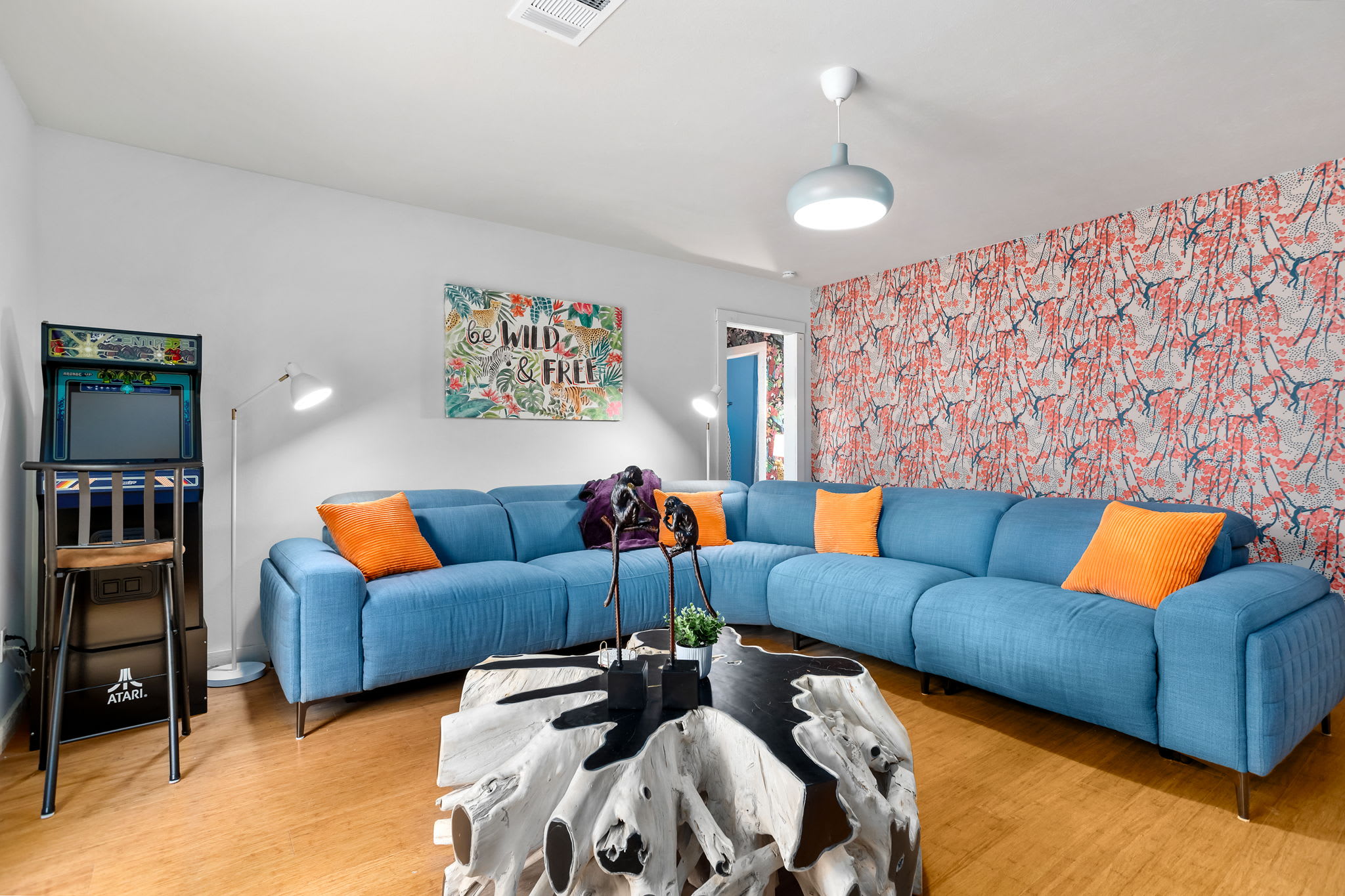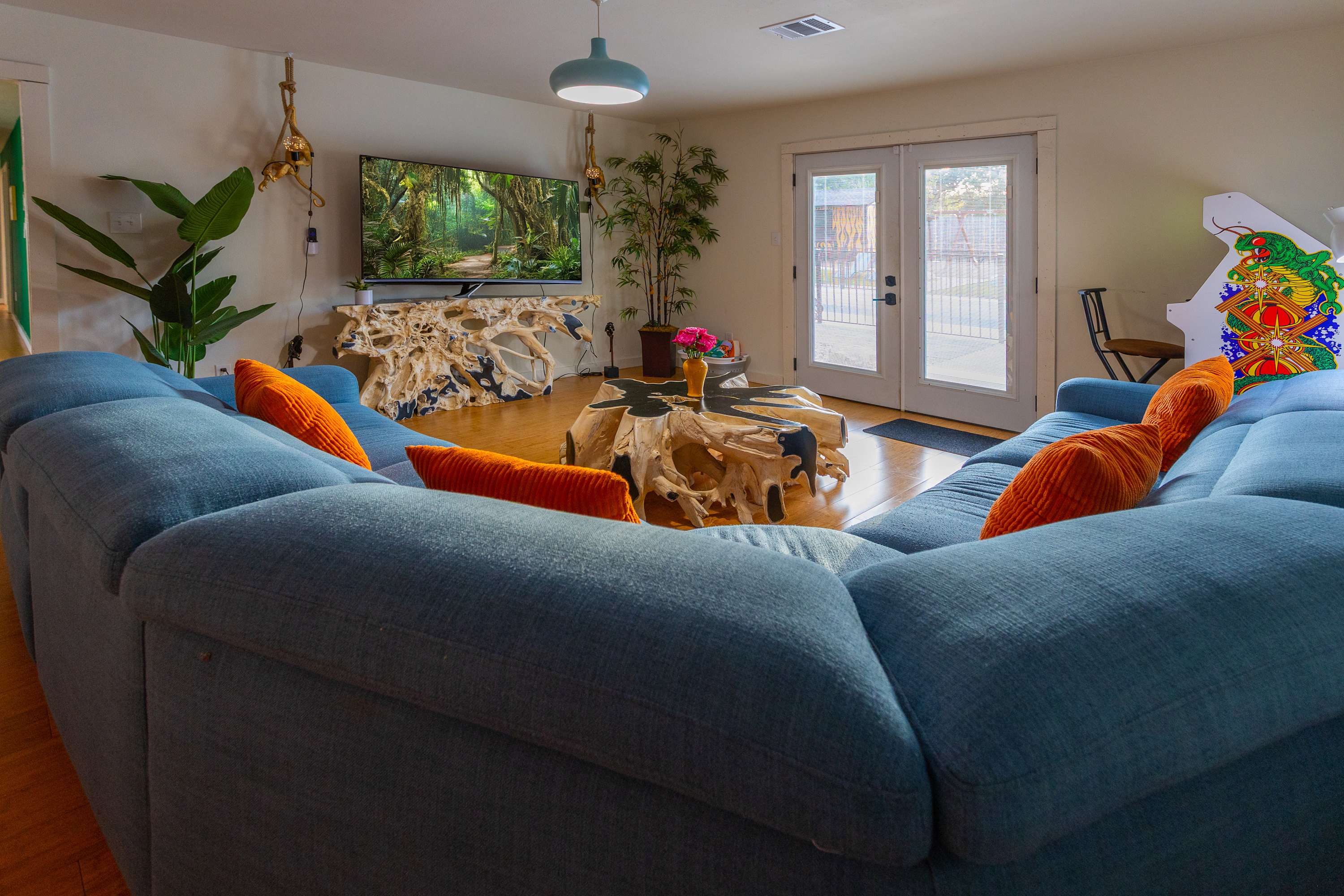 Step inside the main house and feel instantly at ease in the open-concept living room, where a plush couch and two armchairs invite you to relax. The connected kitchen offers both Keurig and drip coffee options, stainless appliances, and counter seating for two, while the dining table for eight is perfect for shared meals. Enjoy the entertainment room with a massive wraparound couch, old school, arcade style Centipede game, and large TV ideal for movie nights.