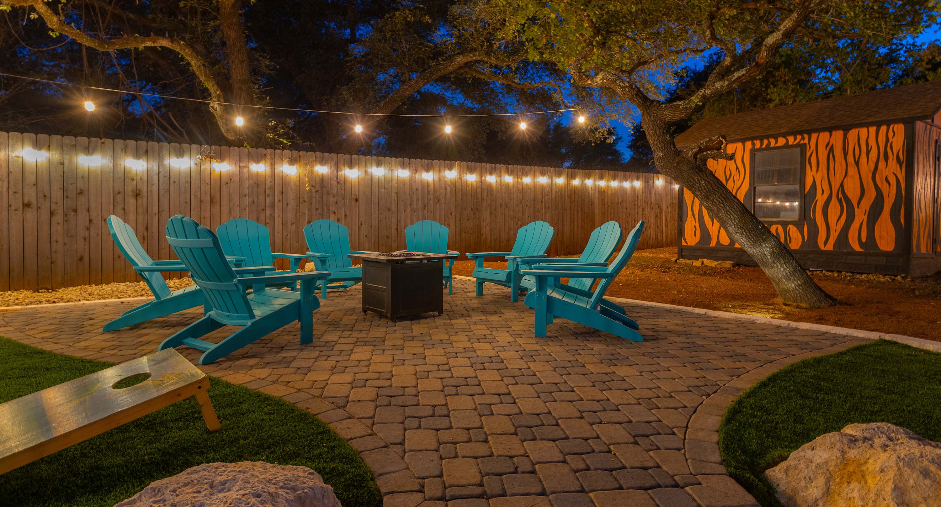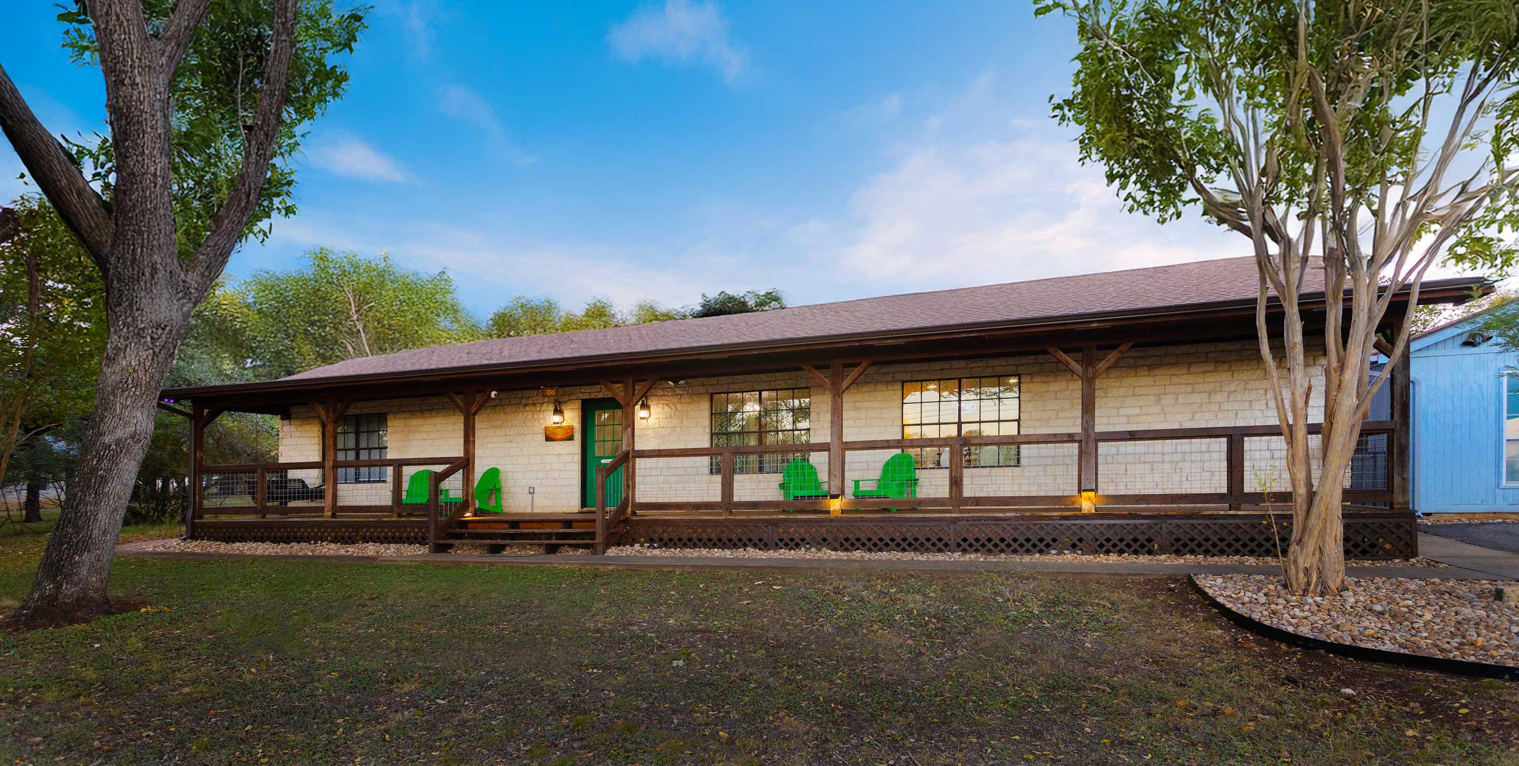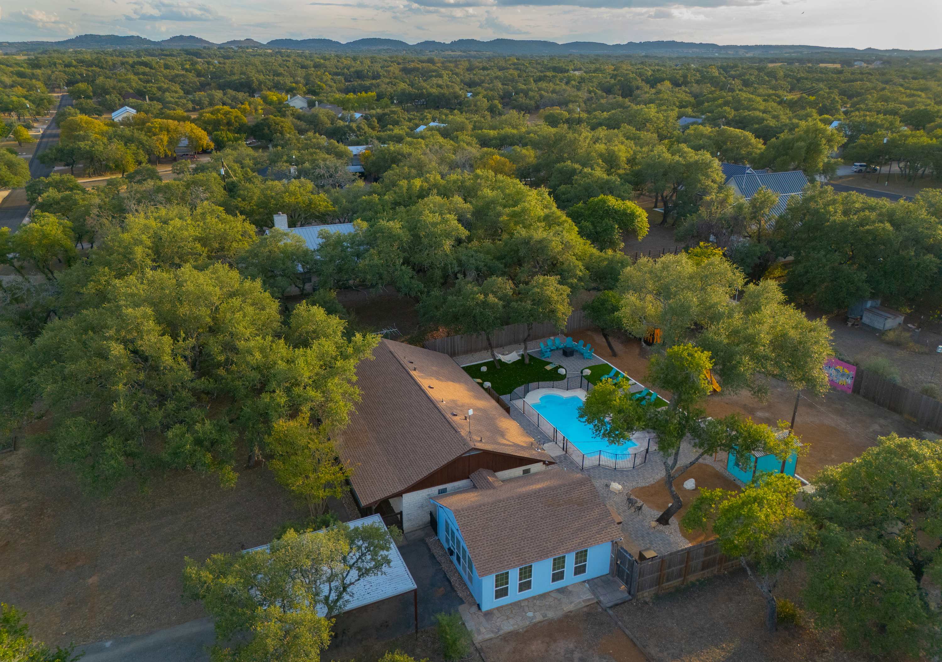 Outside, you’ll find the heart of Jungle Haven—a stunning outdoor oasis designed for fun and relaxation. Take a dip in the heated pool (open year-round), unwind in the hot tub, or gather around the fire table beneath the Hill Country stars. With ample lounge seating, a table for eight, and a gated pool area, it’s the perfect setup for families and groups of up to twelve. The property also features a second building, affectionately named Surfin’ Safari, a charming home with its own small kitchen and dining space—great for added privacy or extra guests.
