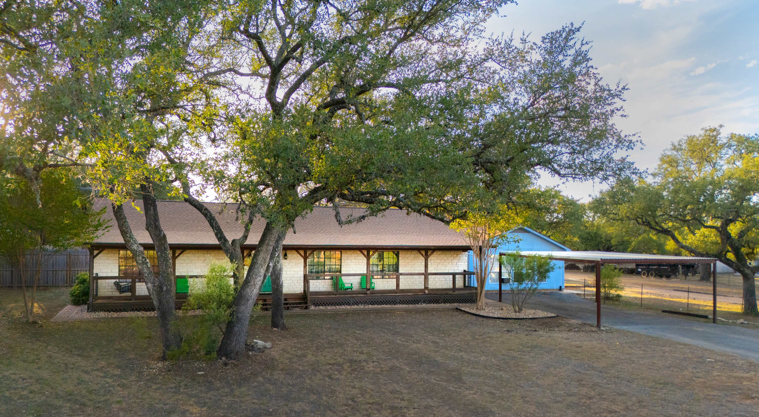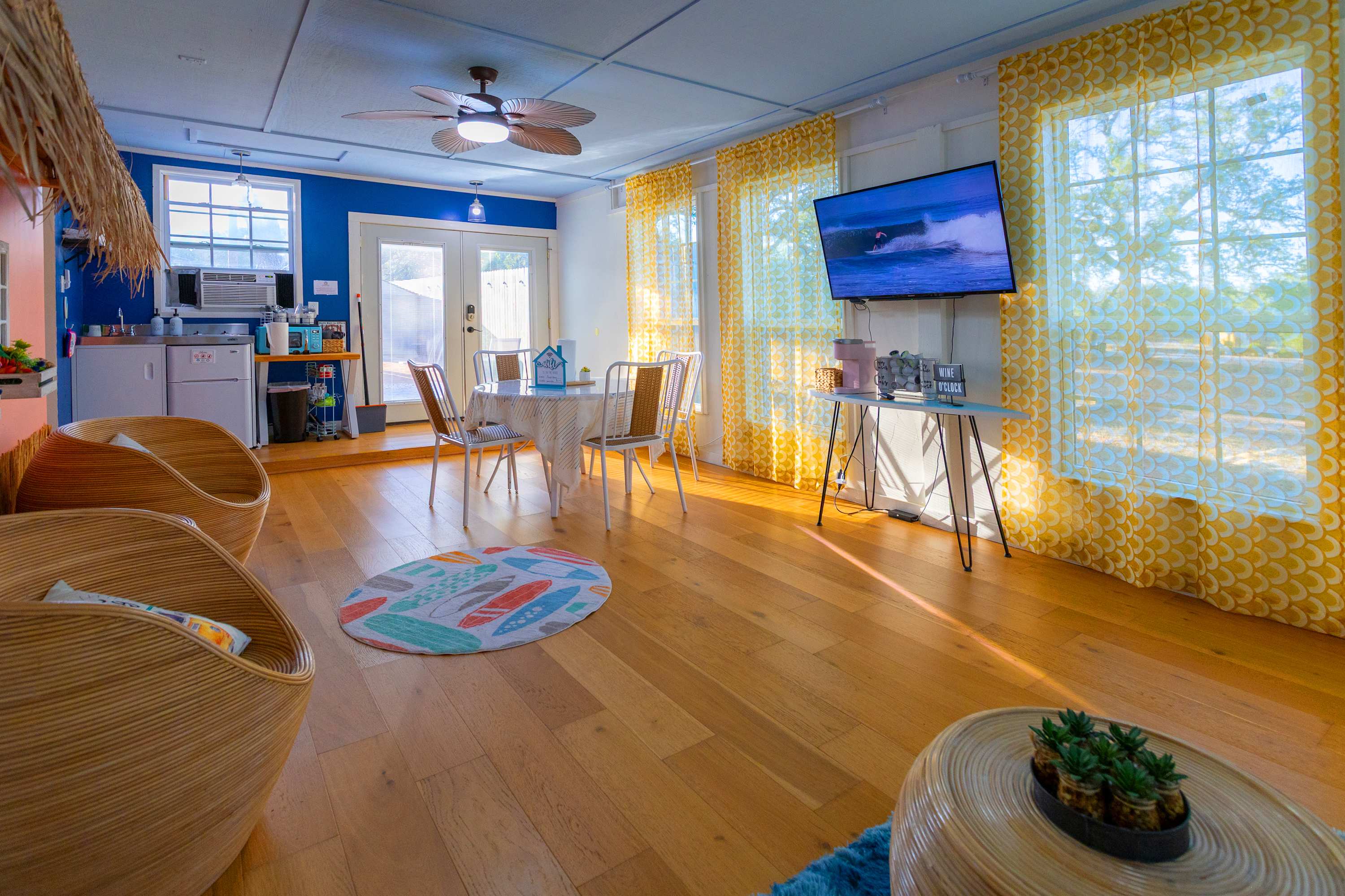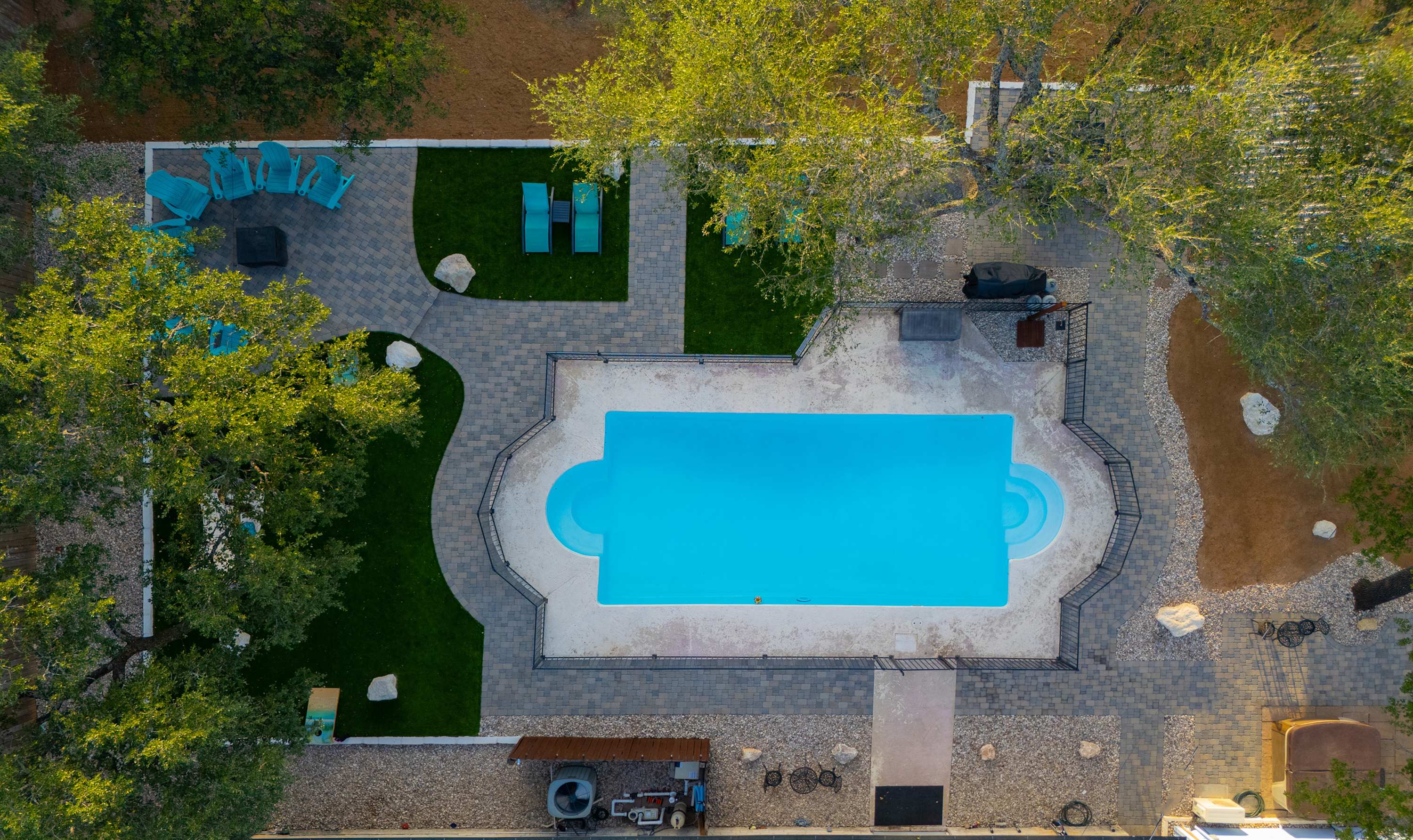Outside, you’ll find the heart of Jungle Haven—a stunning outdoor oasis designed for fun and relaxation. Take a dip in the heated pool (open year-round), unwind in the hot tub, or gather around the fire table beneath the Hill Country stars. With ample lounge seating, a table for eight, and a gated pool area, it’s the perfect setup for families and groups of up to twelve. The property also features a second building, affectionately named Surfin’ Safari, a charming home with its own small kitchen and dining space—great for added privacy or extra guests.