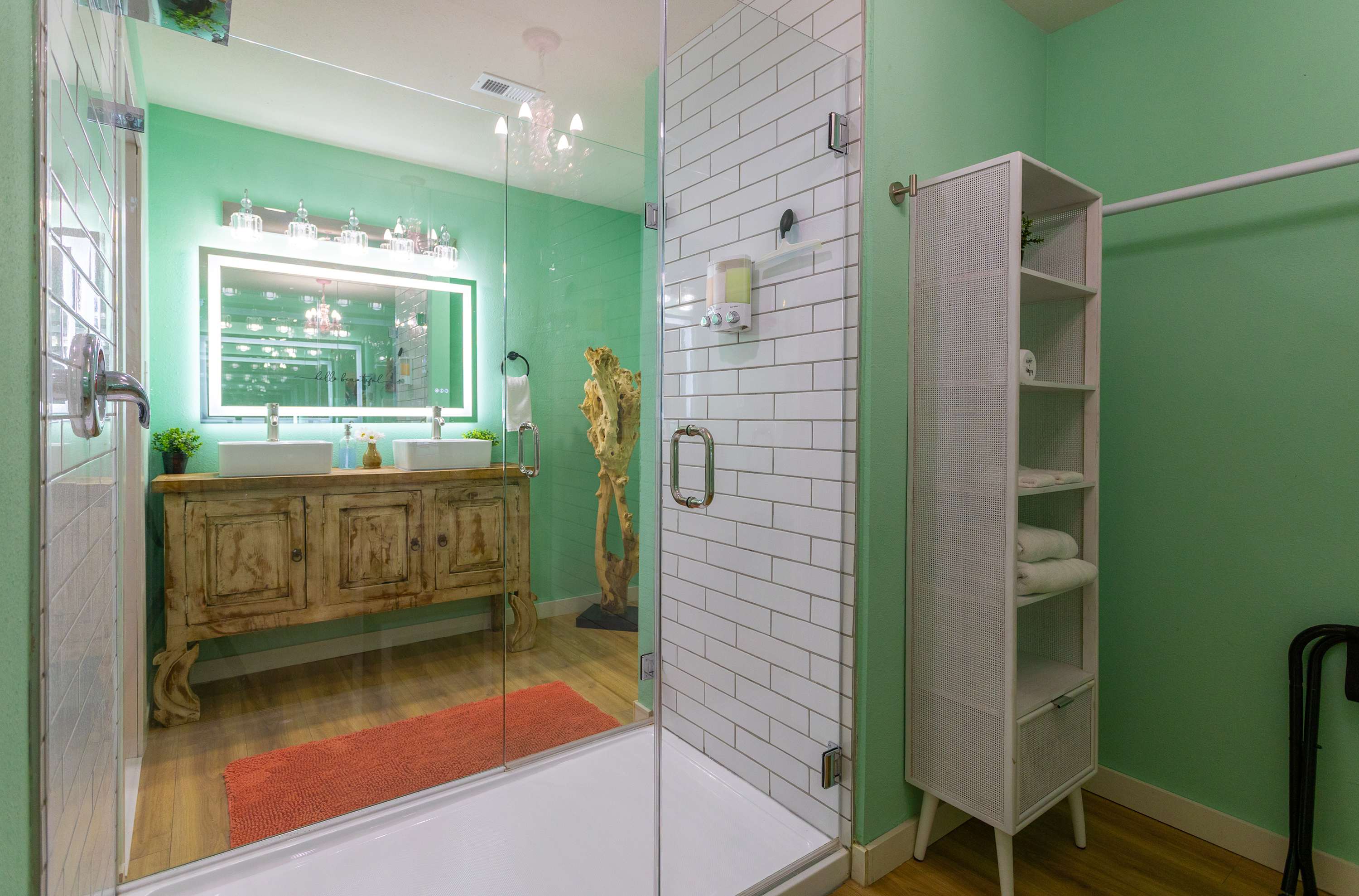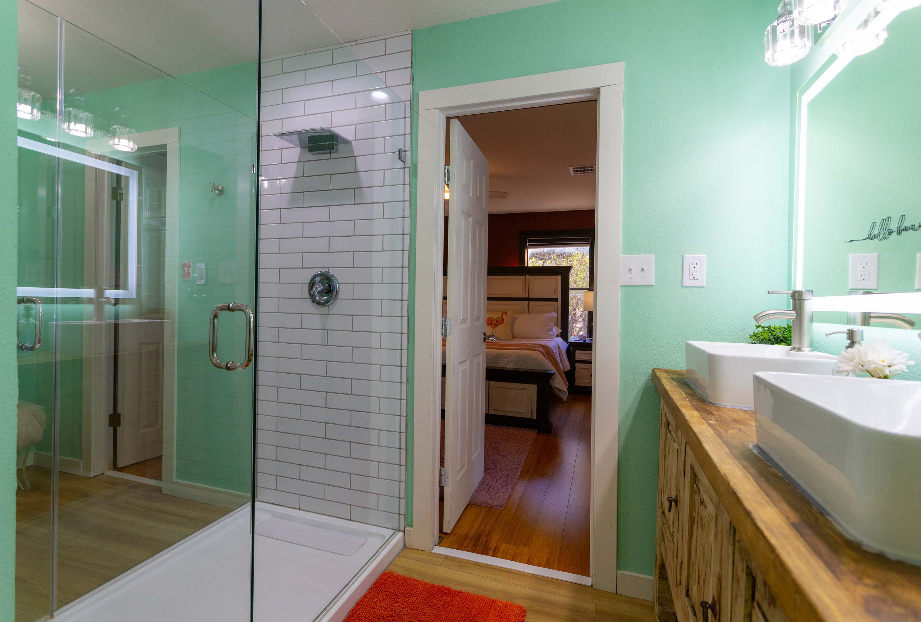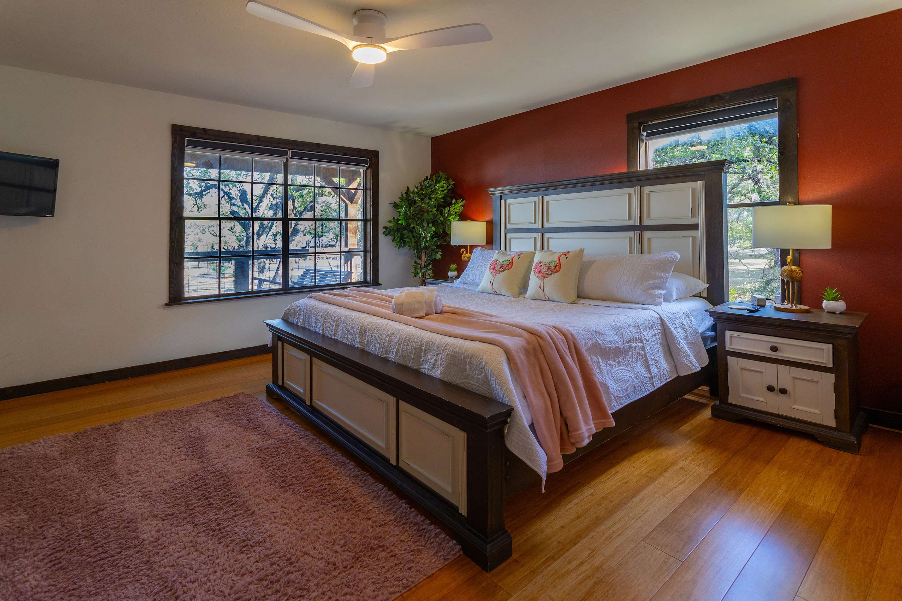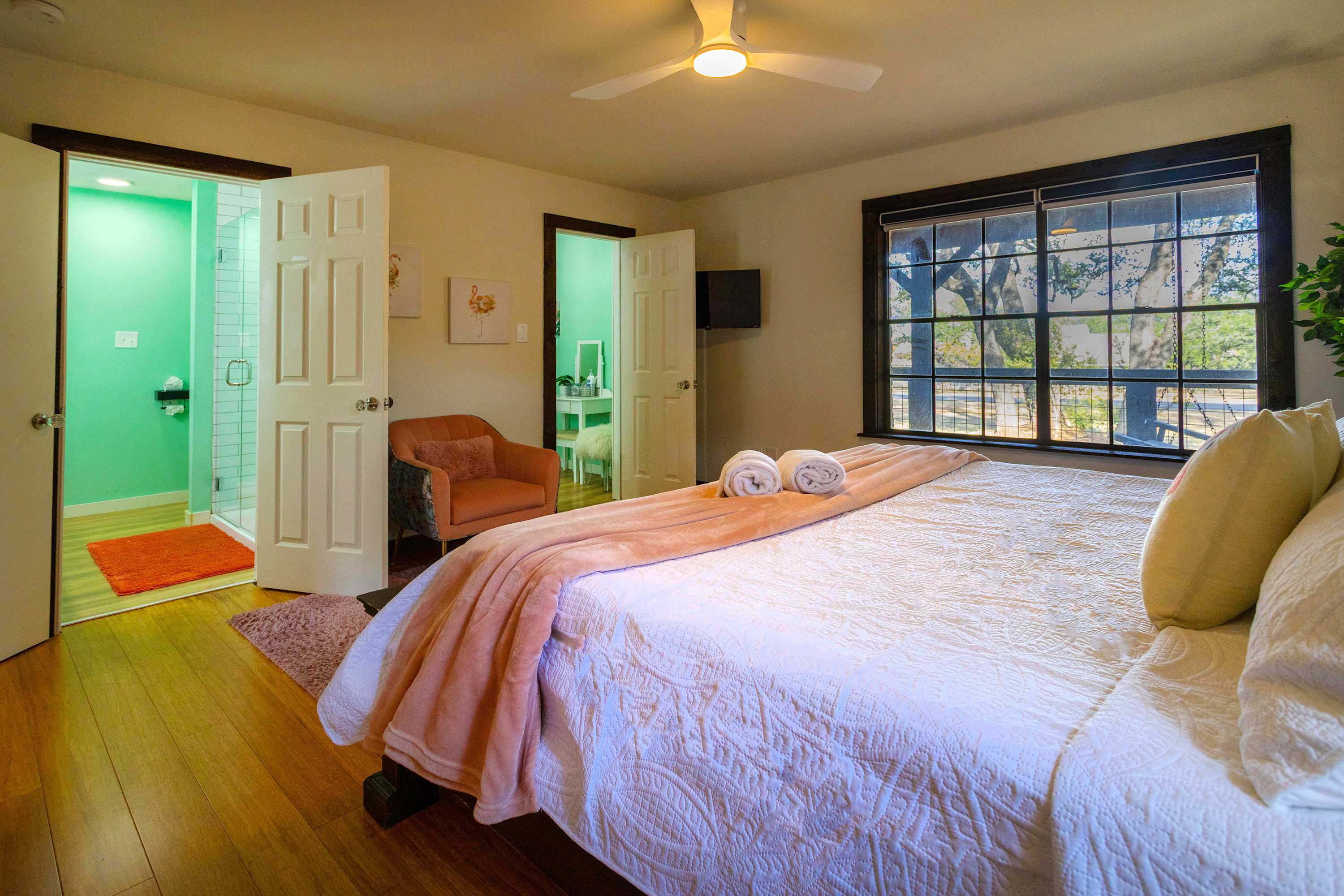 Bedroom #1 is pink flamingo themed and includes king size bed, a smart TV, and an ensuite bathroom with a dual vanity and a walk-in glass shower.