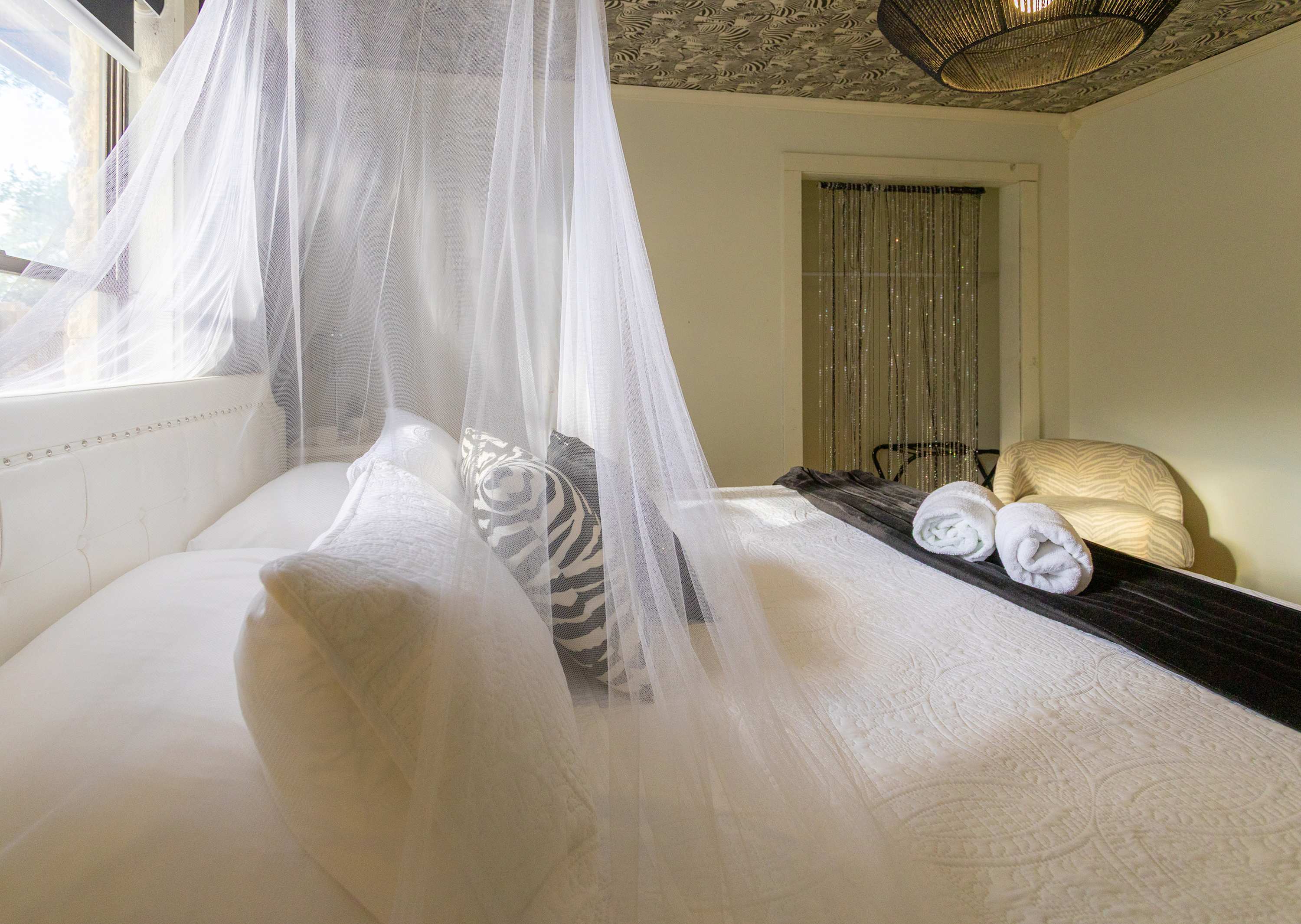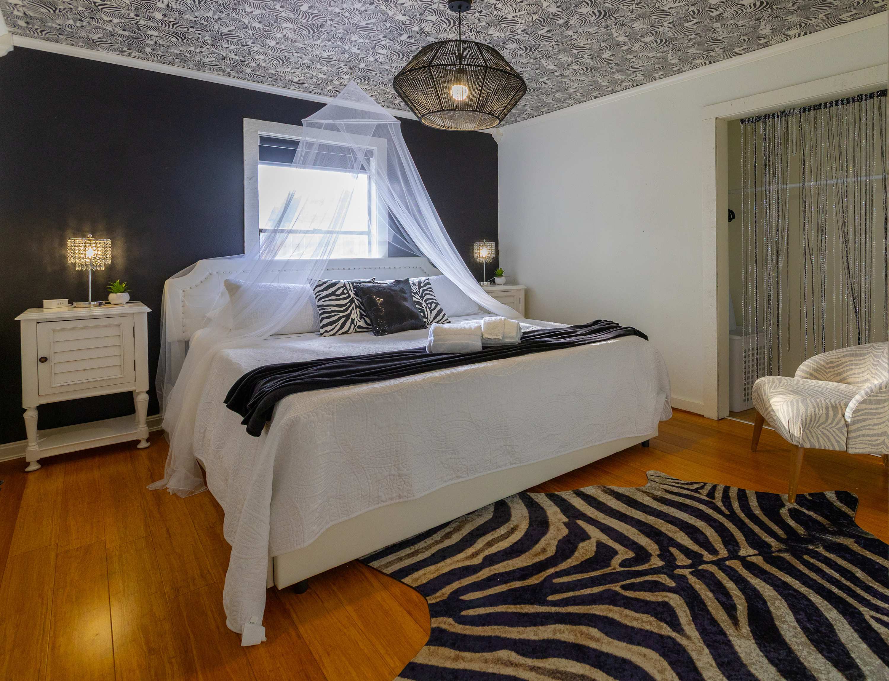 Bedroom #3 is zebra themed and includes a king size bed.