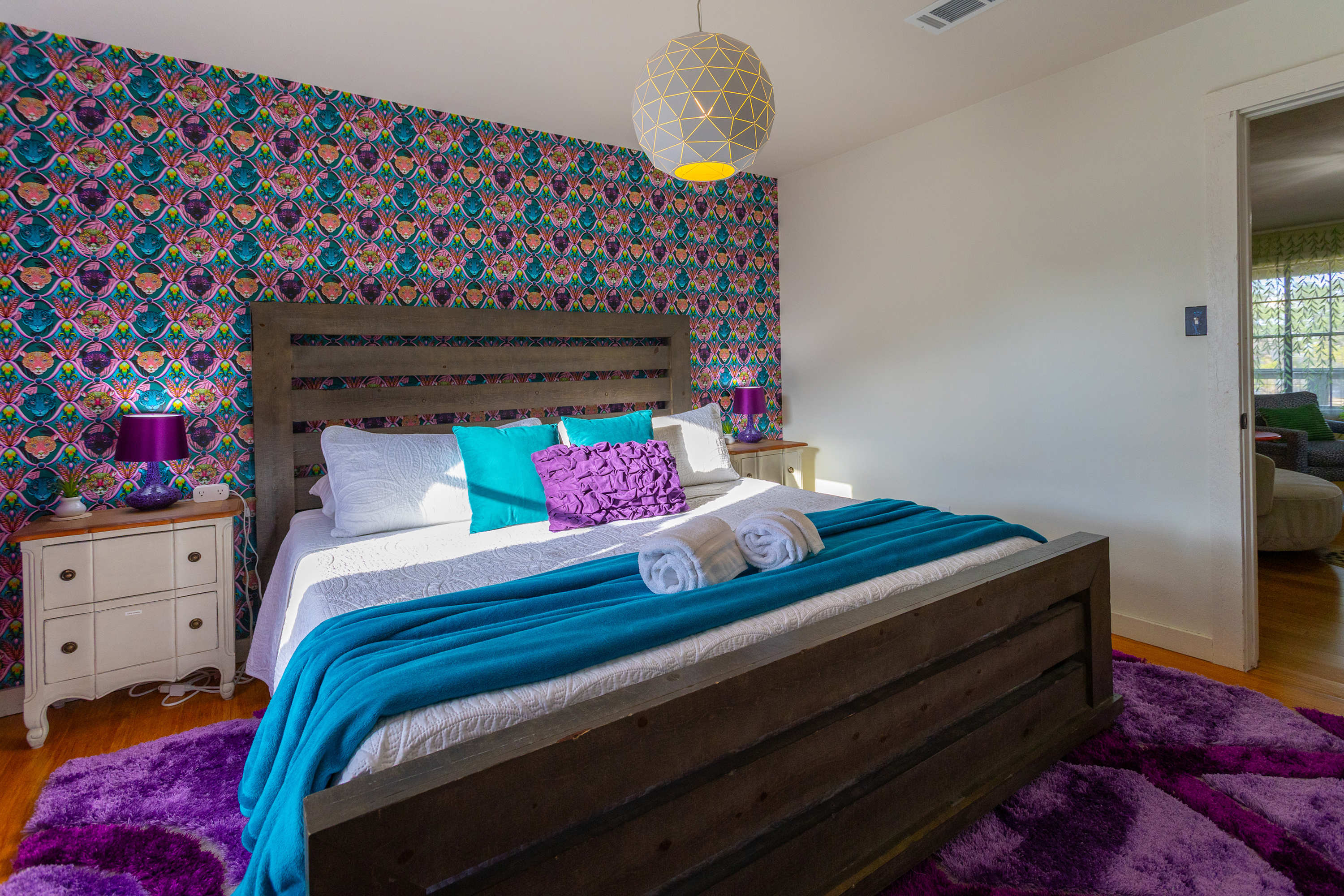 Bedroom #4 is purple panther themed and includes a king size bed.