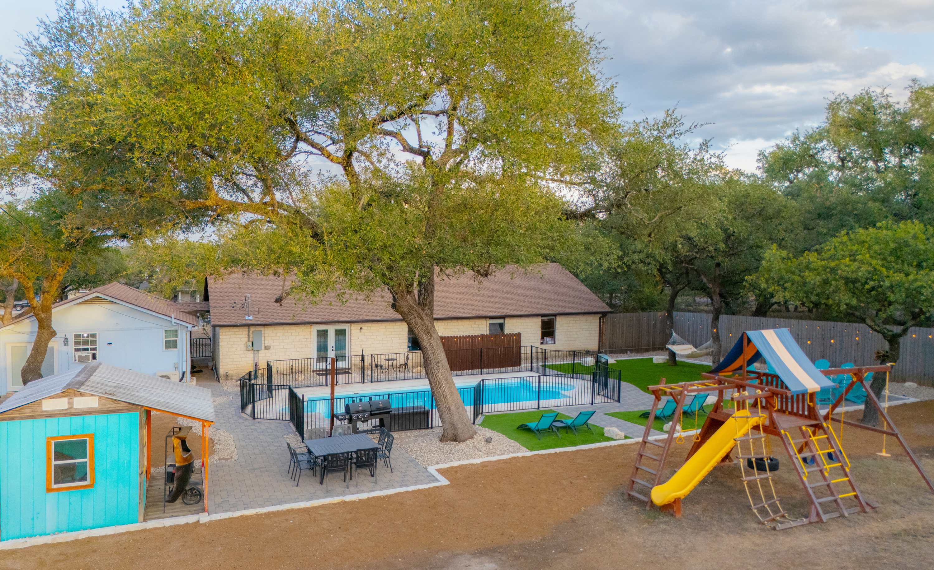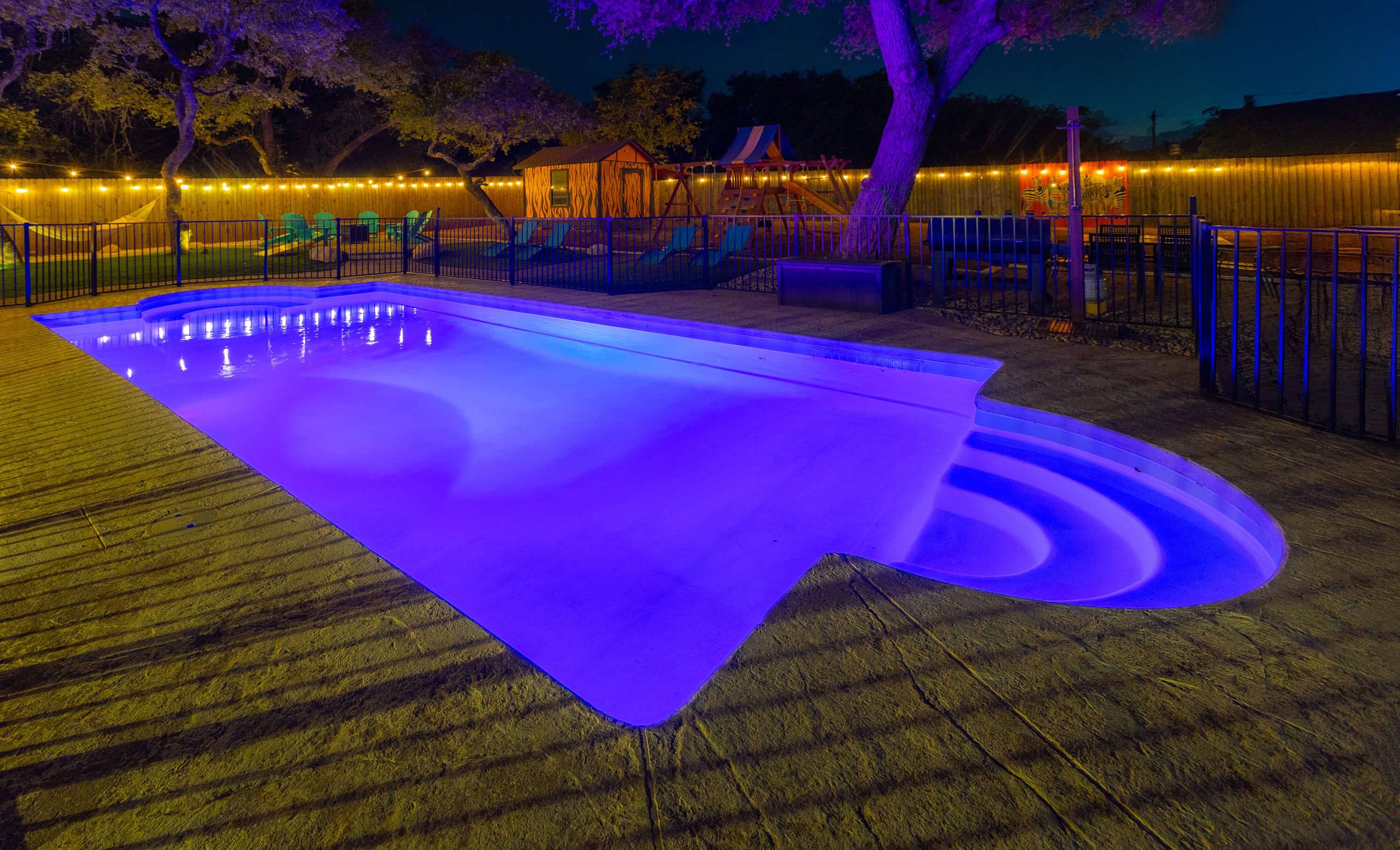 Kids can enjoy the playscape and cornhole while adults lounge in hammocks or sip local wine by the pool. Whether you’re seeking a family adventure, a romantic retreat, or a festive getaway, Jungle Haven offers the perfect blend of comfort, playfulness, and Hill Country magic.