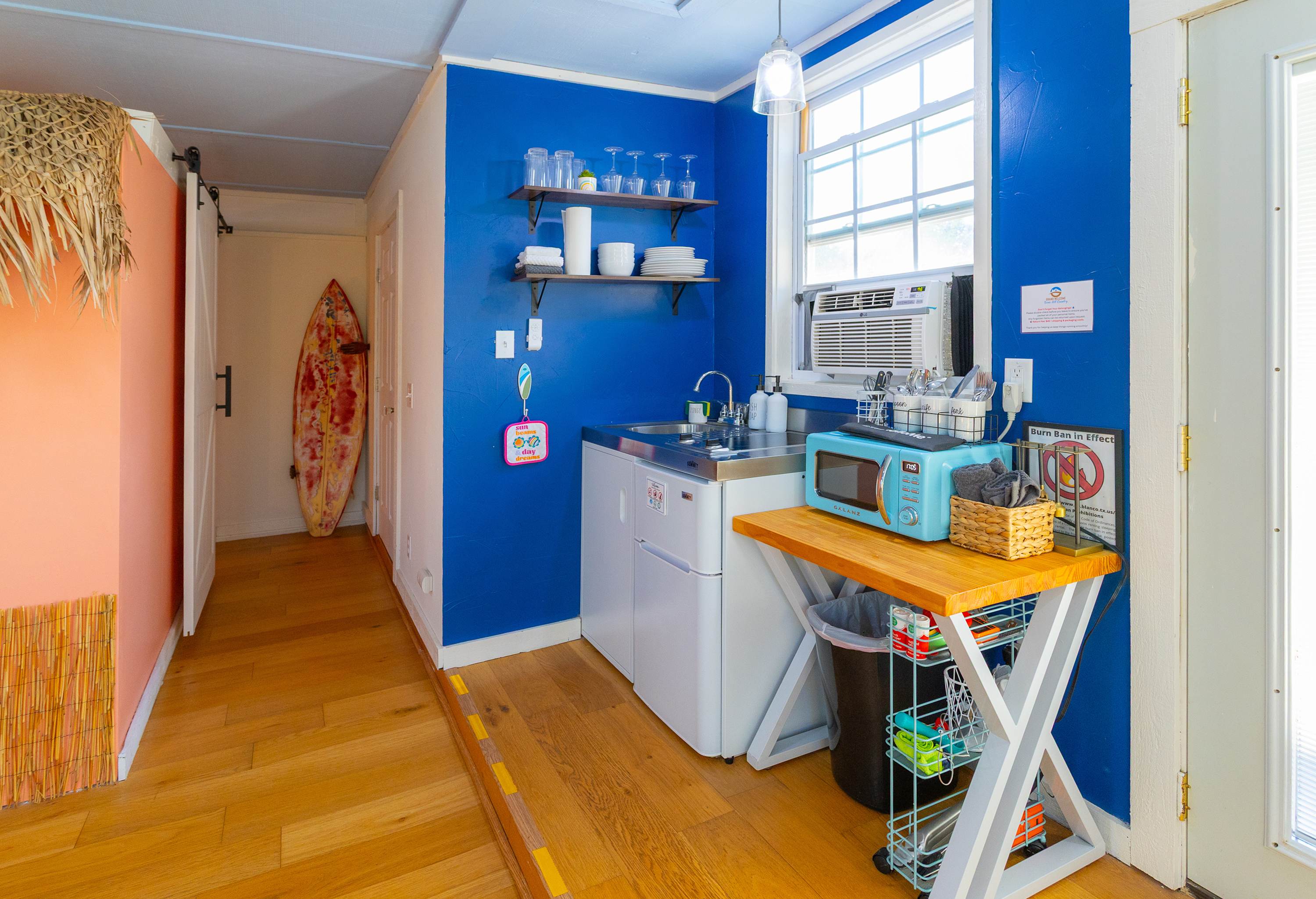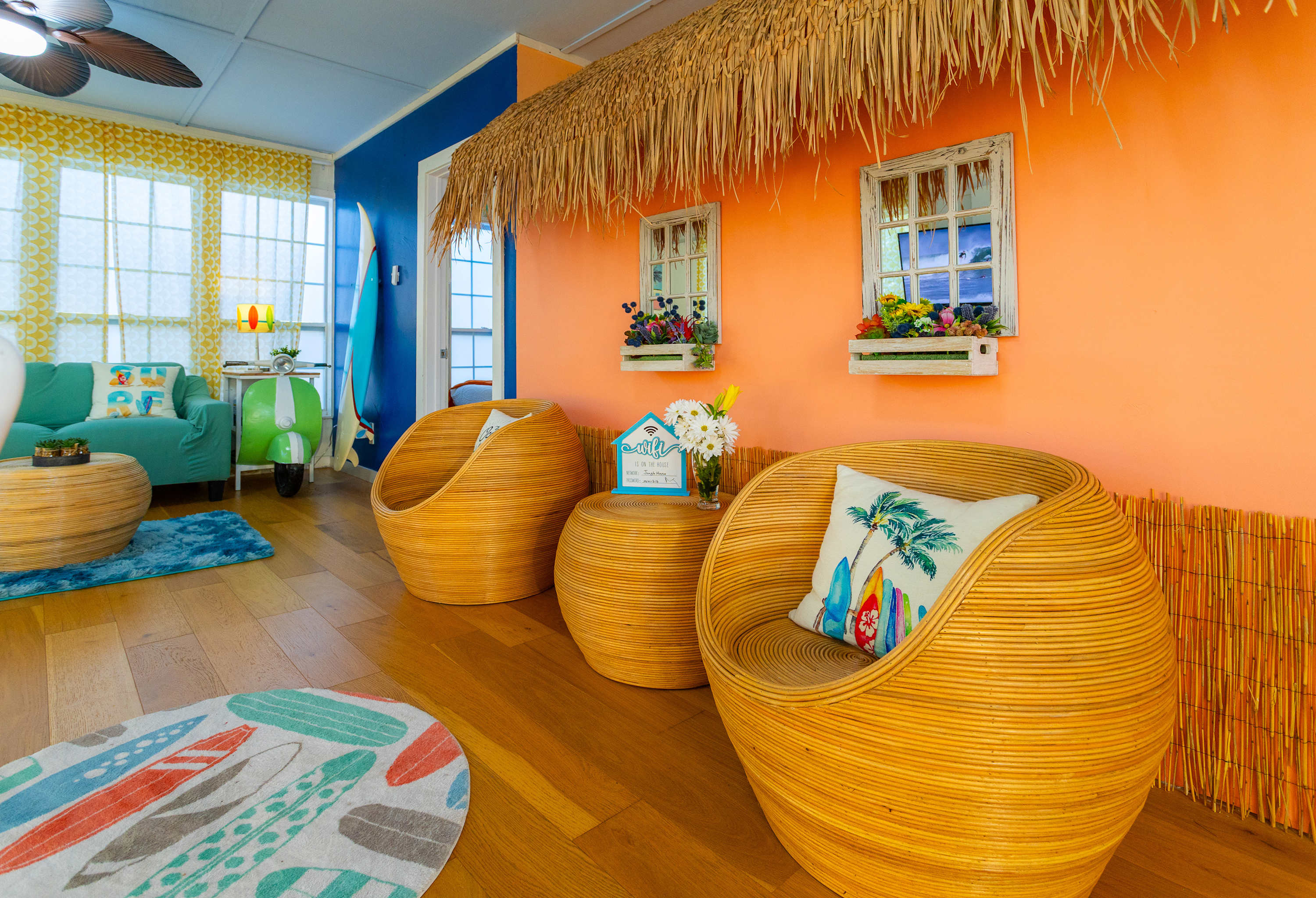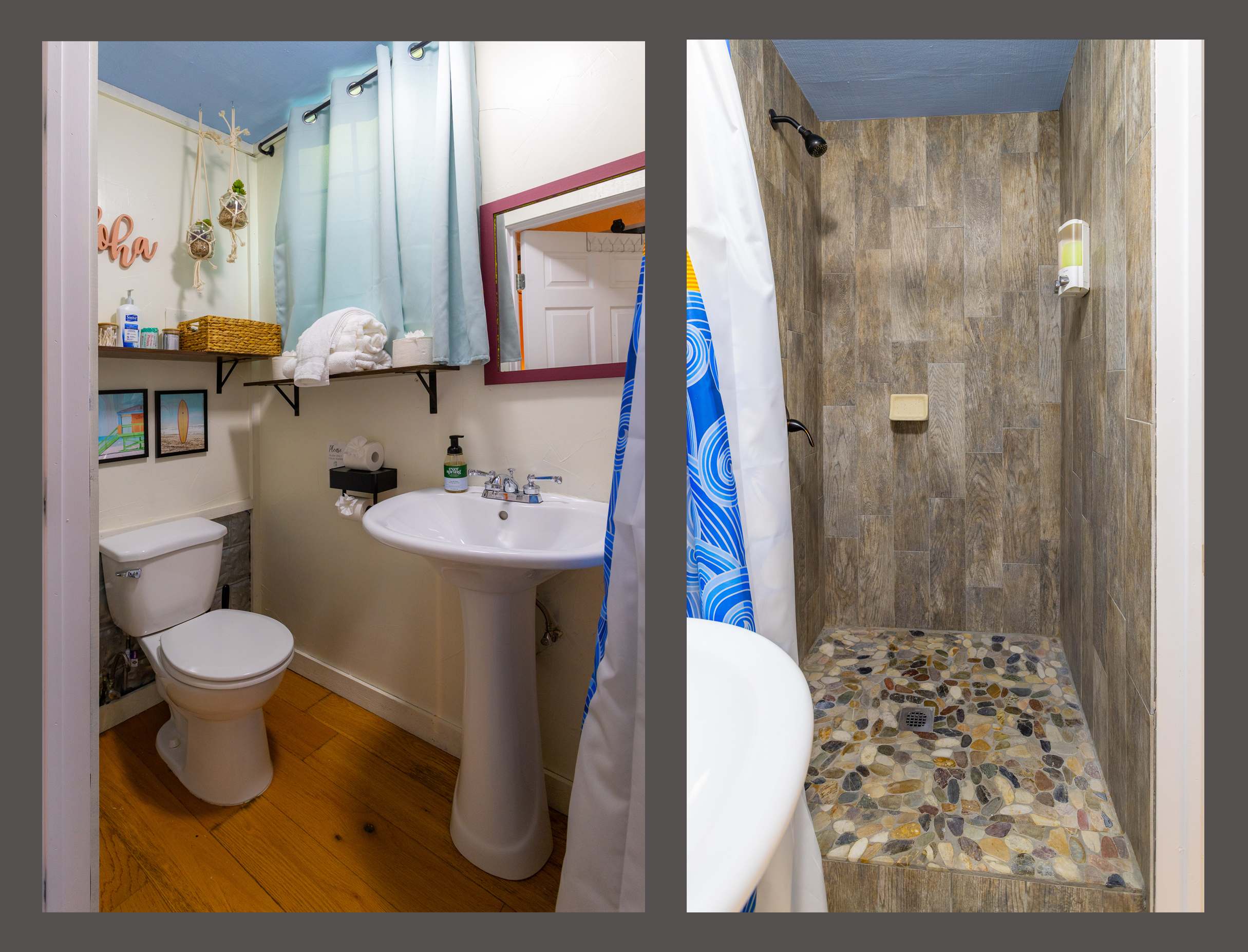 This home also includes a full bathroom with a single vanity and a shower/tub combo in the main house, as well as a full bathroom with a single vanity and a walk-in shower in the Surfin’ Safari building.