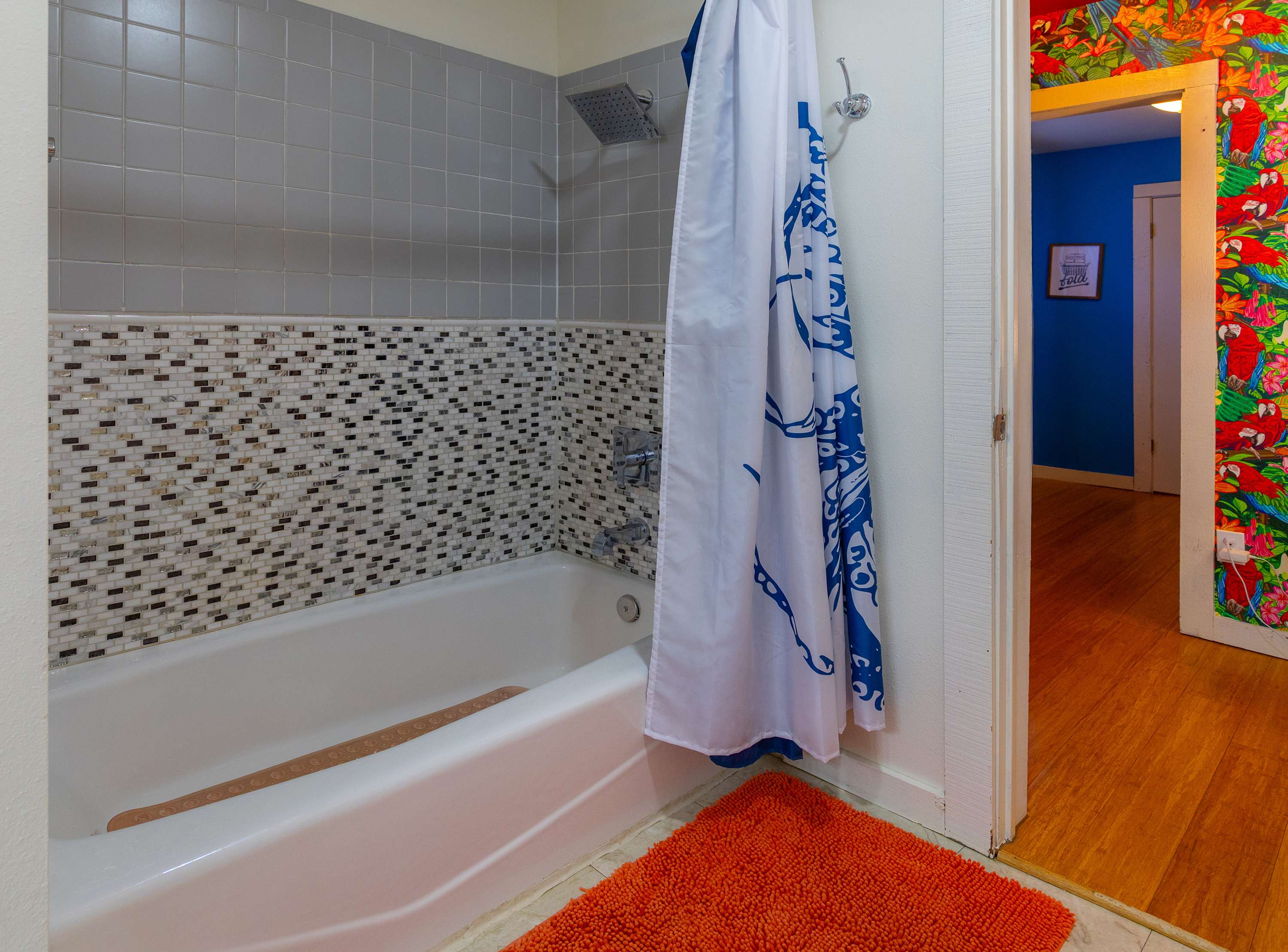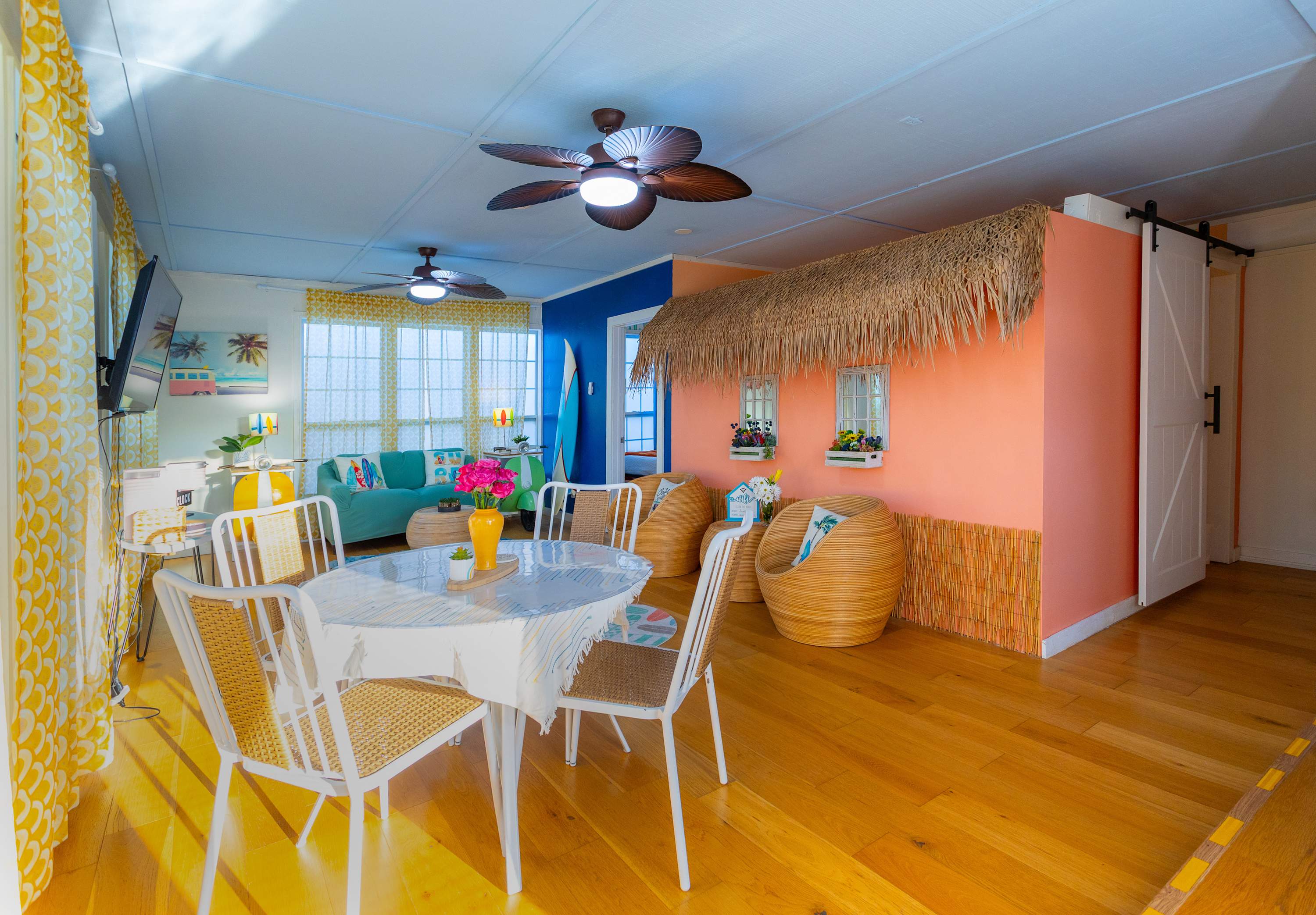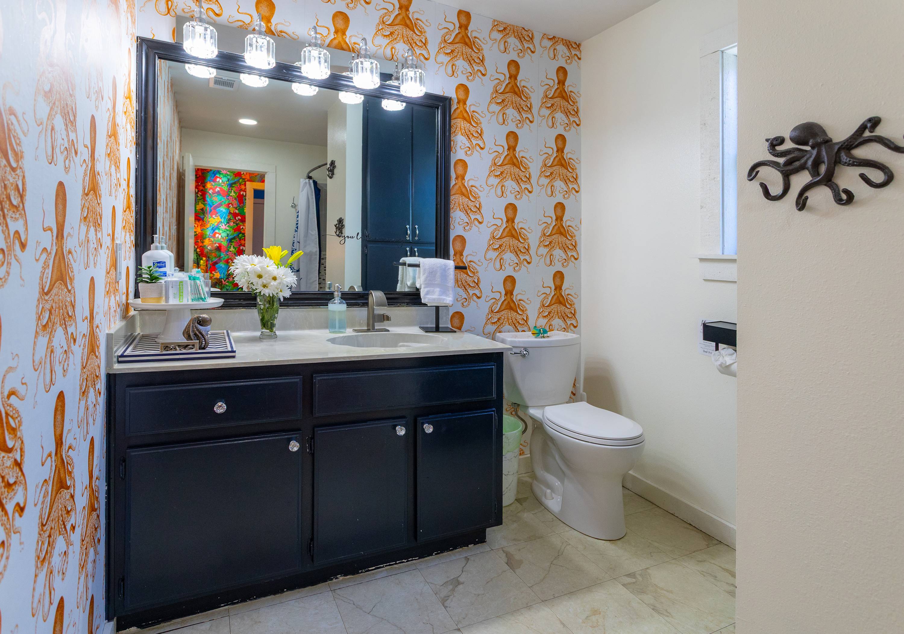 This home also includes a full bathroom with a single vanity and a shower/tub combo in the main house, as well as a full bathroom with a single vanity and a walk-in shower in the Surfin’ Safari building.