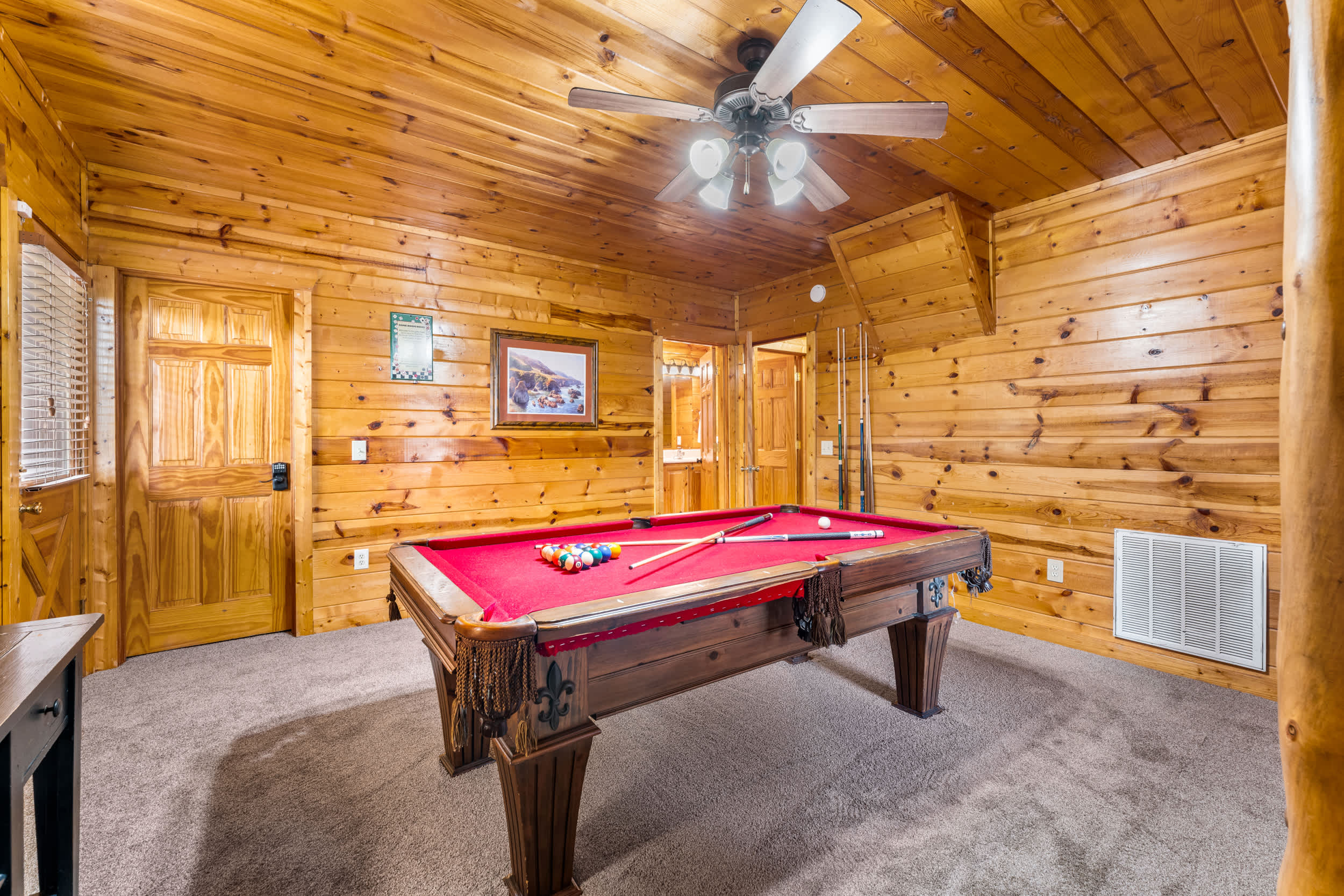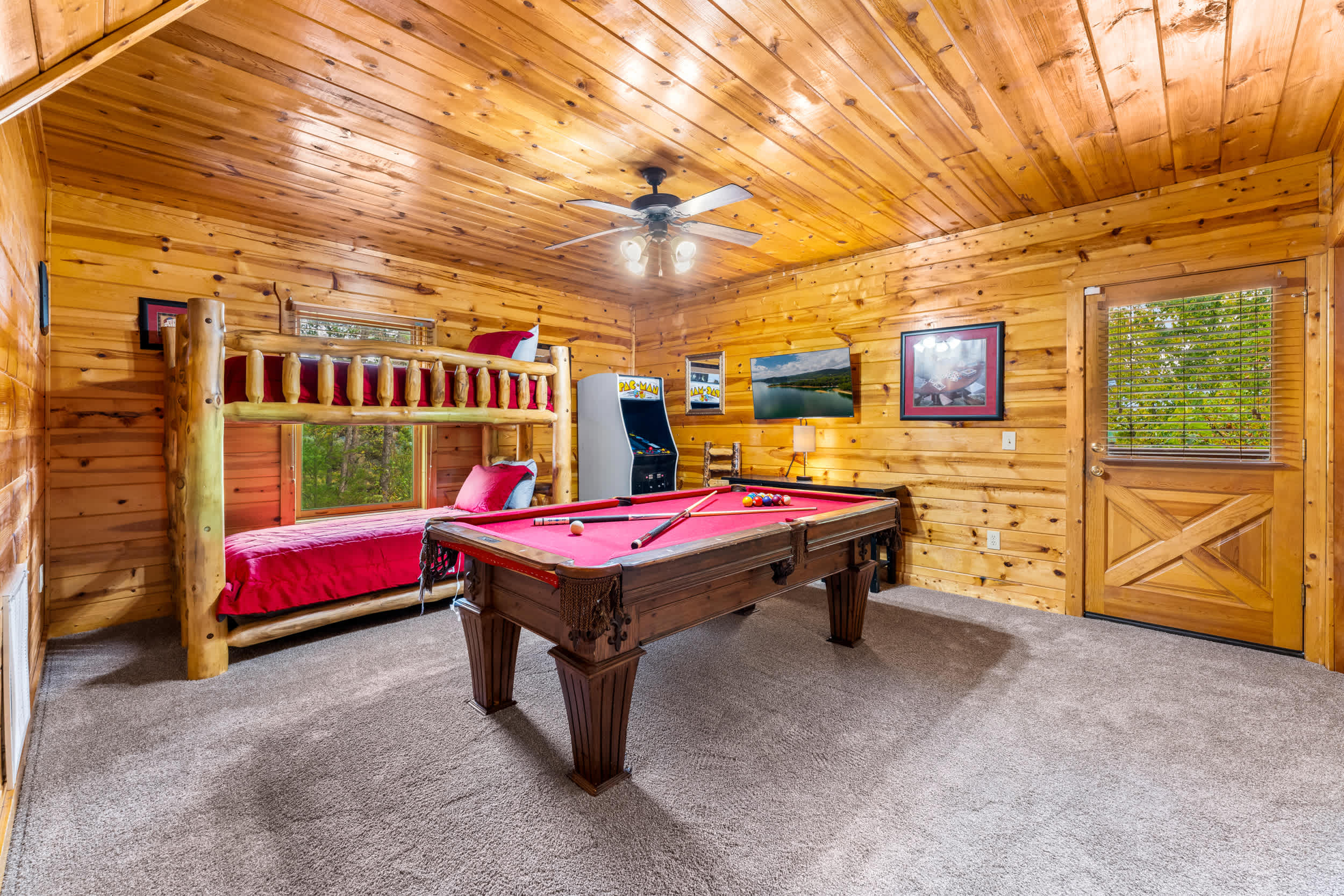 • Bedroom 4/Game Room (Lower Level): Twin/Twin bunk, Smart TV, pool table, arcade, deck access, shares Jack-and-Jill bath