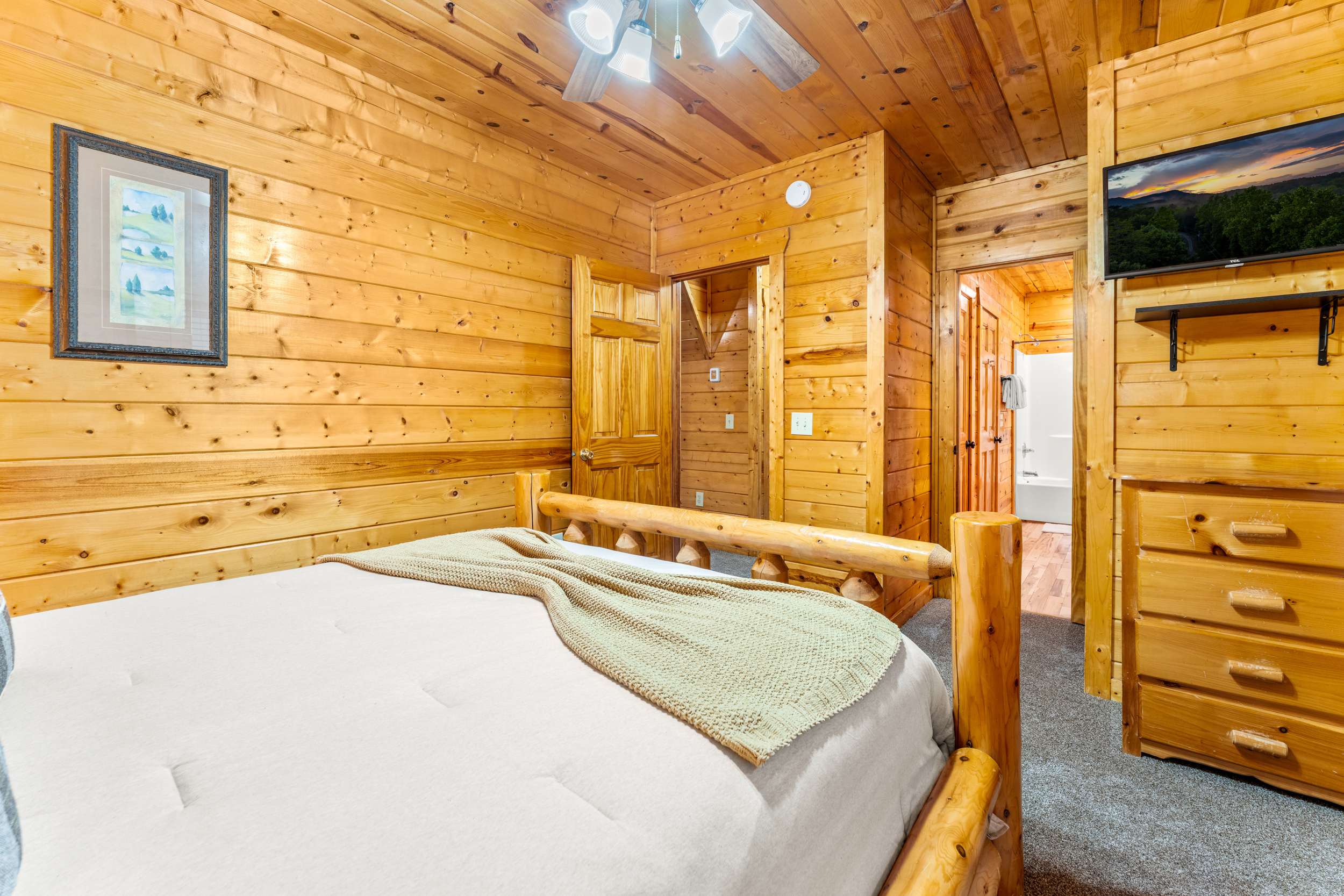 • Bedroom 3 (Lower Level): Queen bed, Smart TV, shares Jack-and-Jill bath