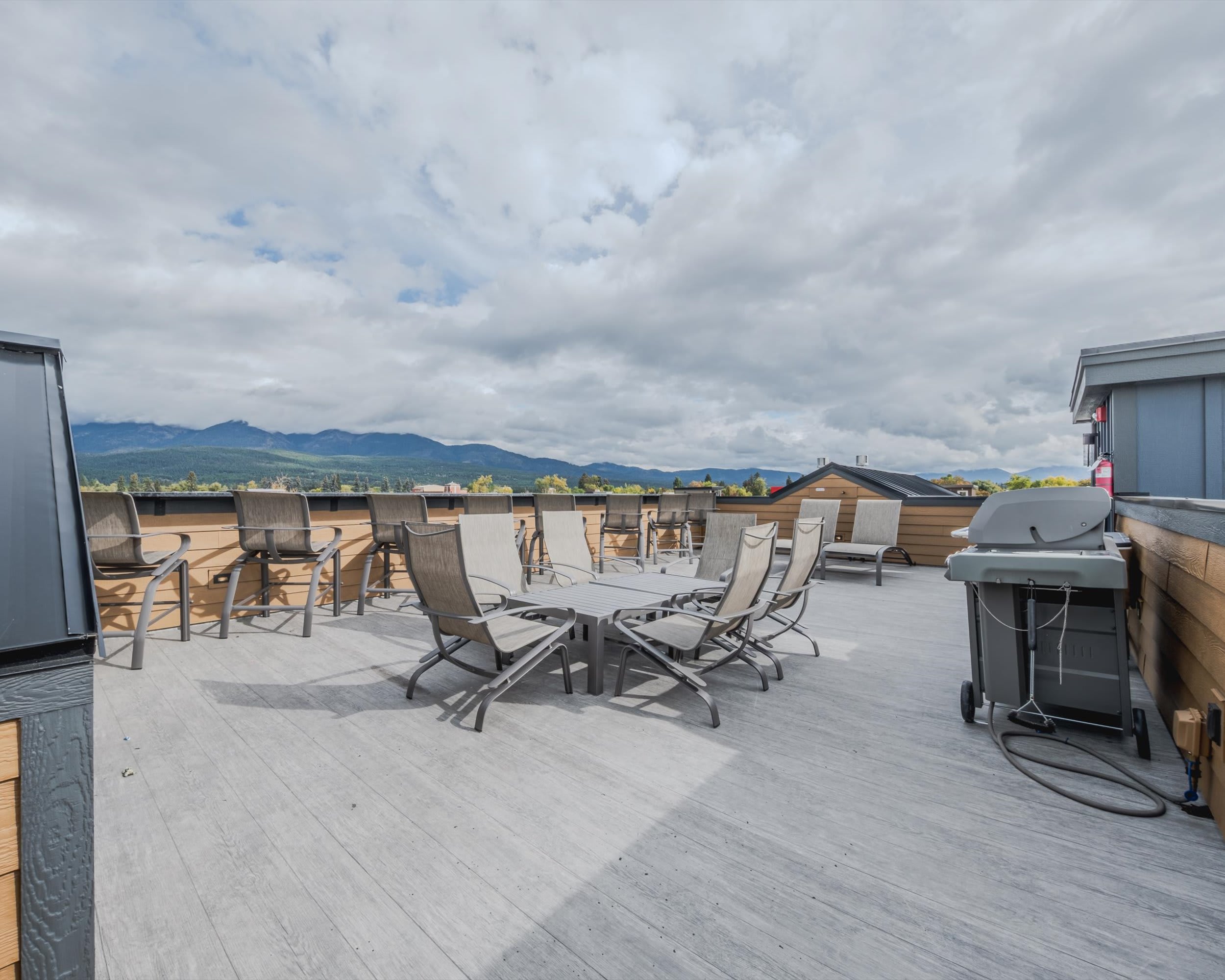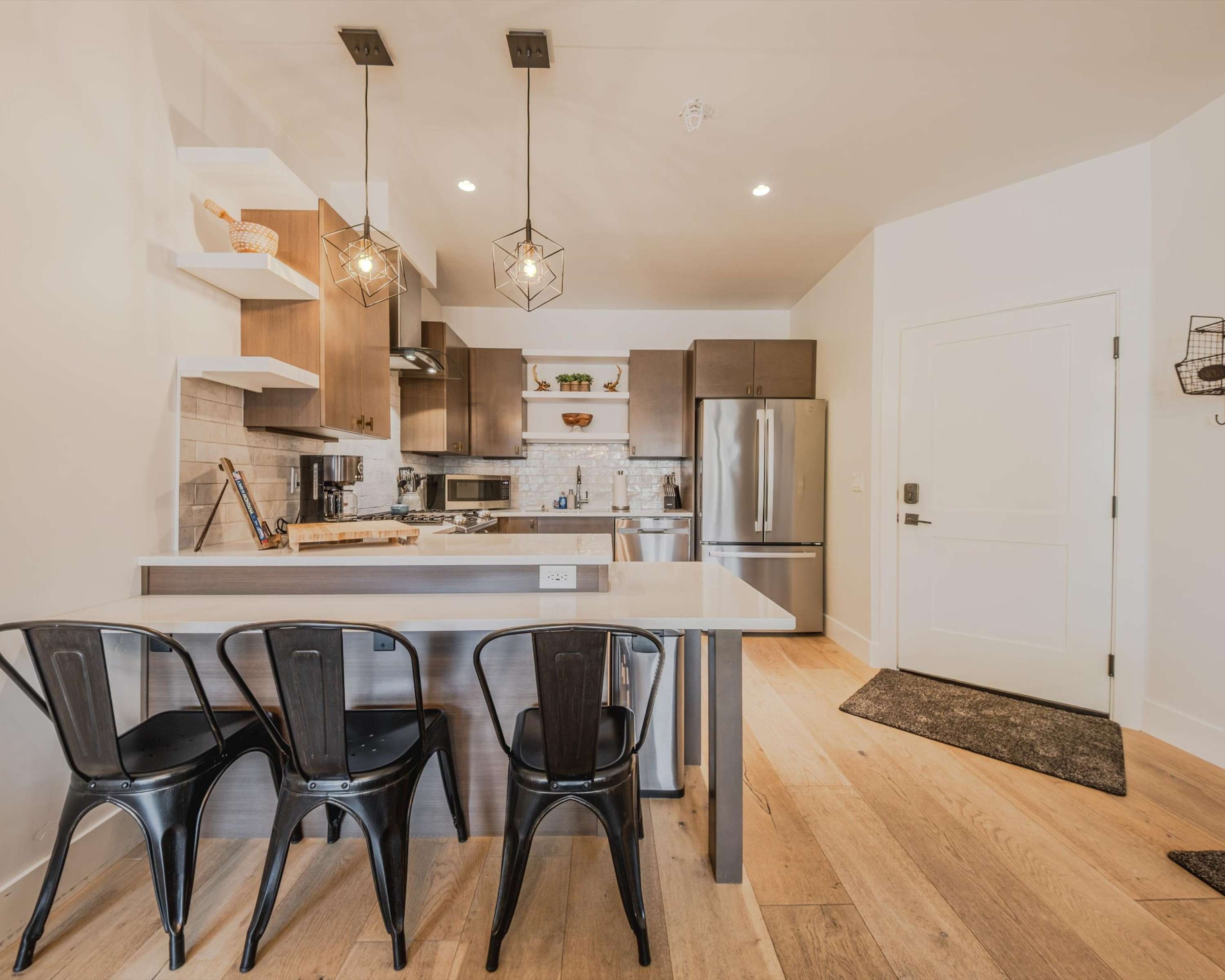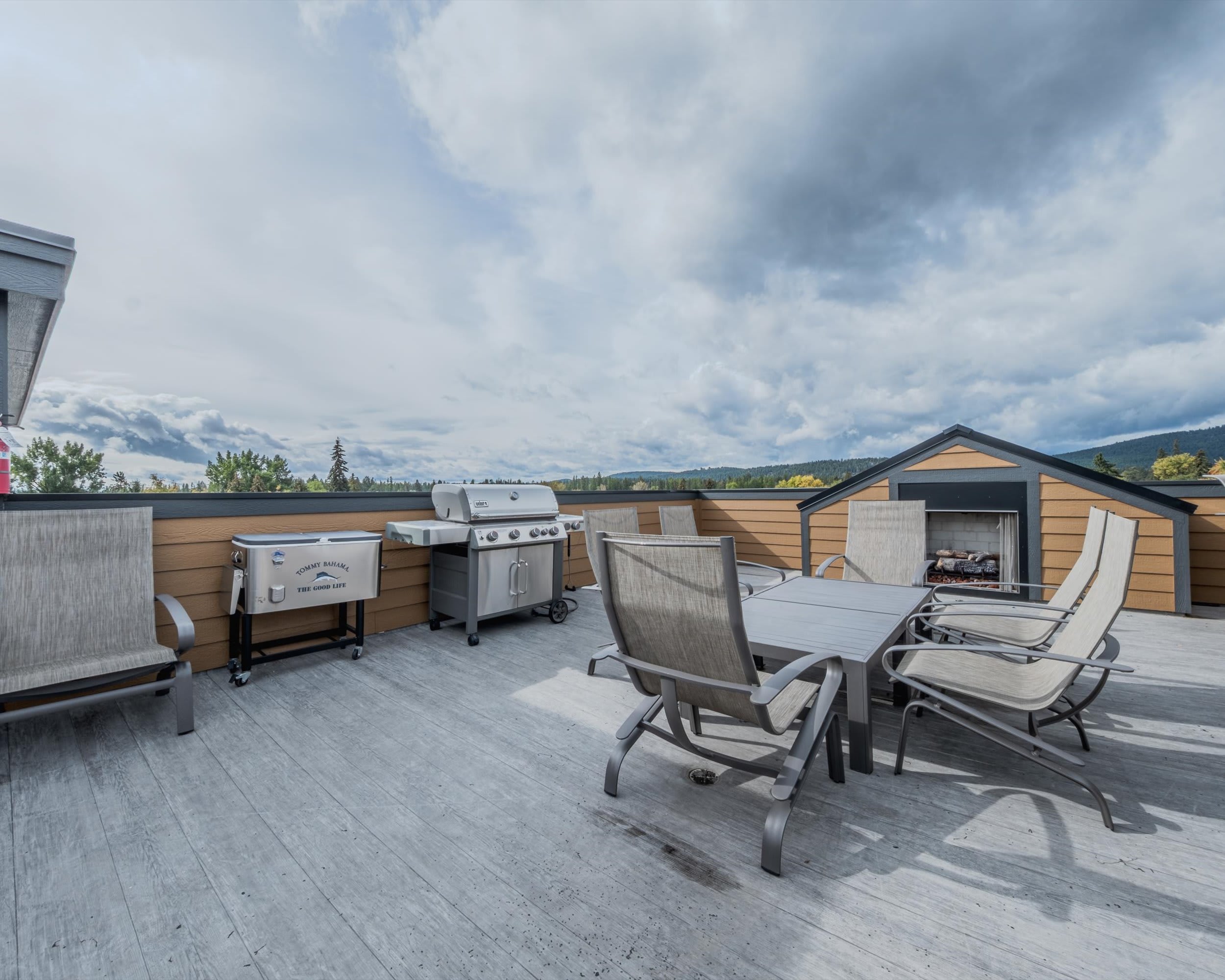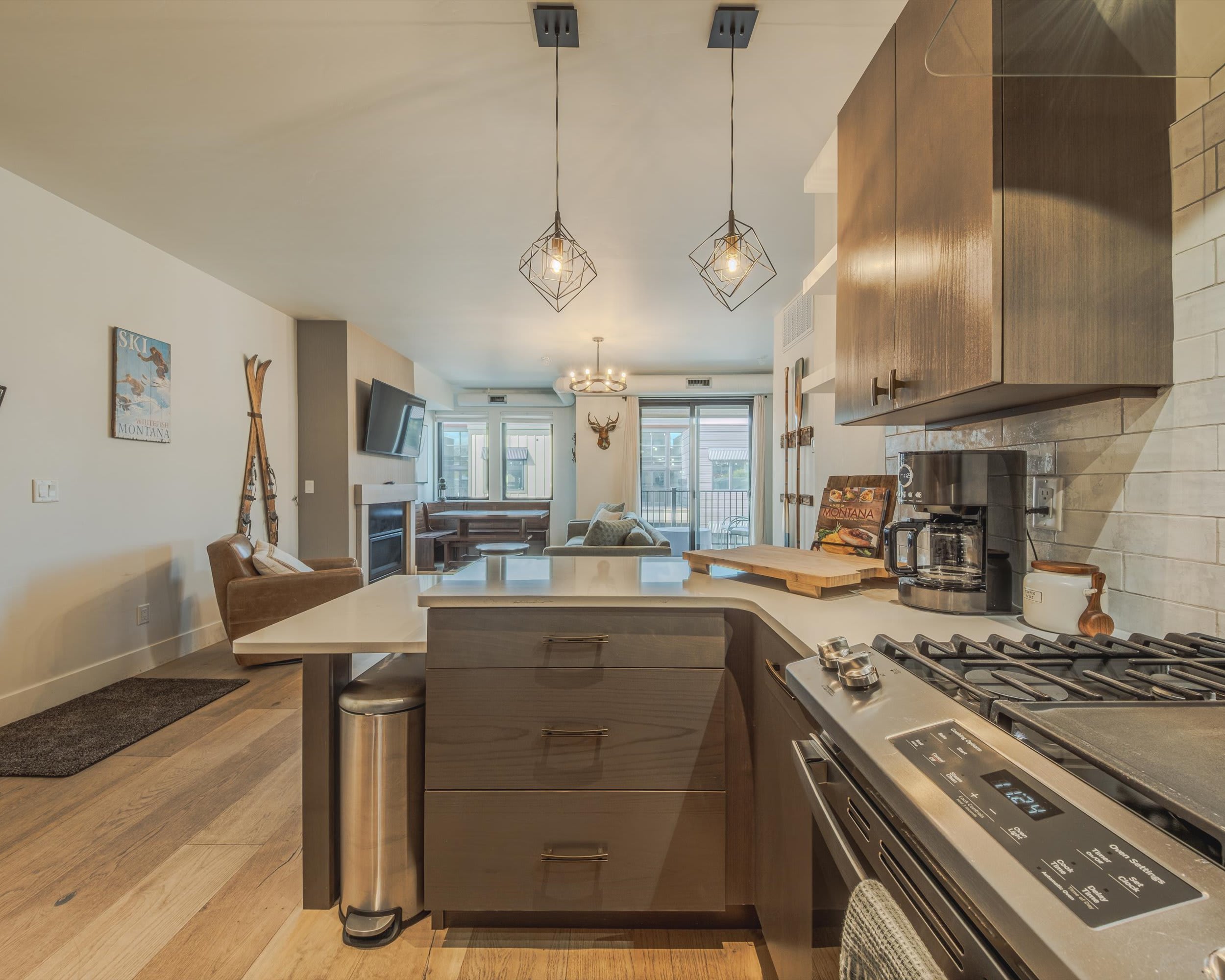 Inside, warmth and style welcome you from the moment you arrive. The living room invites you to unwind beside the fireplace, curl up on the couch or armchair, and enjoy a movie on the smart TV or a friendly round of board games. The modern kitchen, featuring stainless steel appliances and counter seating for two, opens to a cozy dining nook for six, perfect for lingering over home-cooked meals. Step out onto your private balcony to soak in serene views of Whitefish Mountain, or head to the shared rooftop patio to gather around the fire pit and take in panoramic vistas of Whitefish and Big Mountain. When night falls, retreat to the peaceful bedrooms, complete with room-darkening shades for a restful sleep after a day of adventure.