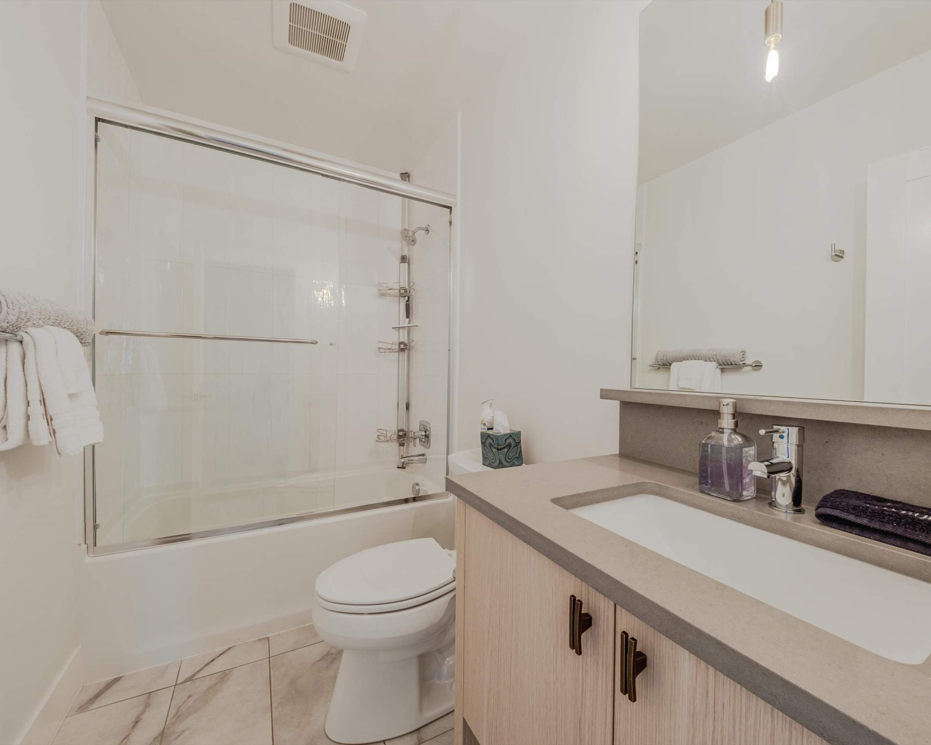 This home also includes a full guest bathroom with a single vanity and a shower/tub combo.