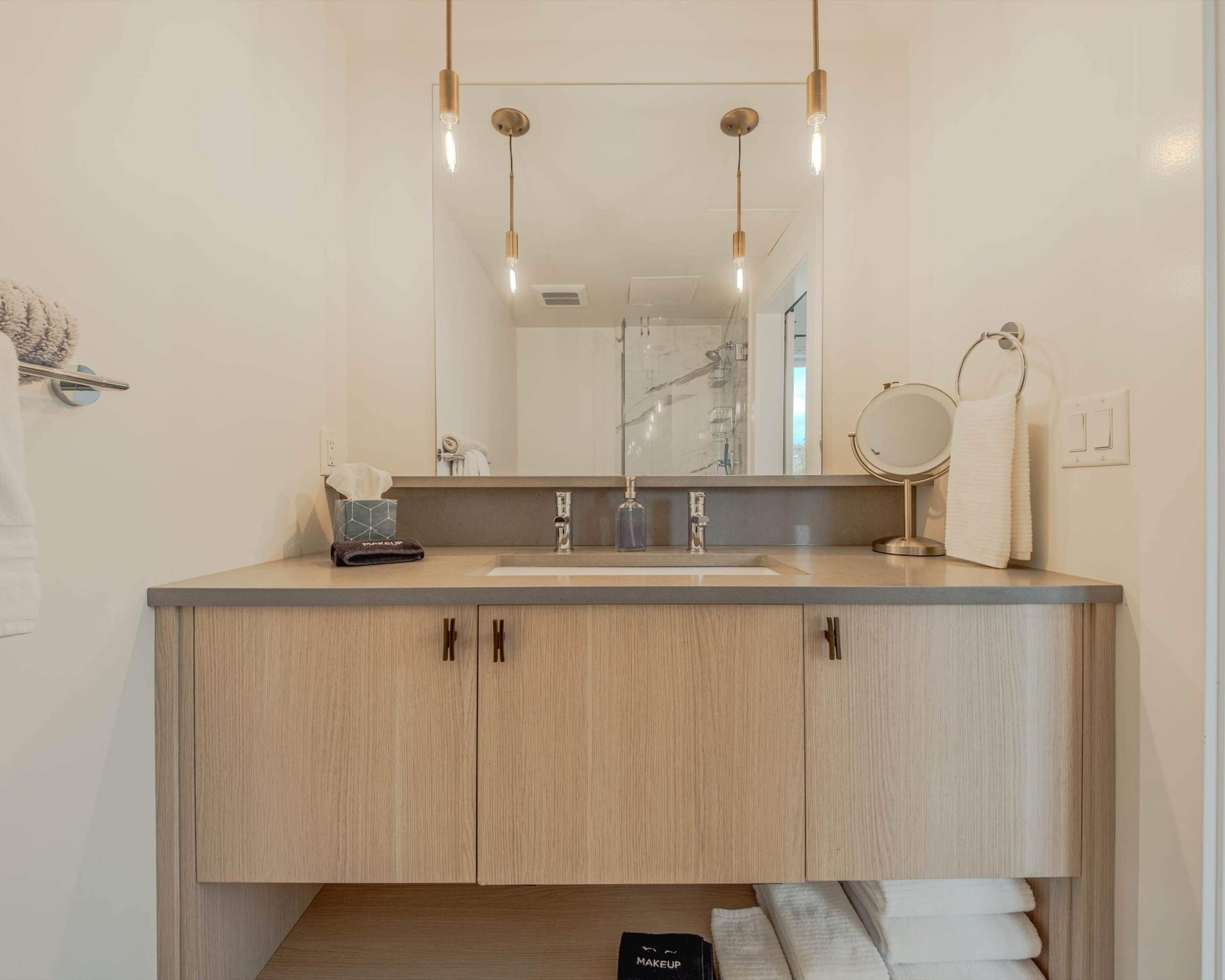 Bedroom #1 includes a queen size bed and an ensuite bathroom with a single vanity and a walk-in shower.