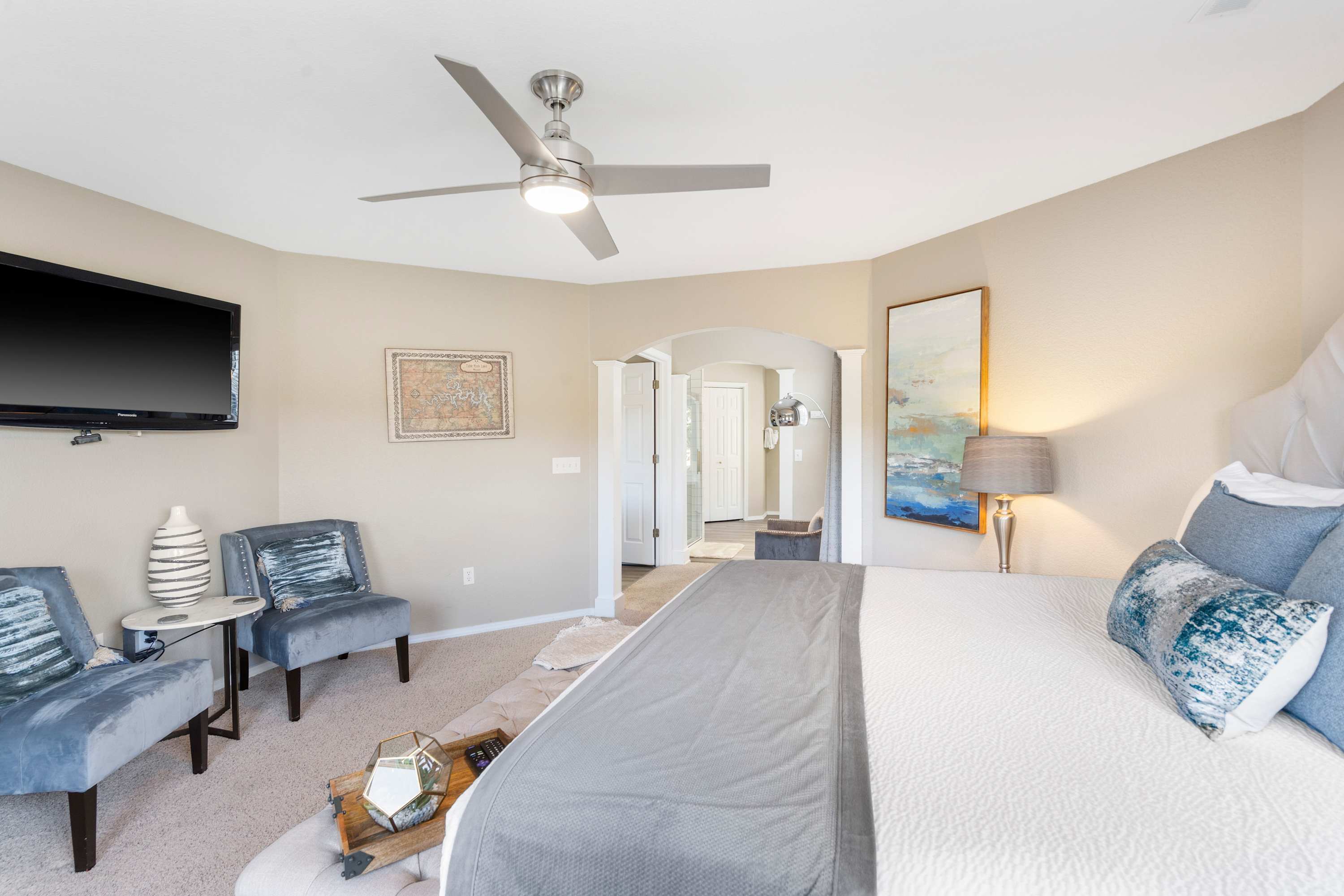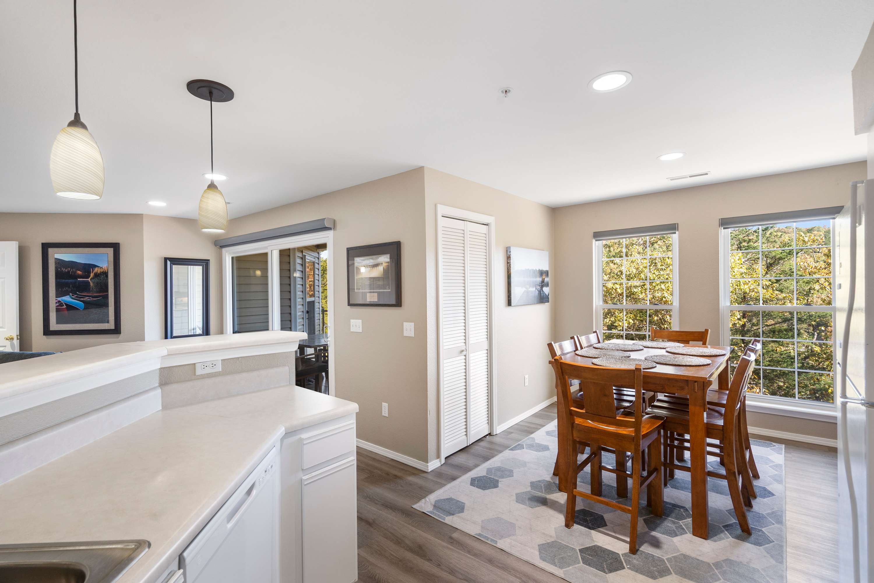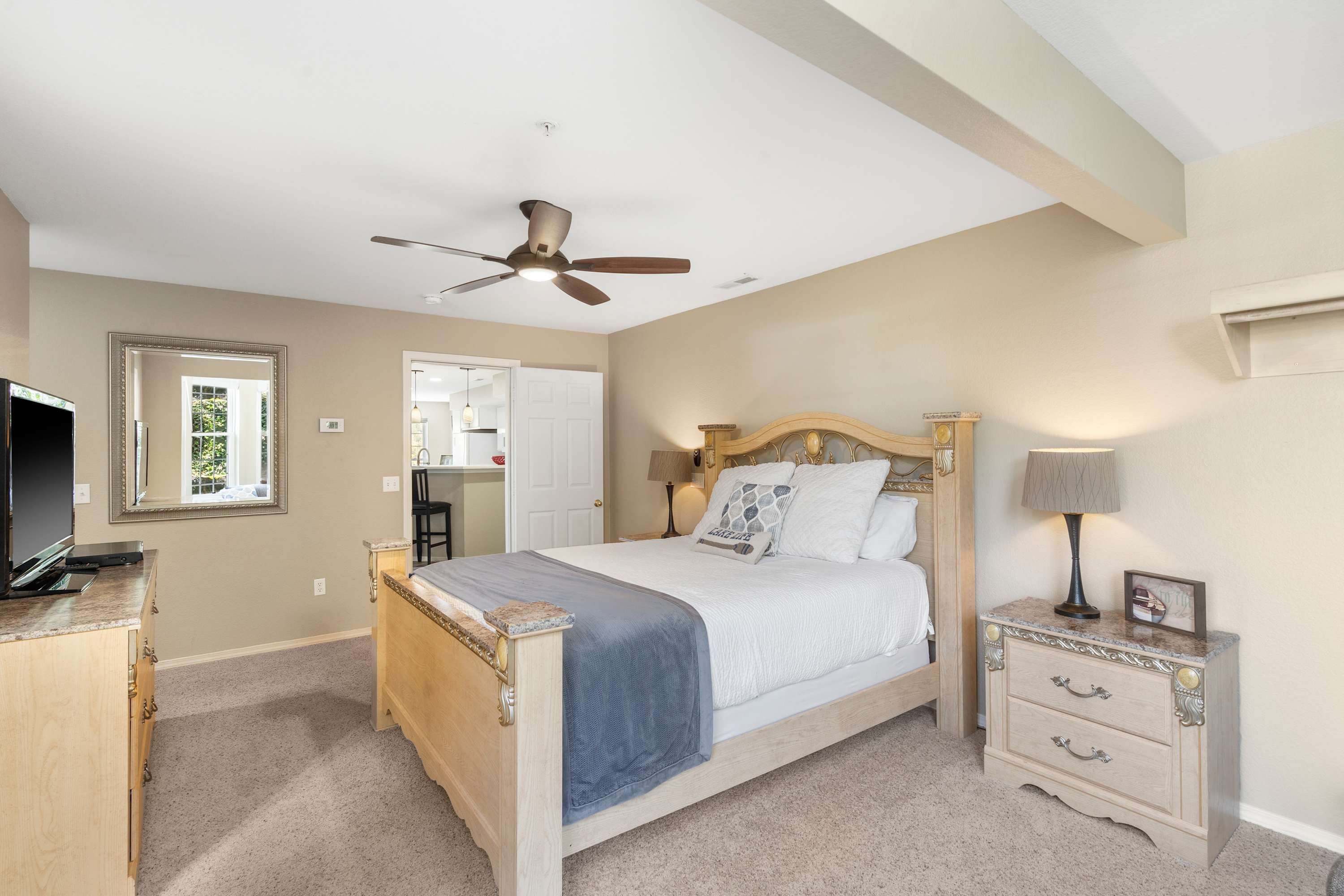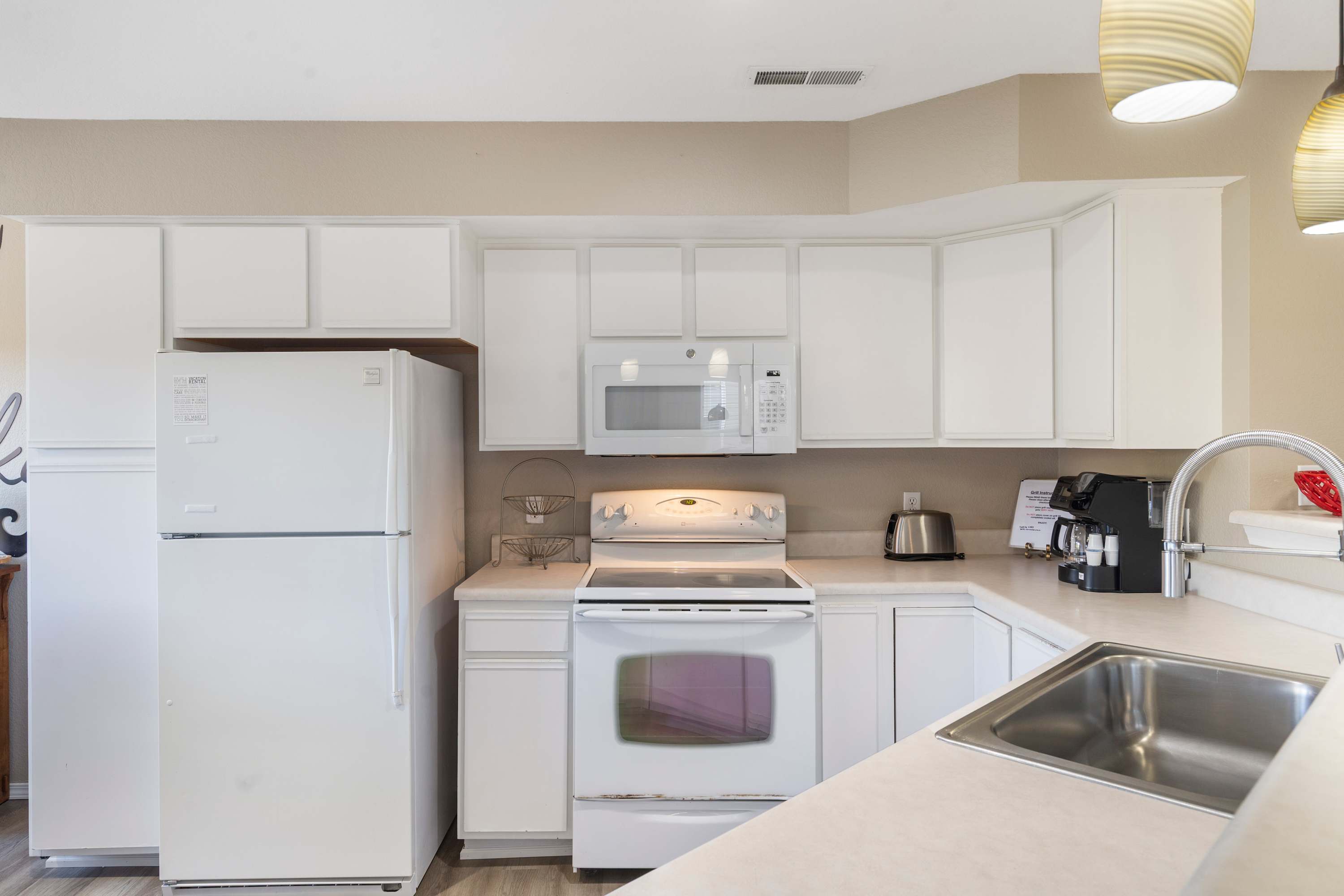 Step inside and feel how the natural light fills the open living space. The living room invites you to settle in on the wraparound couch, queue up a movie on the smart TV, and simply relax. The kitchen is fully equipped for effortless meals, with drip and Keurig coffee options to start your mornings and counter seating for four for casual conversations while cooking. When it’s time to gather, the dining table for six sets the scene for family meals and late-night card games.