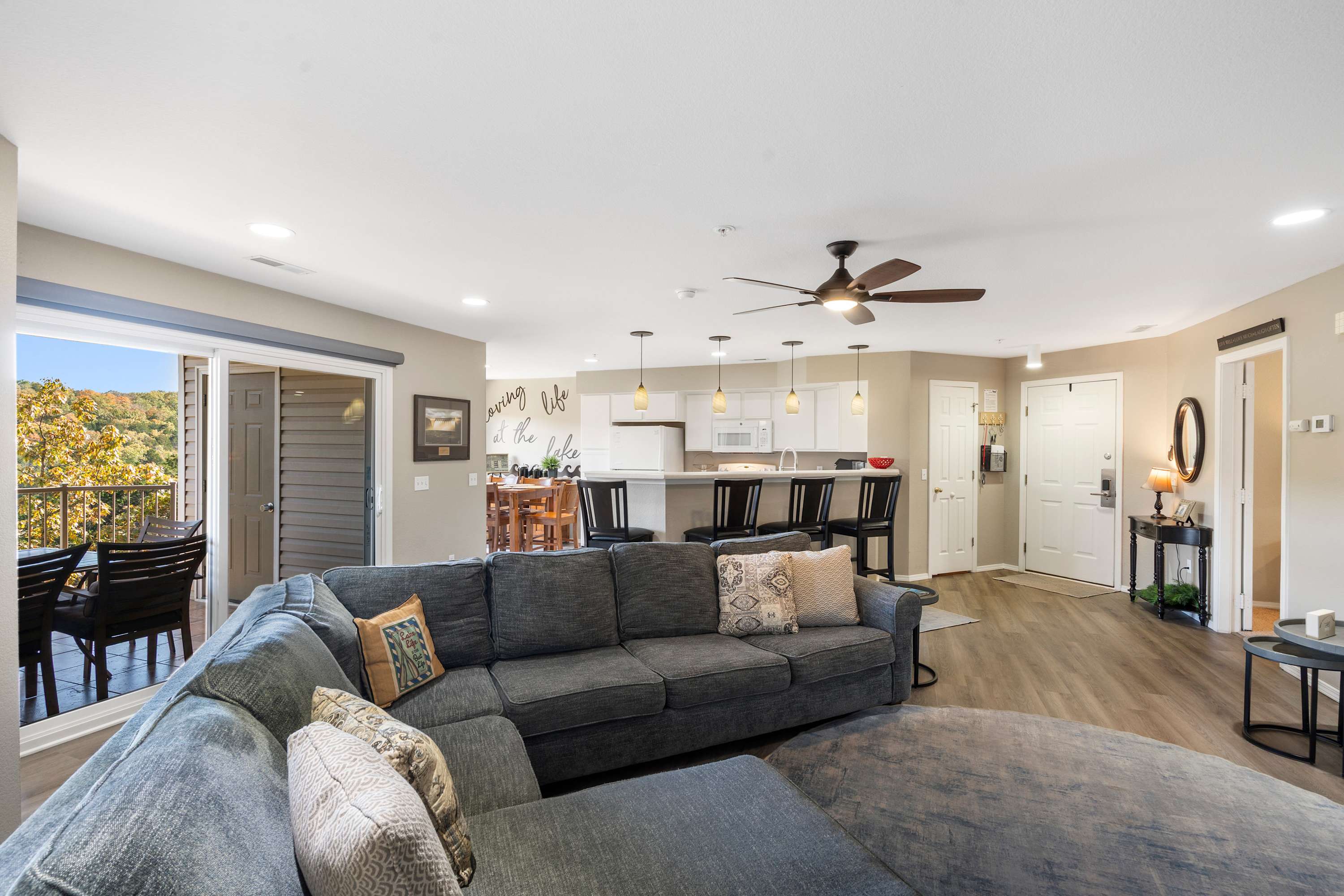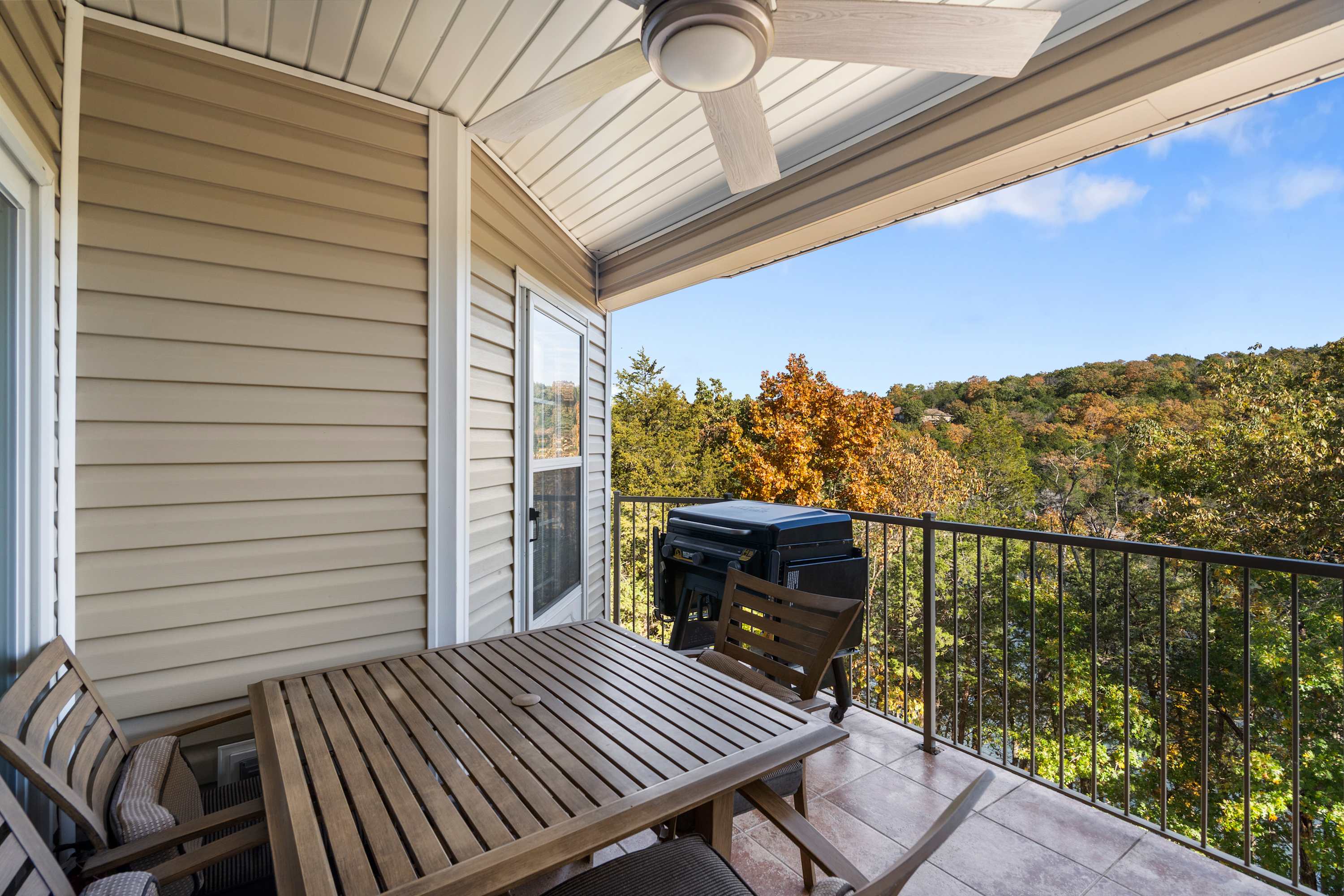 Slide open the door to the private balcony, where the tree-lined shoreline paints a calming backdrop. Here, you’ll find a grill and table for four—perfect for slow breakfasts in the fresh air or dinner as the sky softens toward dusk. Whether you’re here to explore, recharge, or simply watch the lake breathe in and out, this Rocky Shores retreat makes it easy to settle into vacation mode.