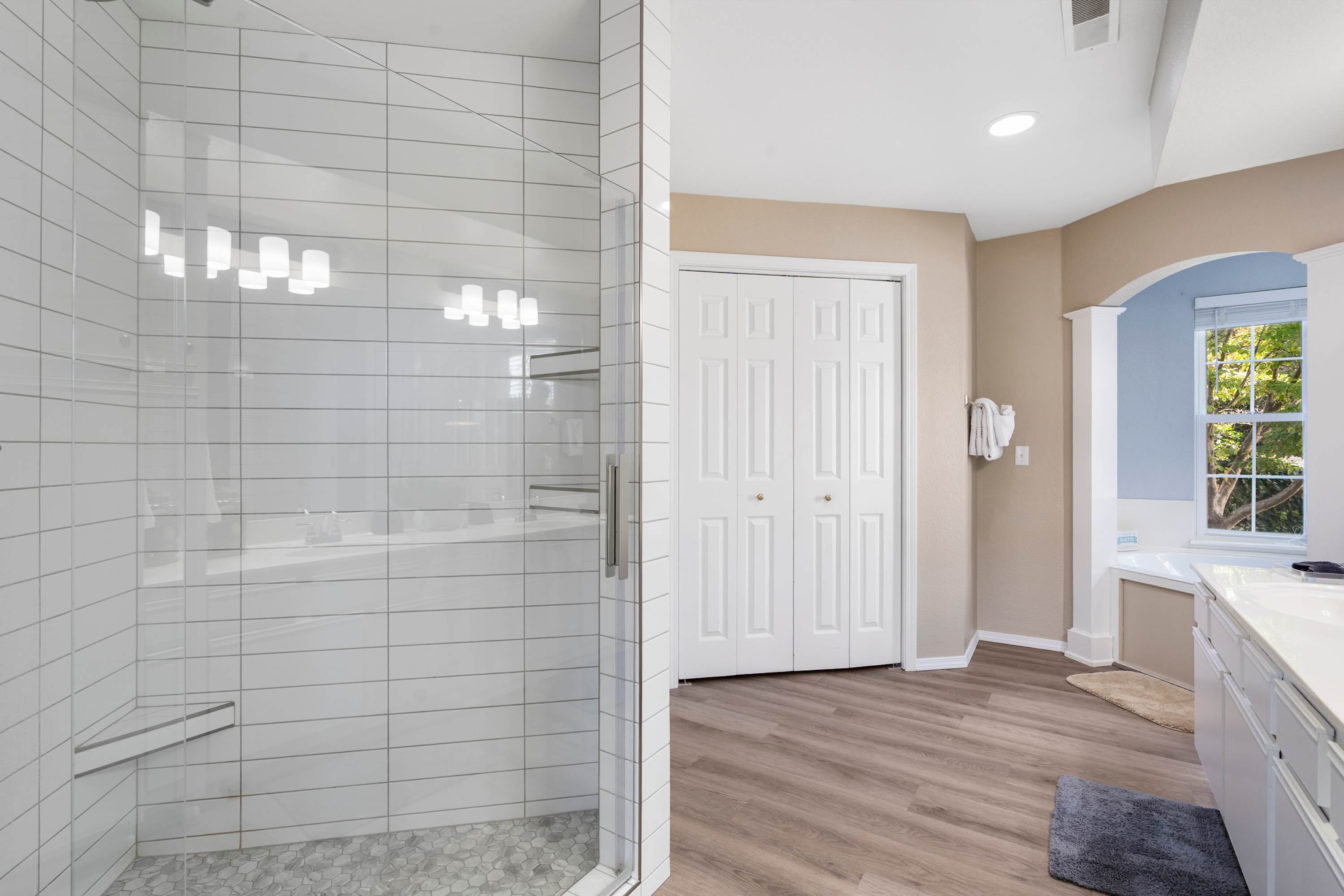 Bedroom #2 includes a king-size bed, 50" Smart TV, deck access, and an ensuite bathroom with a dual vanity, a soaking tub, and a walk-in shower.