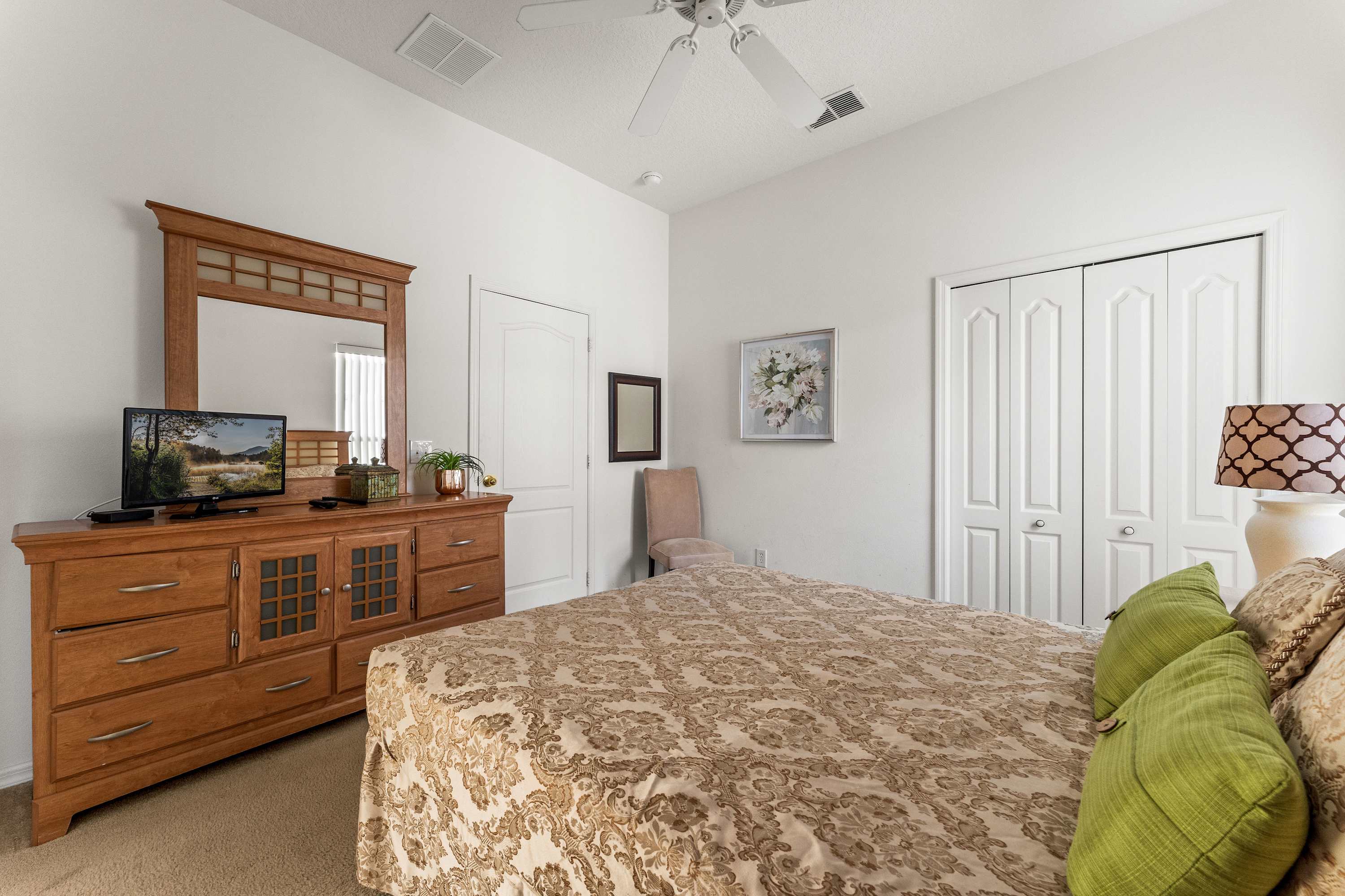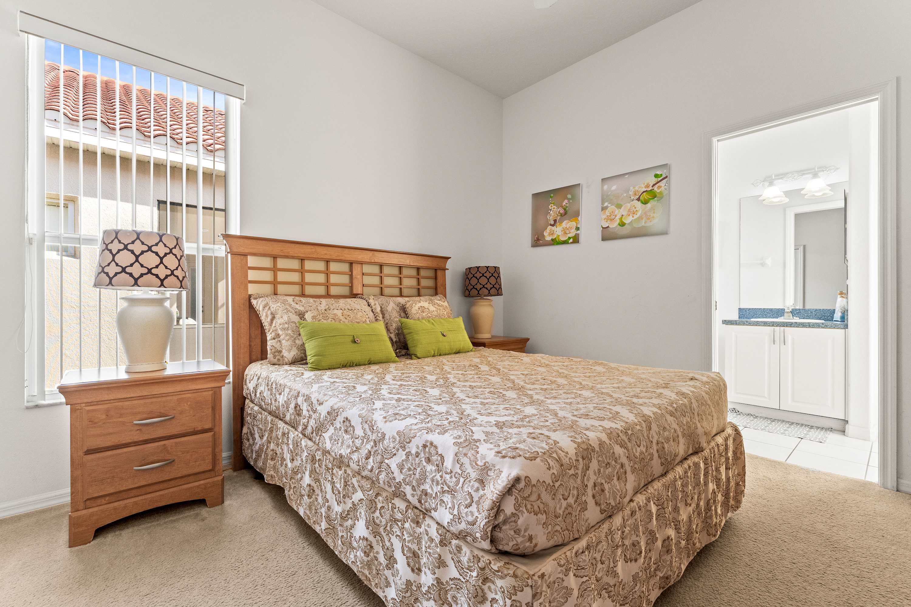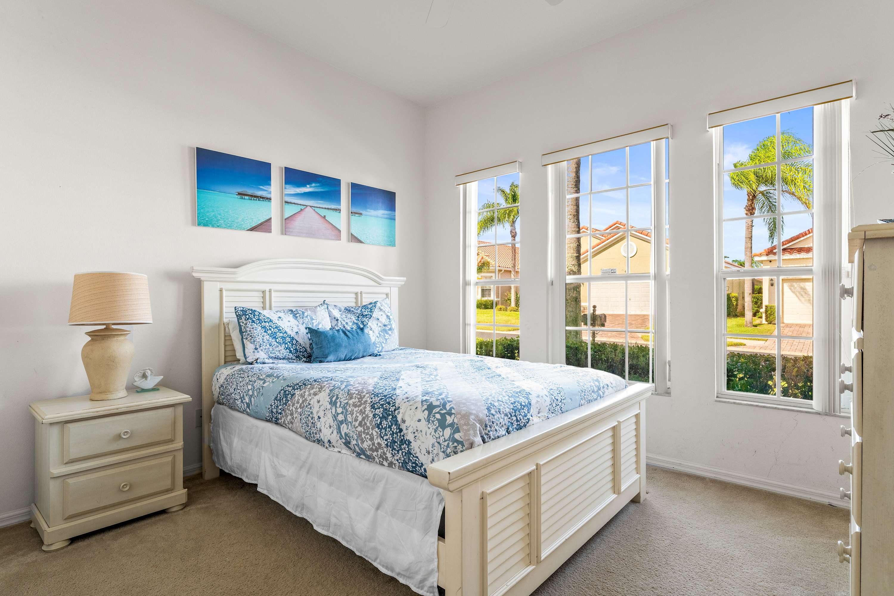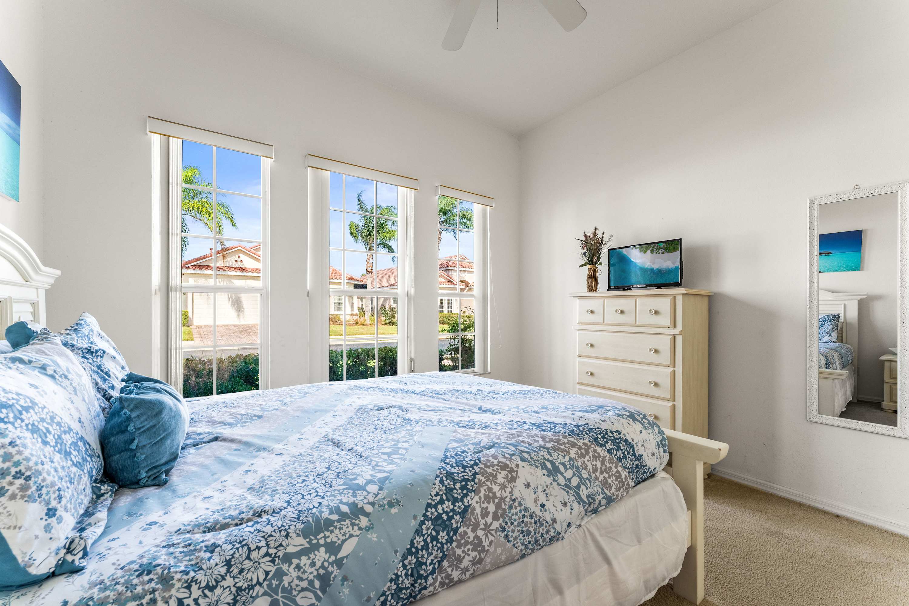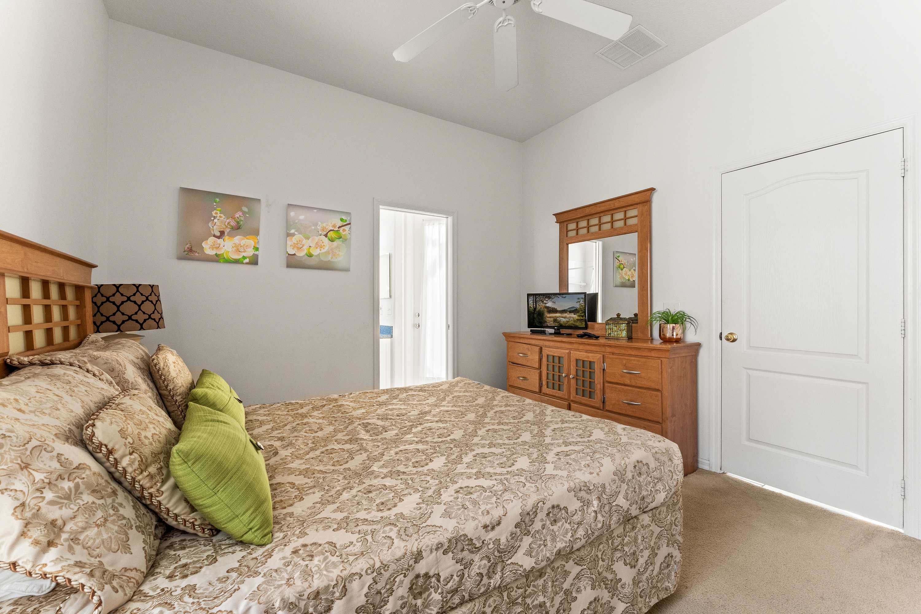 Bedroom #3 includes a queen size bed, a cable TV, patio access, and an ensuite bathroom with a single vanity and a shower/tub combo.