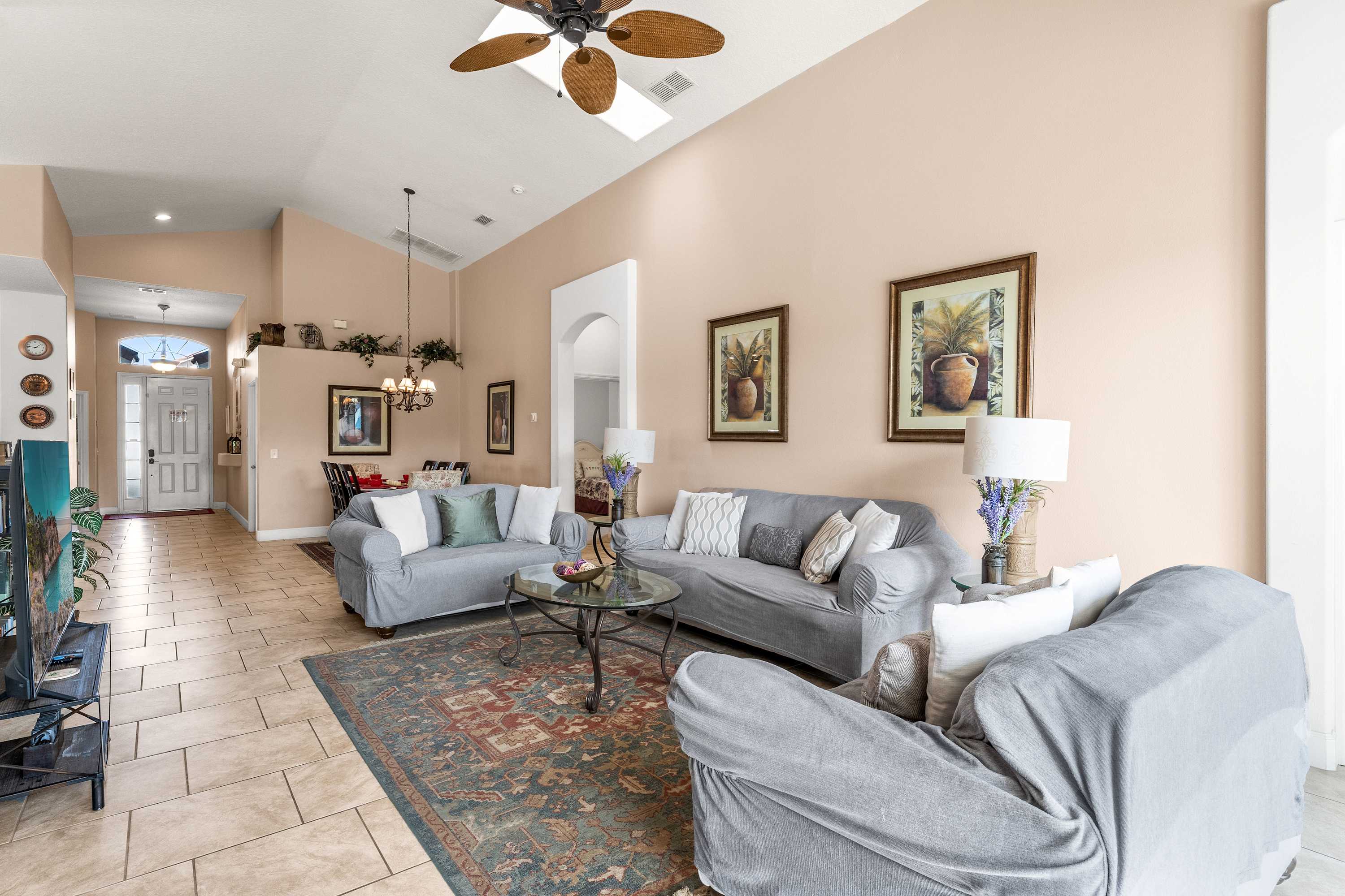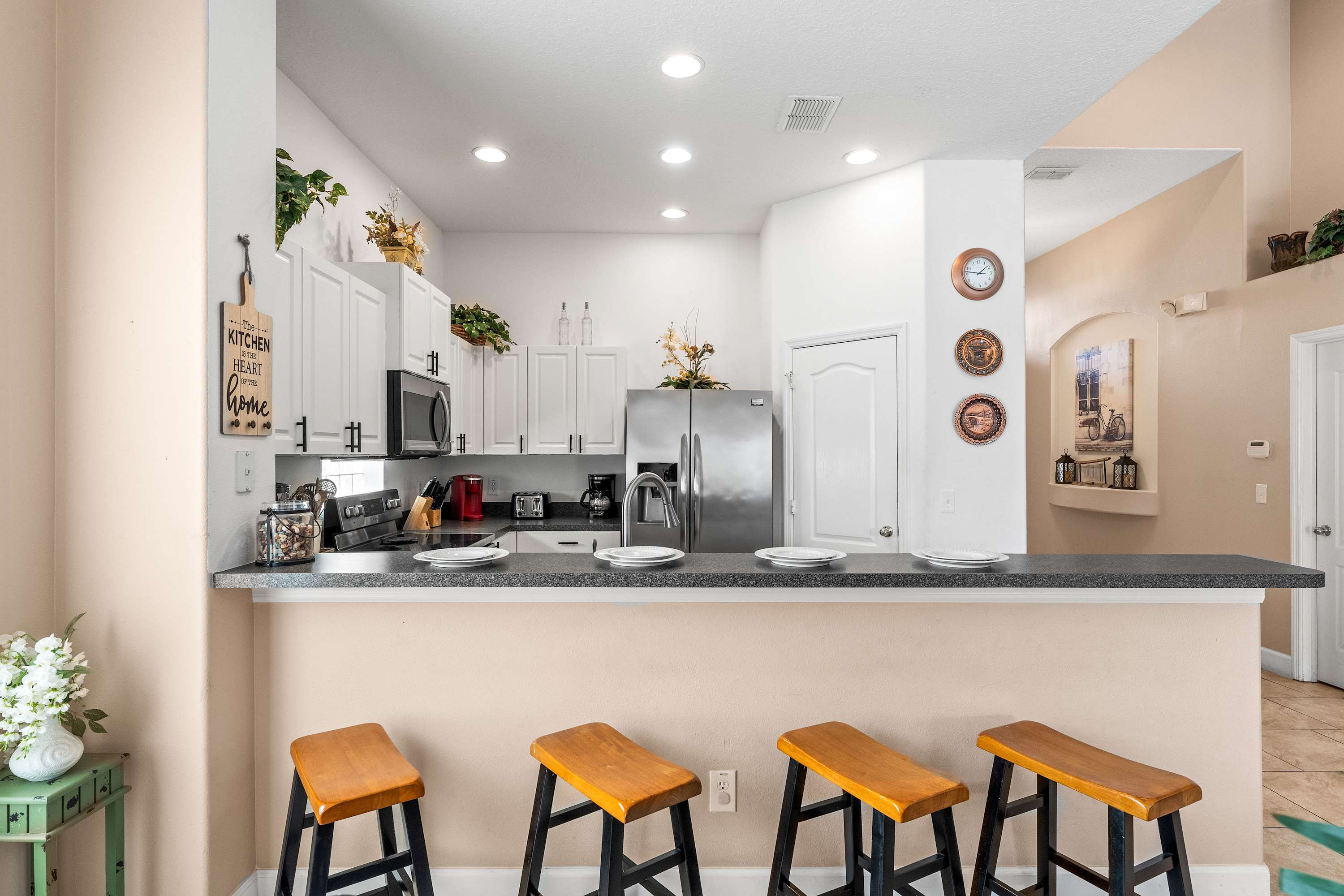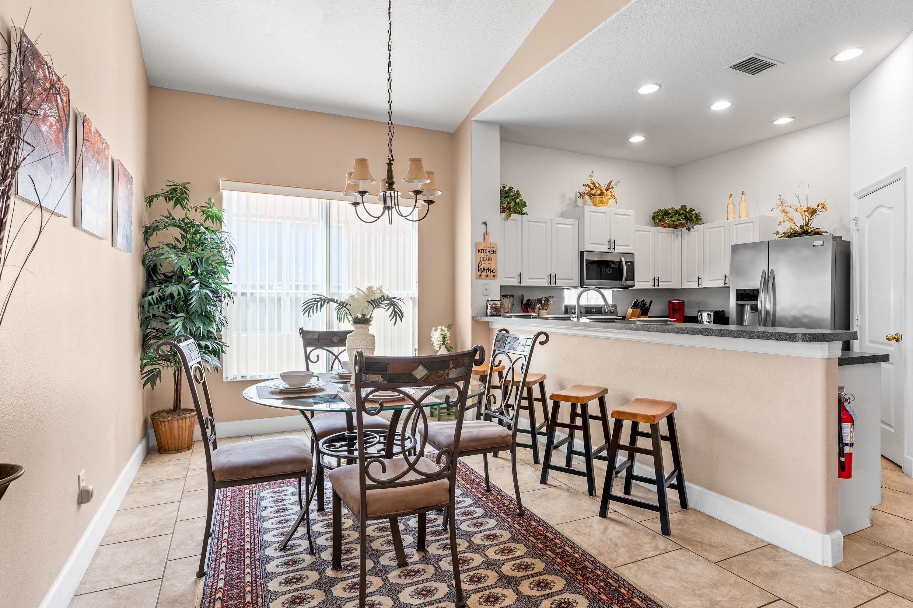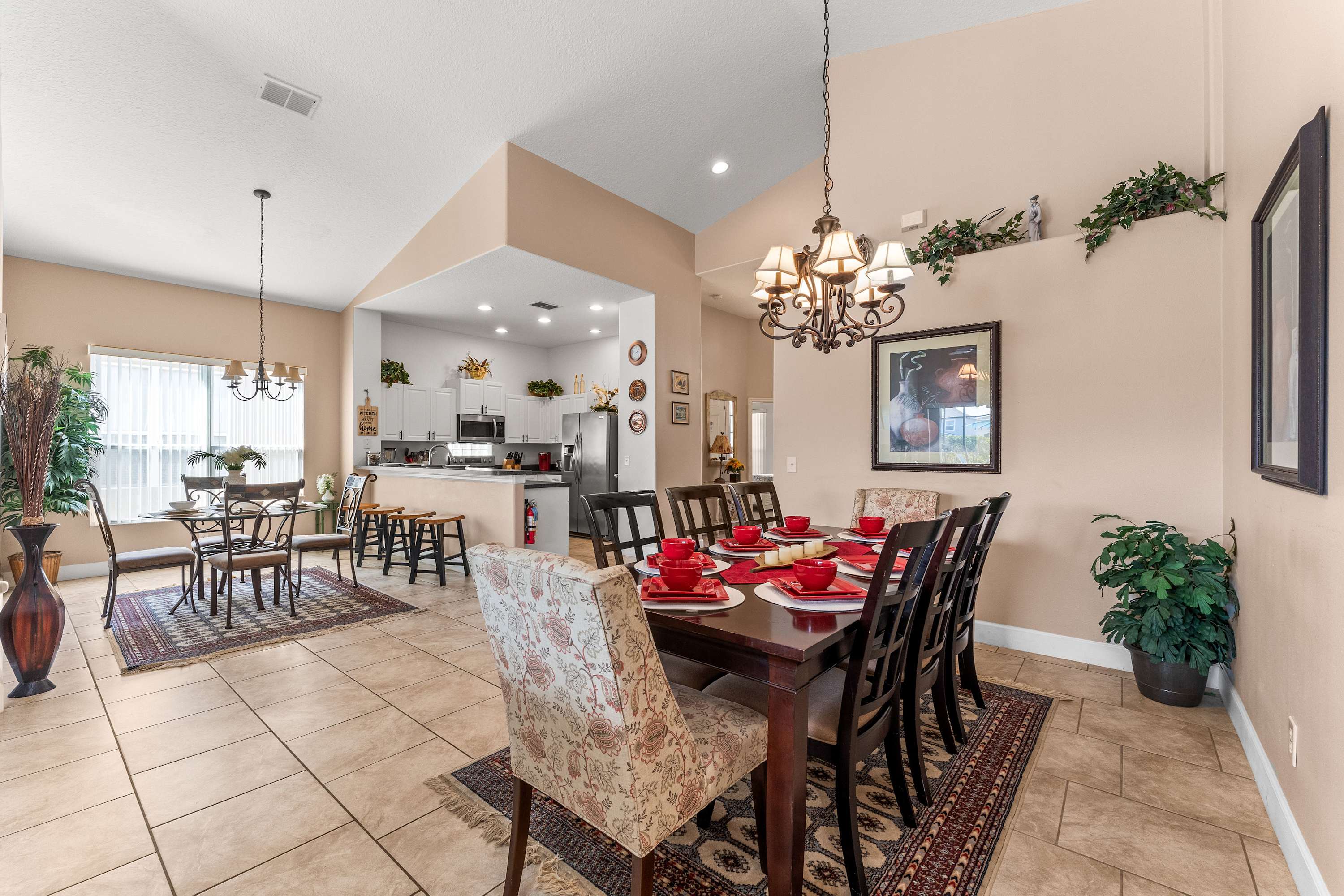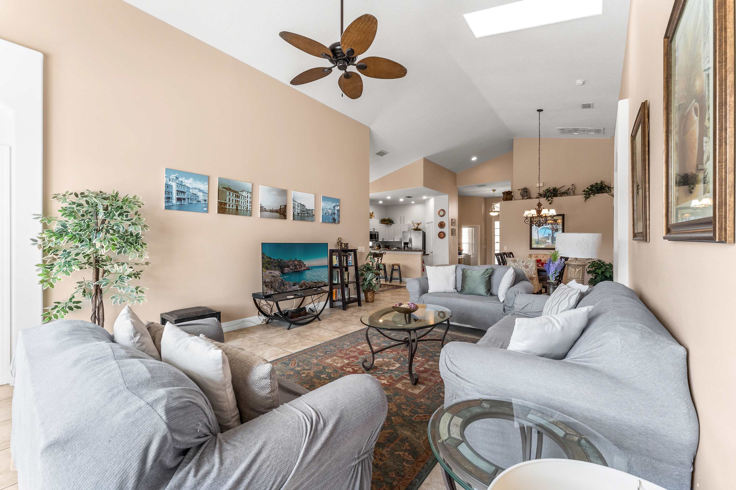 Step inside and let the airy elegance of this home welcome you. The living room opens up beneath cathedral ceilings with a skylight, filling the space with natural light. Two cozy love seats invite you to unwind in front of the smart TV, while tasteful Venetian décor and pottery accents create a warm, sophisticated feel. The fully equipped kitchen features white cabinetry, black and grey granite-style countertops, and stainless steel appliances, along with both drip and on-demand coffee makers to start your mornings right. Enjoy casual meals in the sunny kitchen nook for four, or gather around the dining table for eight for family dinners and celebrations.
