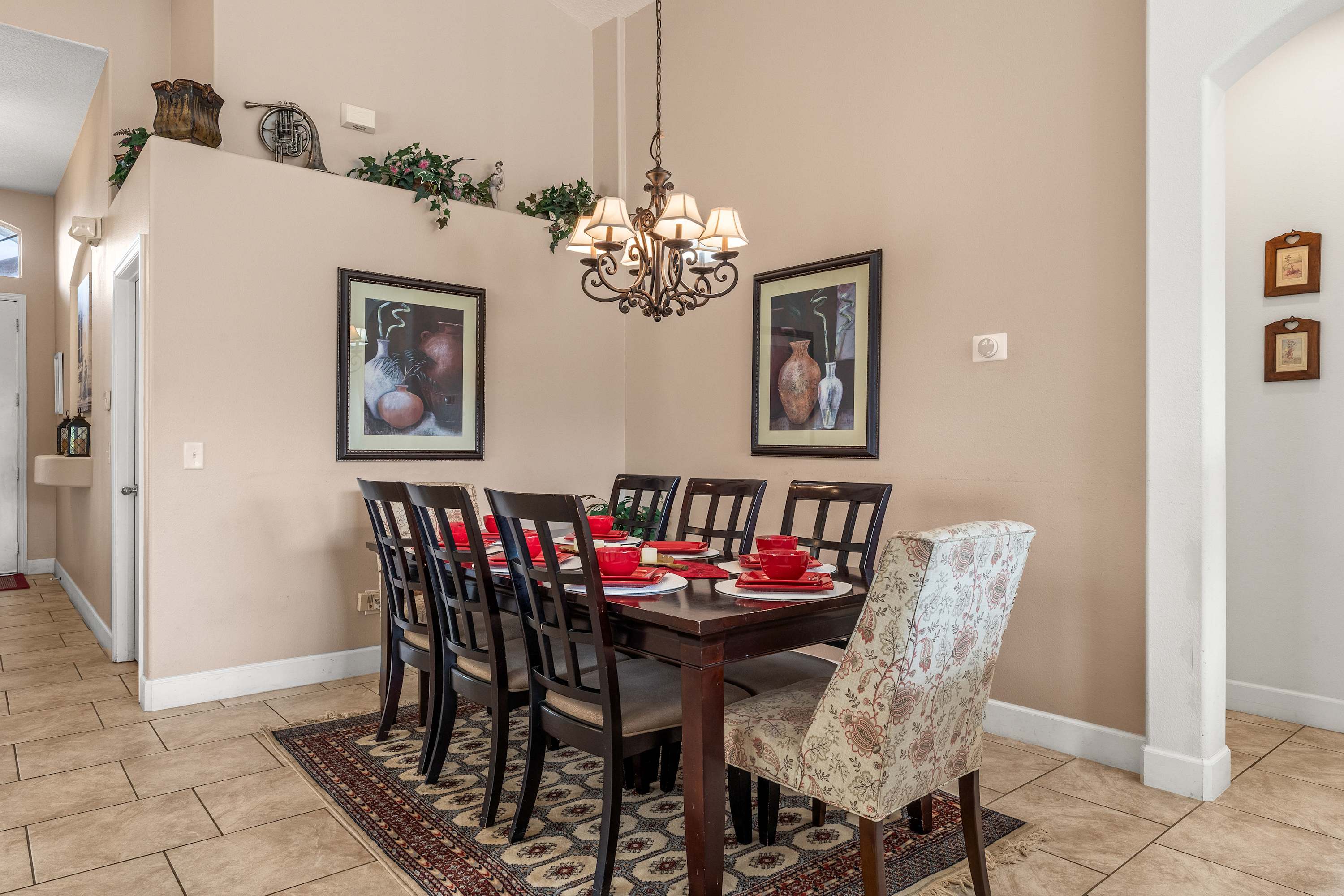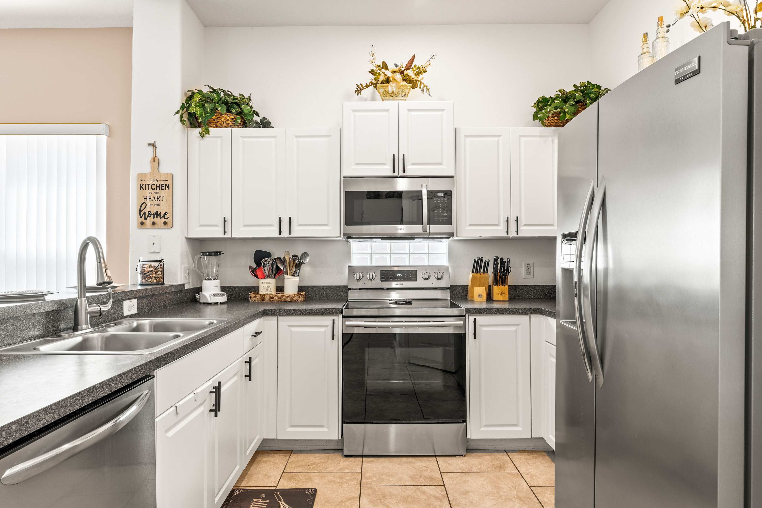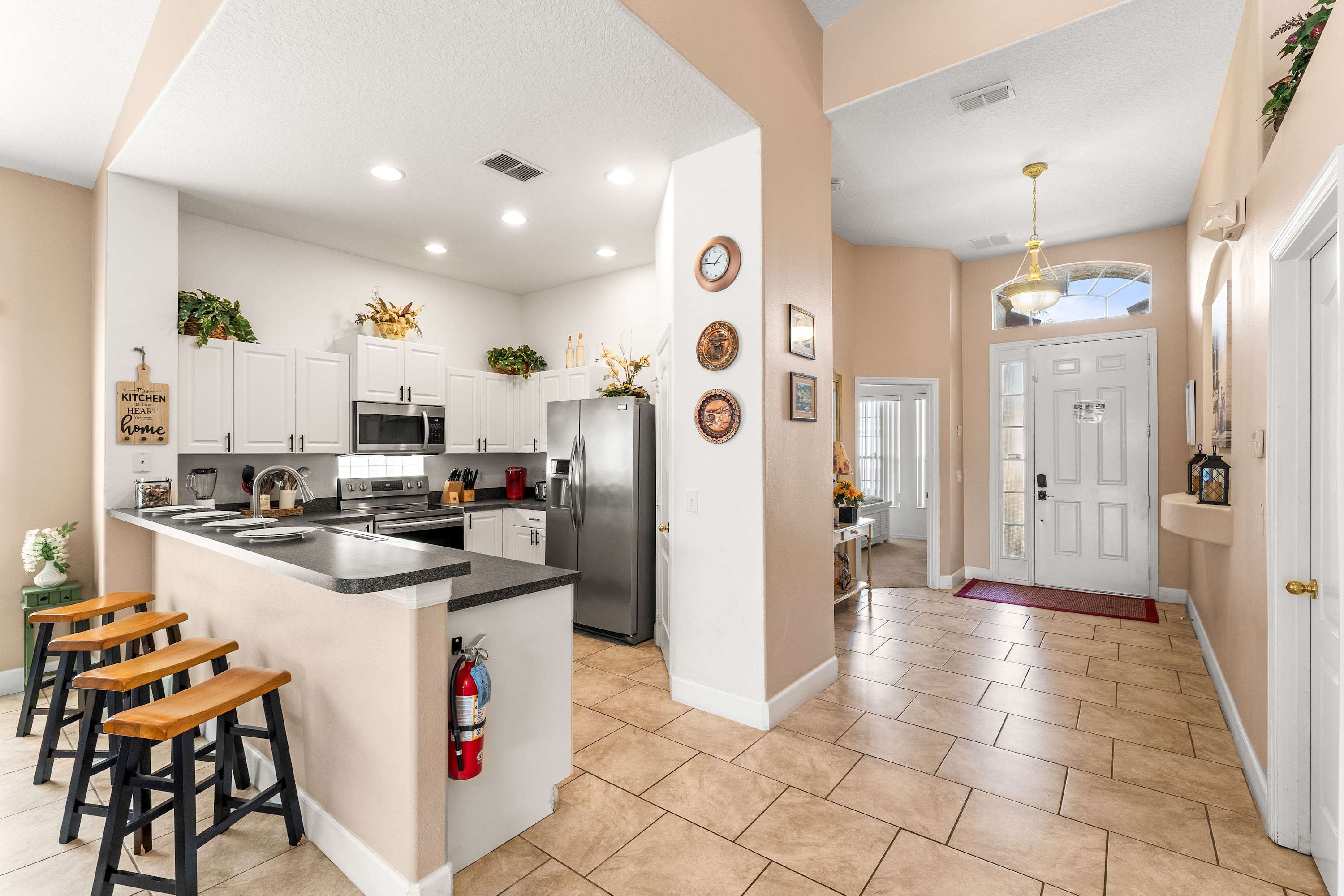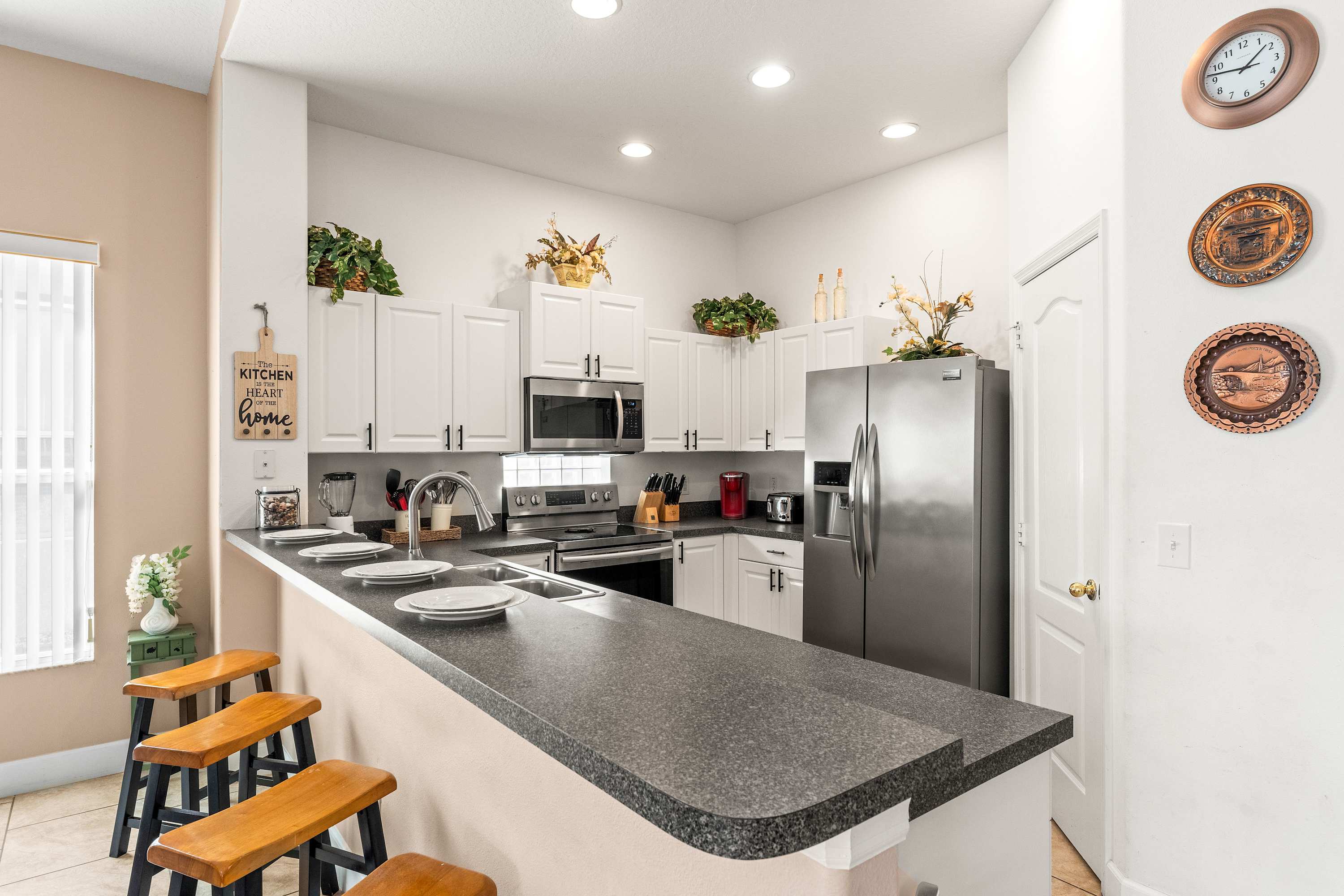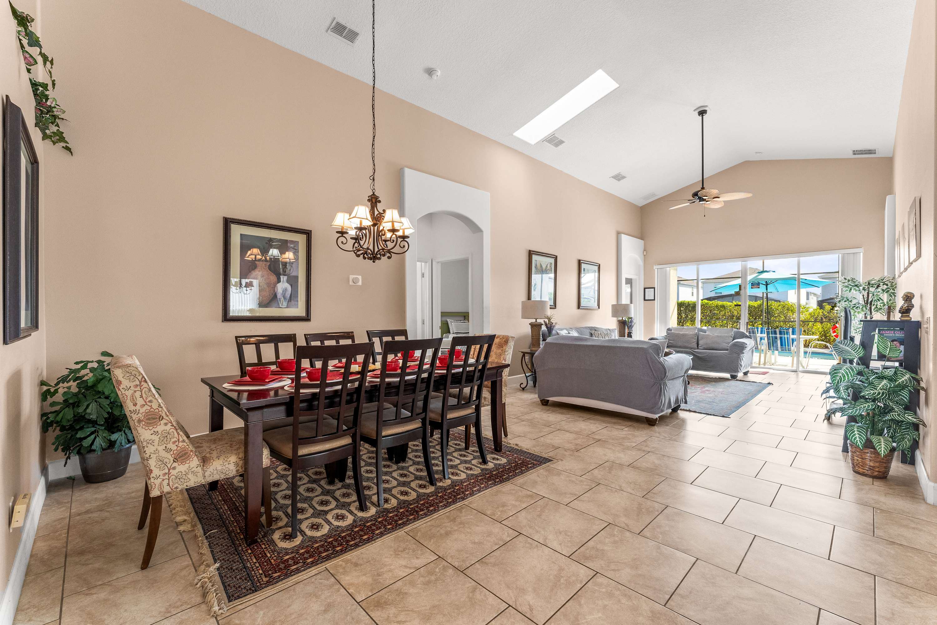 Step inside and let the airy elegance of this home welcome you. The living room opens up beneath cathedral ceilings with a skylight, filling the space with natural light. Two cozy love seats invite you to unwind in front of the smart TV, while tasteful Venetian décor and pottery accents create a warm, sophisticated feel. The fully equipped kitchen features white cabinetry, black and grey granite-style countertops, and stainless steel appliances, along with both drip and on-demand coffee makers to start your mornings right. Enjoy casual meals in the sunny kitchen nook for four, or gather around the dining table for eight for family dinners and celebrations.
