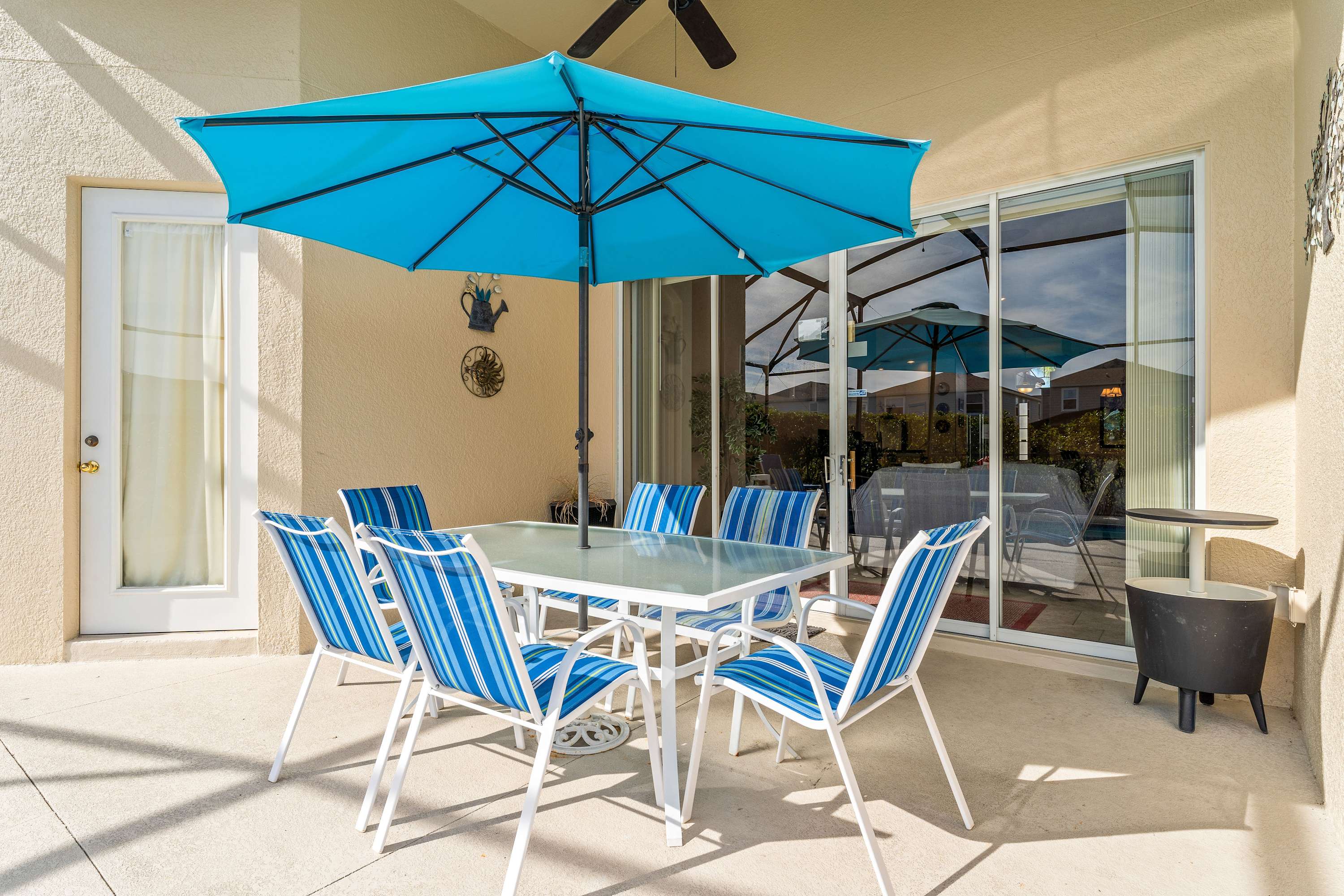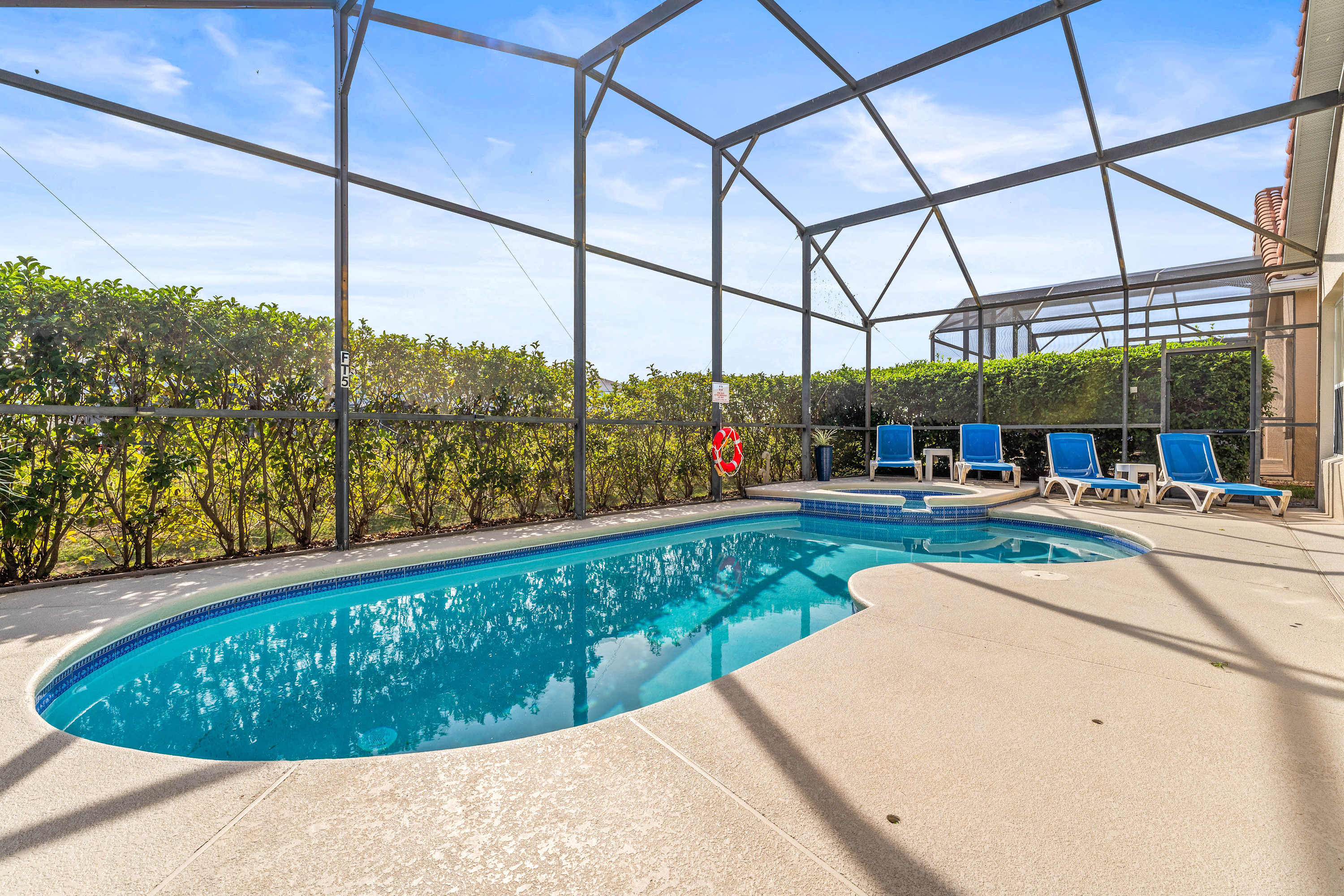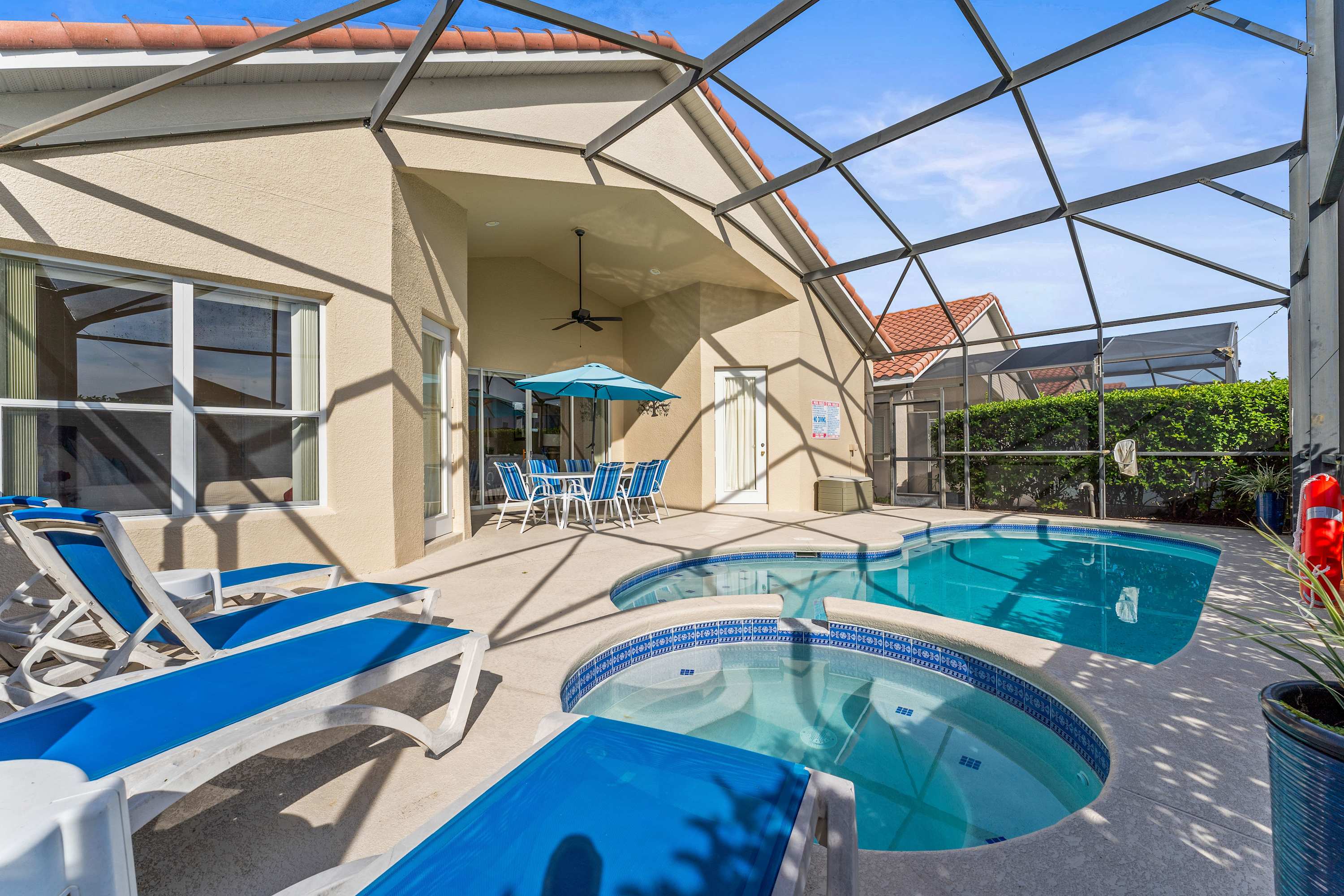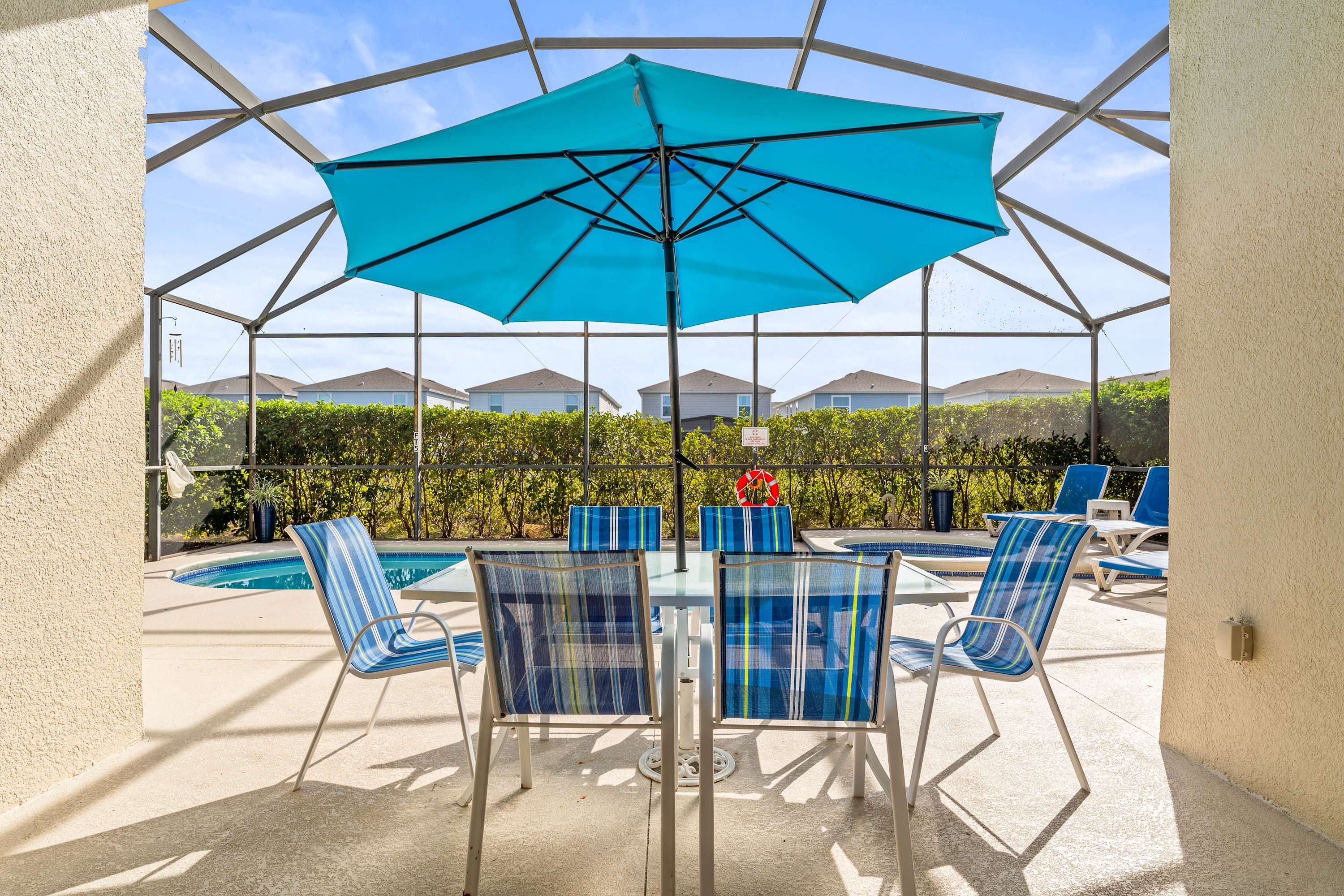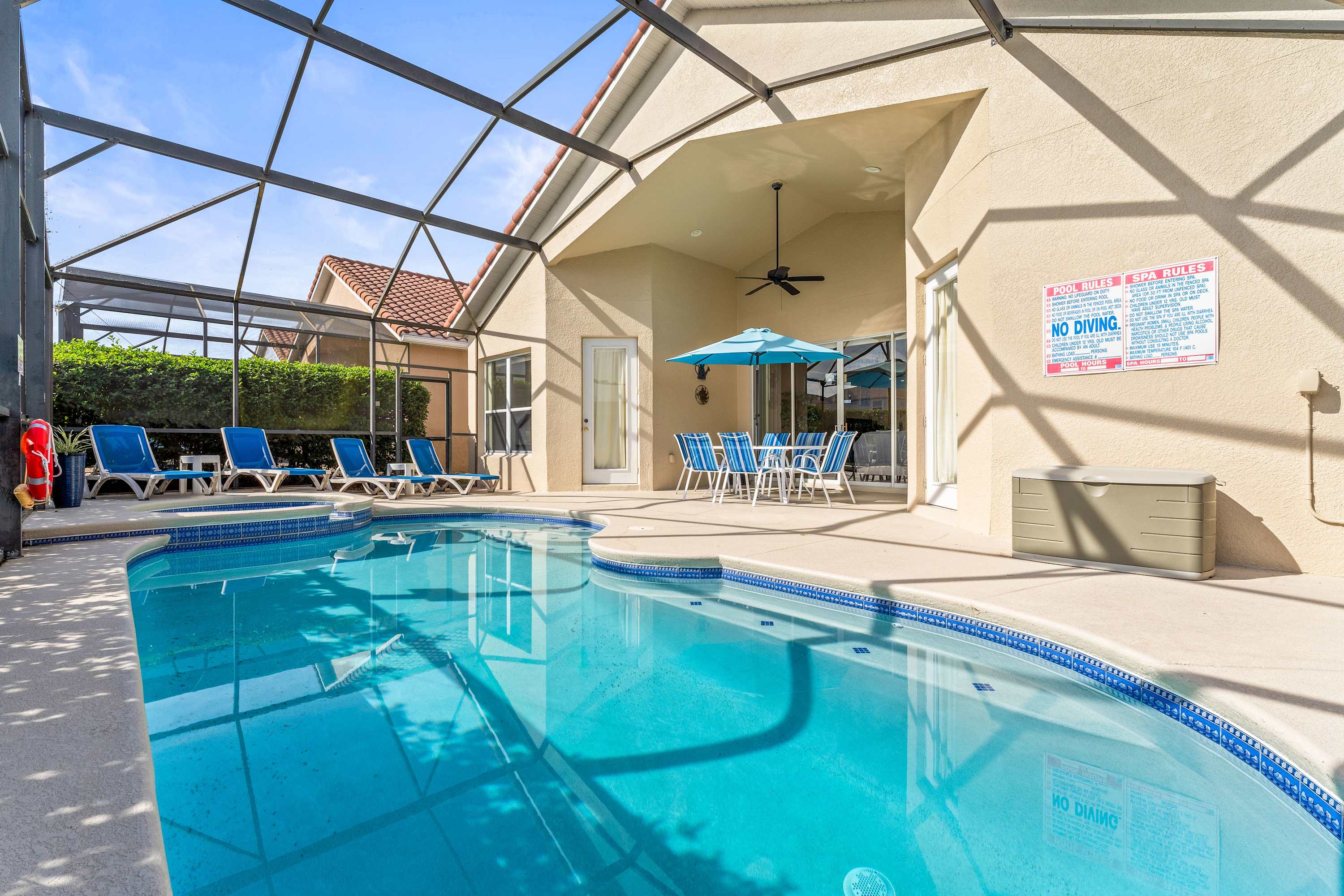 Through sliding glass doors, the patio awaits—complete with a private pool, hot tub, table for six, and comfortable lounge seating perfect for soaking up the Florida sun. For extra fun, the garage doubles as a game room, featuring air hockey, pool, and foosball tables, plus a TV with PS2, cable and a hightop table for two. Every detail has been designed to help you relax, play, and make unforgettable memories in comfort and style.