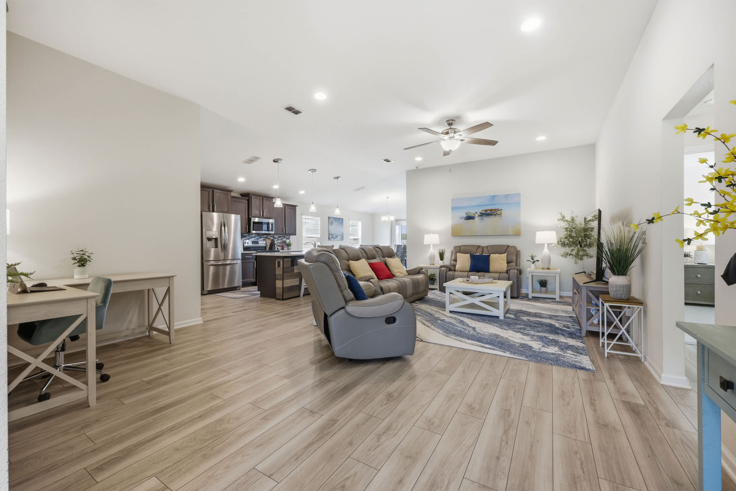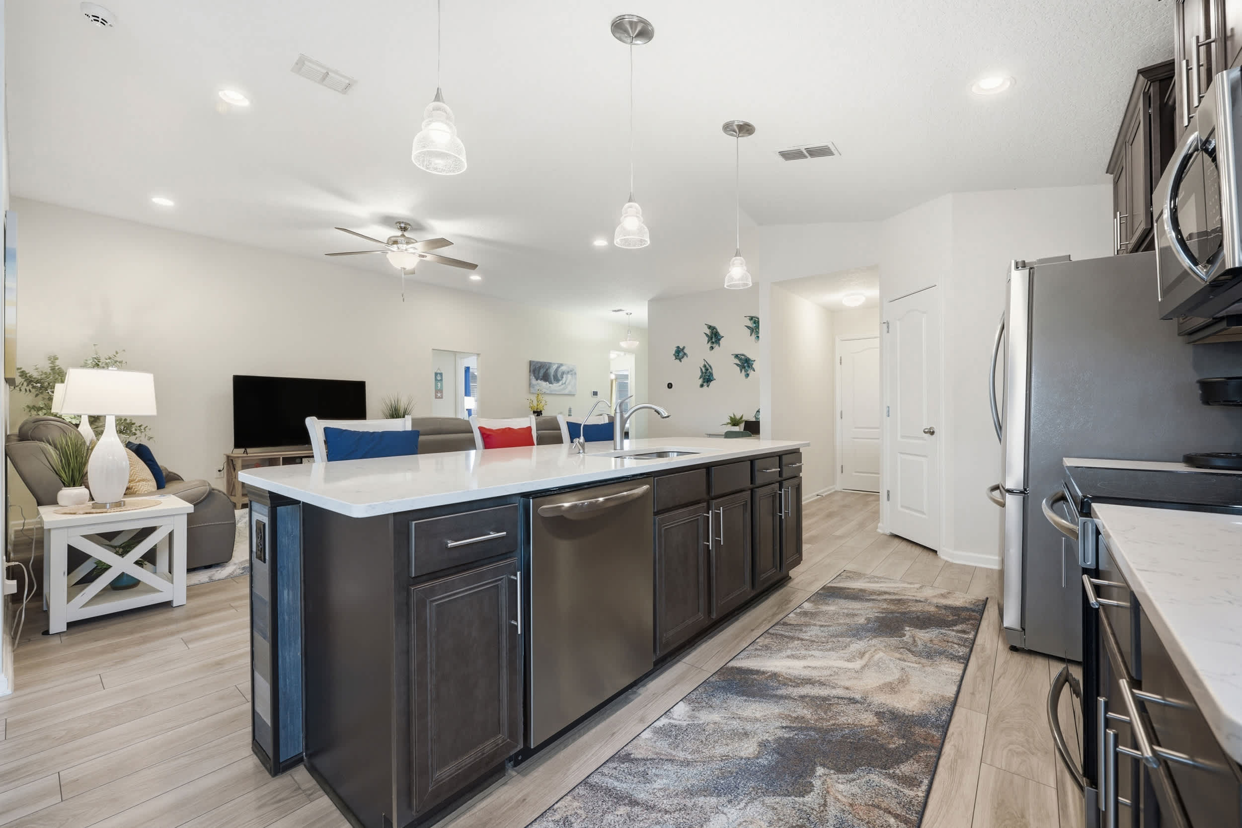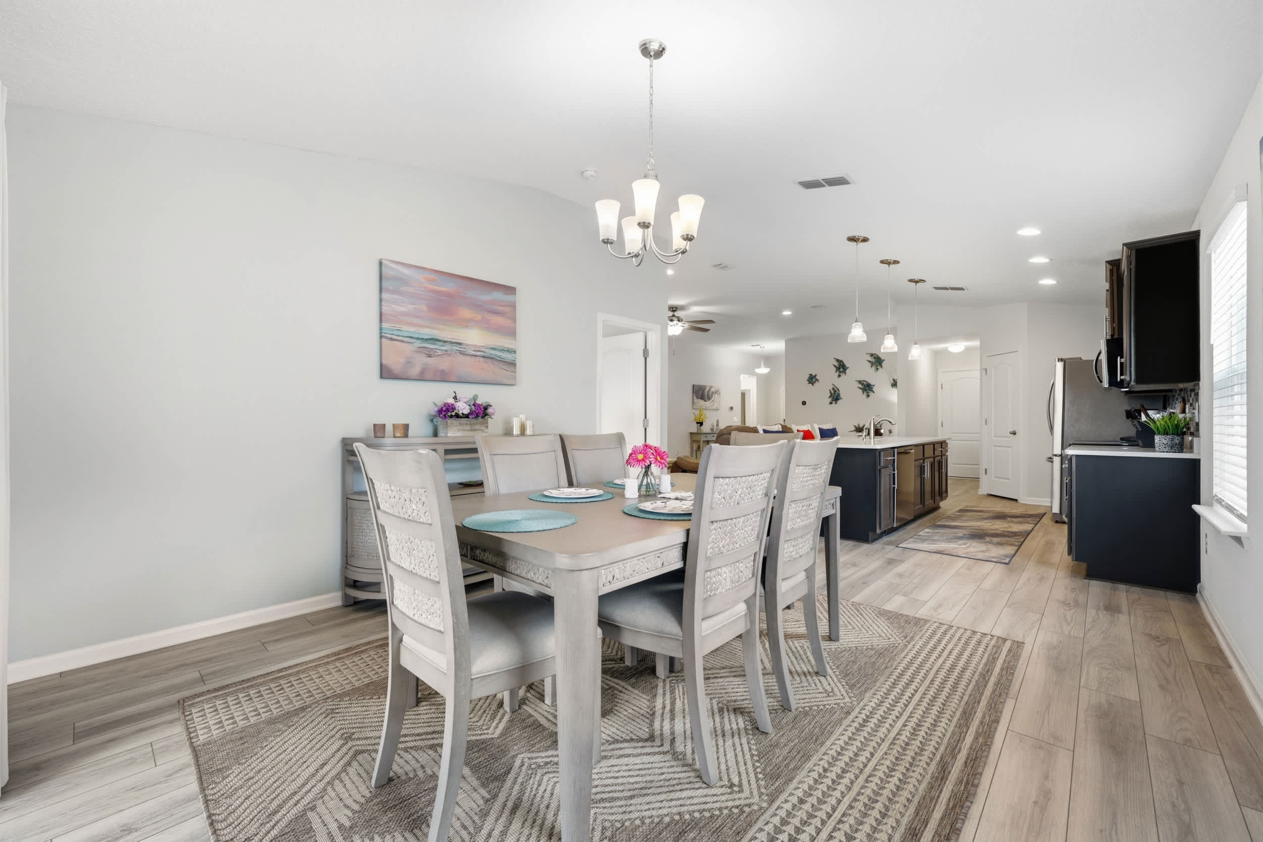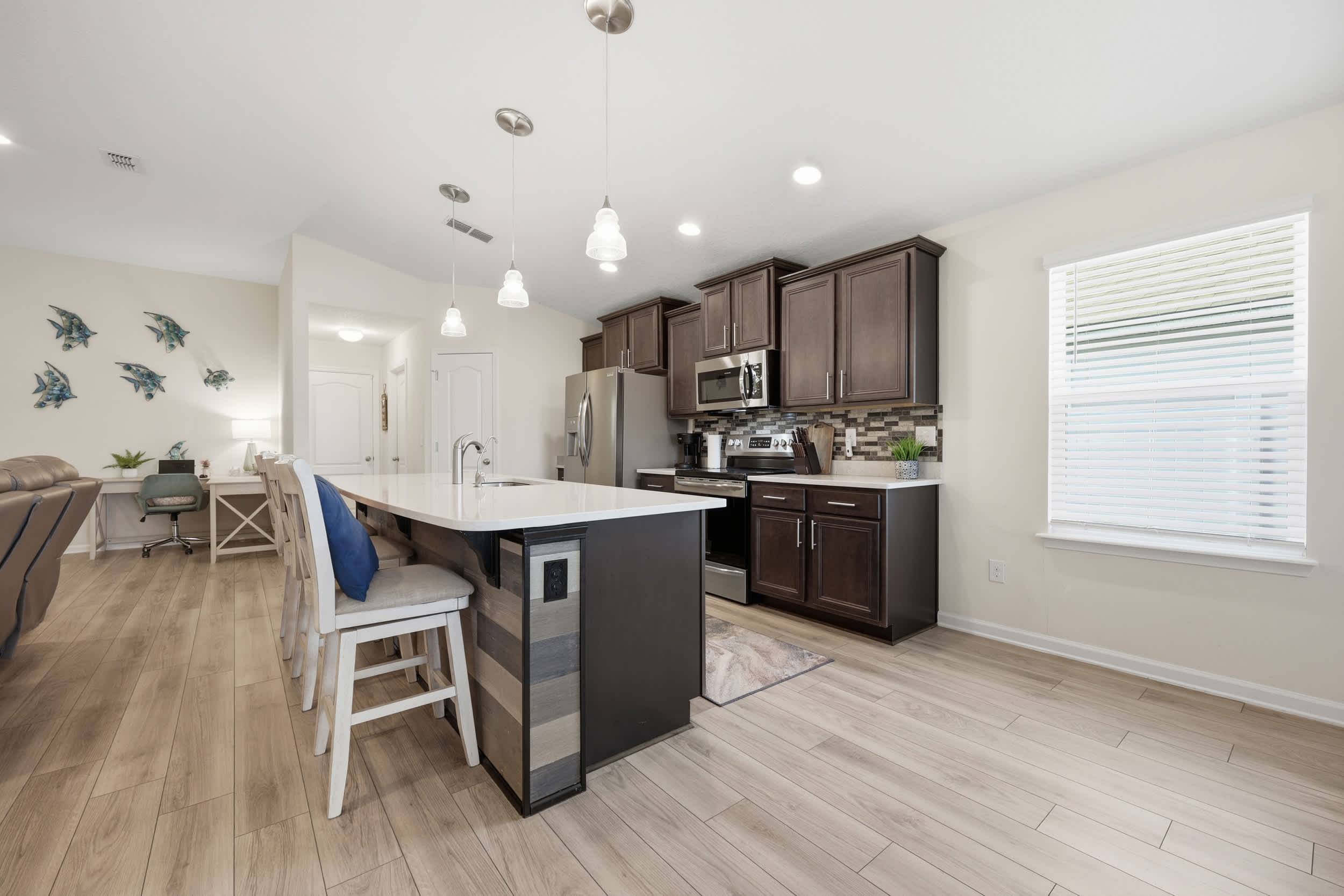 Step inside this inviting home and discover an open floor plan that seamlessly connects the living room, kitchen, and dining area. The living space is bright and airy, featuring a couch, loveseat, armchair, a desk for work or study, and a smart TV for entertainment. The fully equipped kitchen boasts dark cabinetry, white countertops, and counter seating for three, making it ideal for casual meals or morning coffee. Adjacent to the kitchen, the dining table for six provides a comfortable setting for family meals or gatherings.