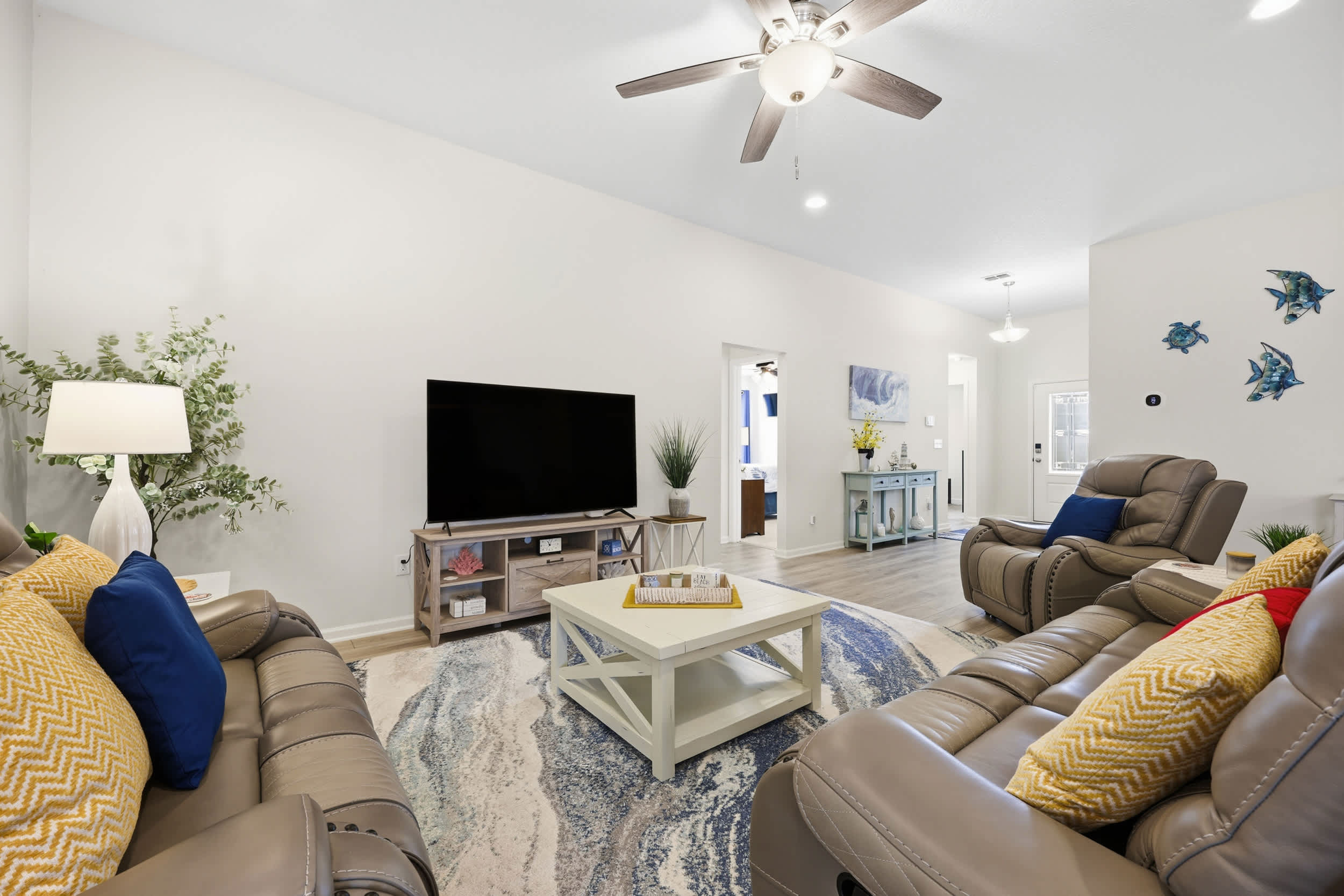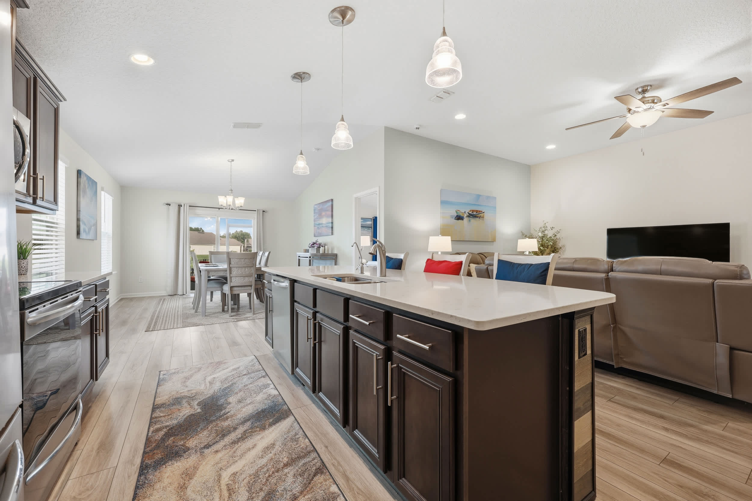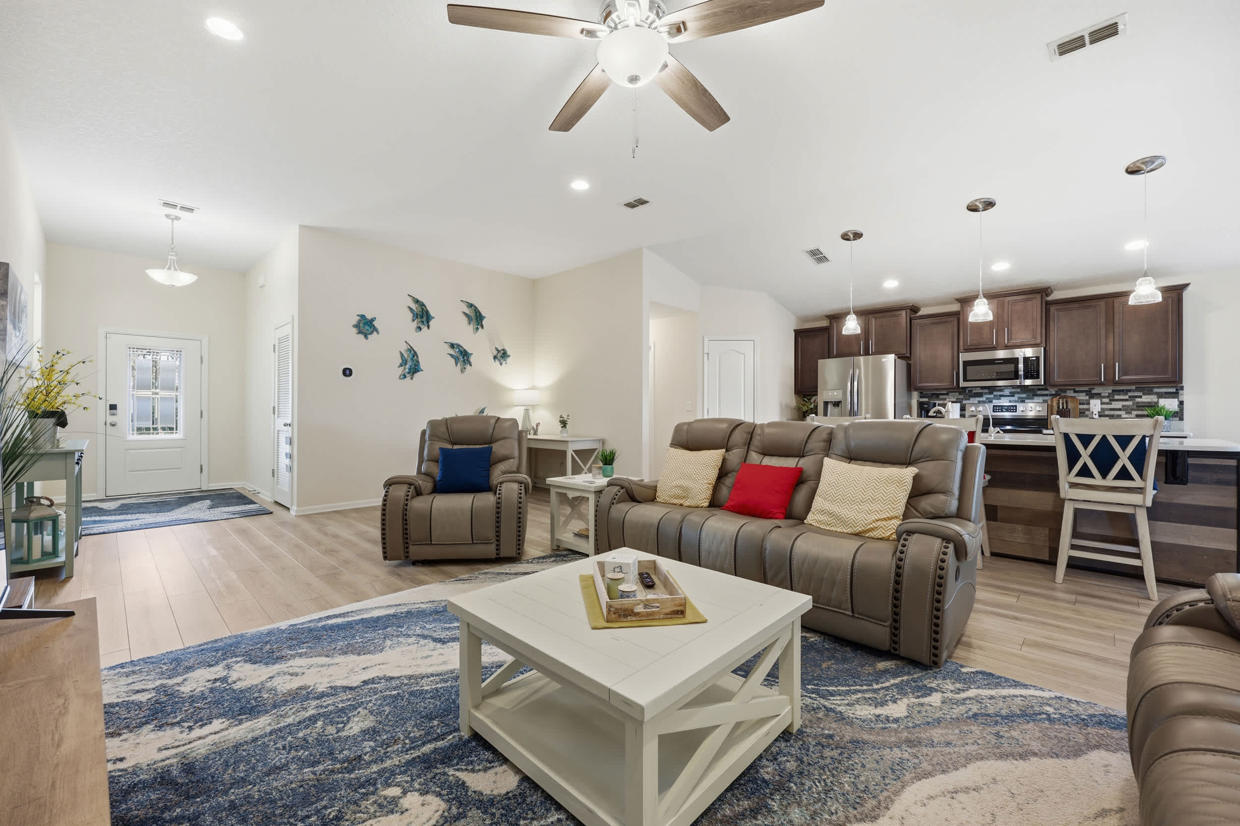 Step inside this inviting home and discover an open floor plan that seamlessly connects the living room, kitchen, and dining area. The living space is bright and airy, featuring a couch, loveseat, armchair, a desk for work or study, and a smart TV for entertainment. The fully equipped kitchen boasts dark cabinetry, white countertops, and counter seating for three, making it ideal for casual meals or morning coffee. Adjacent to the kitchen, the dining table for six provides a comfortable setting for family meals or gatherings.