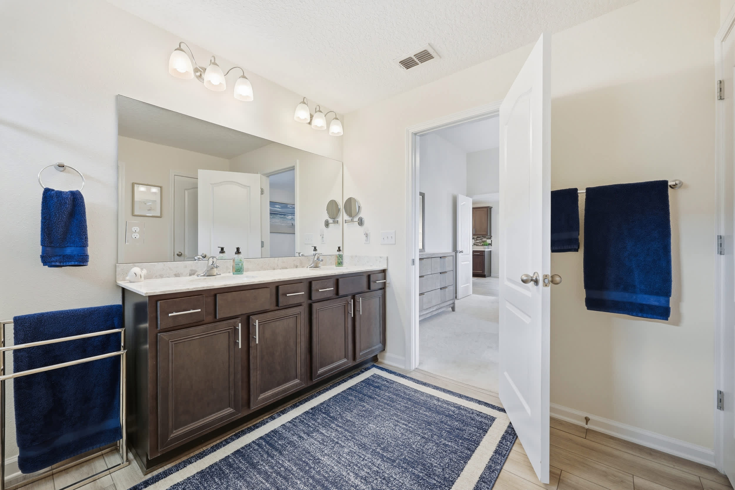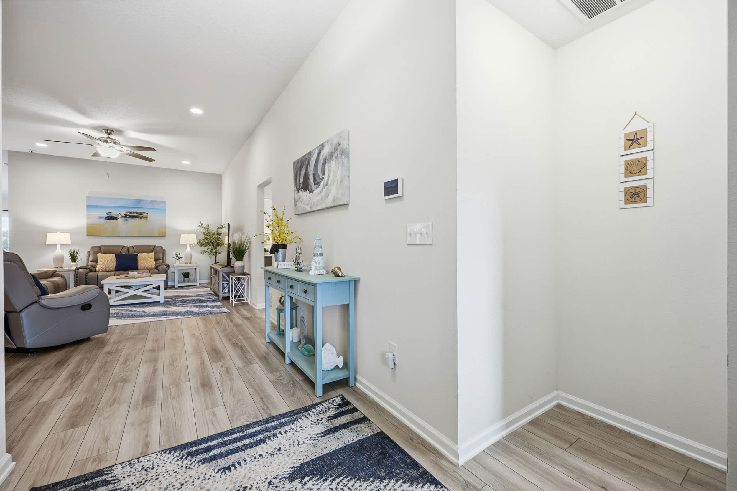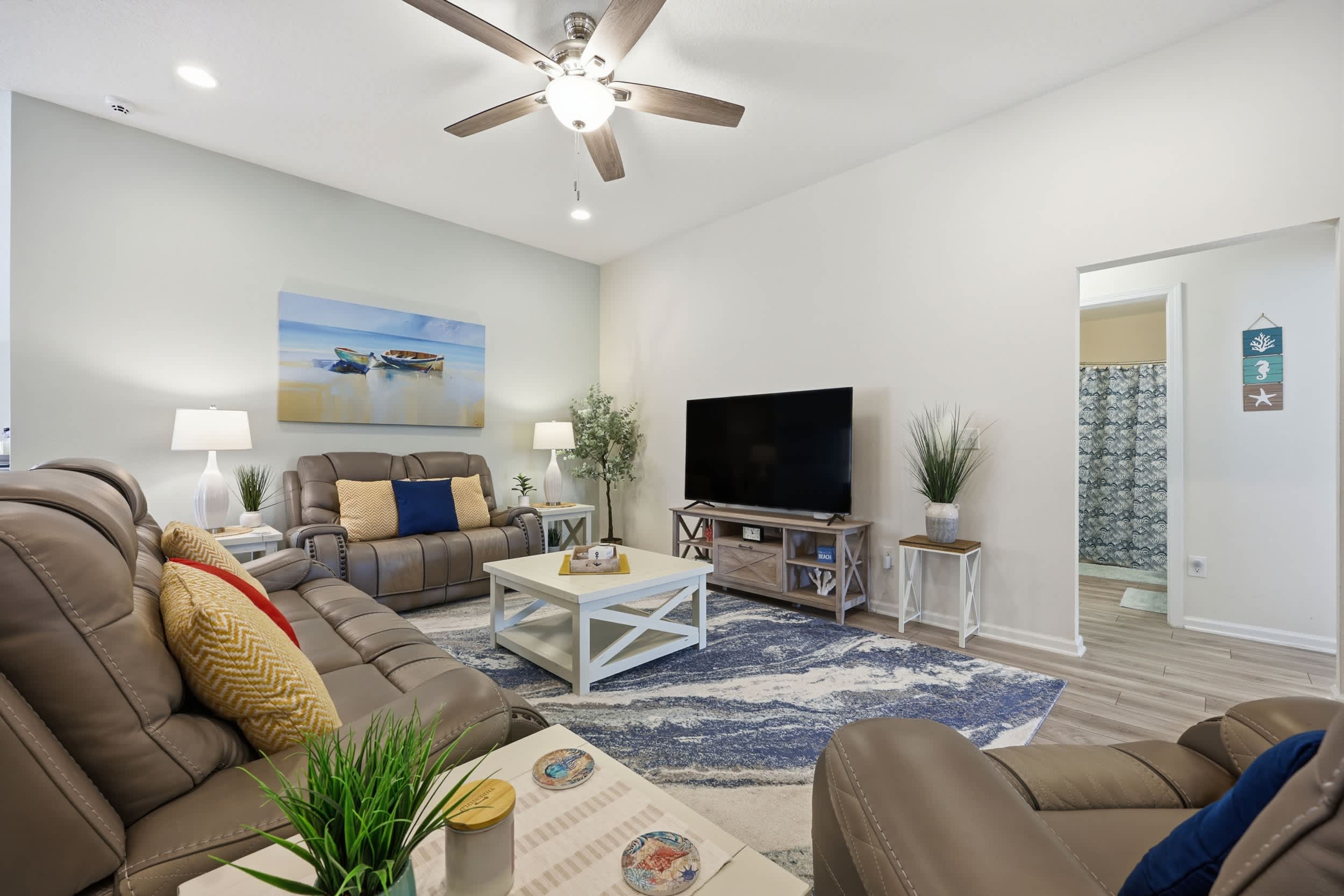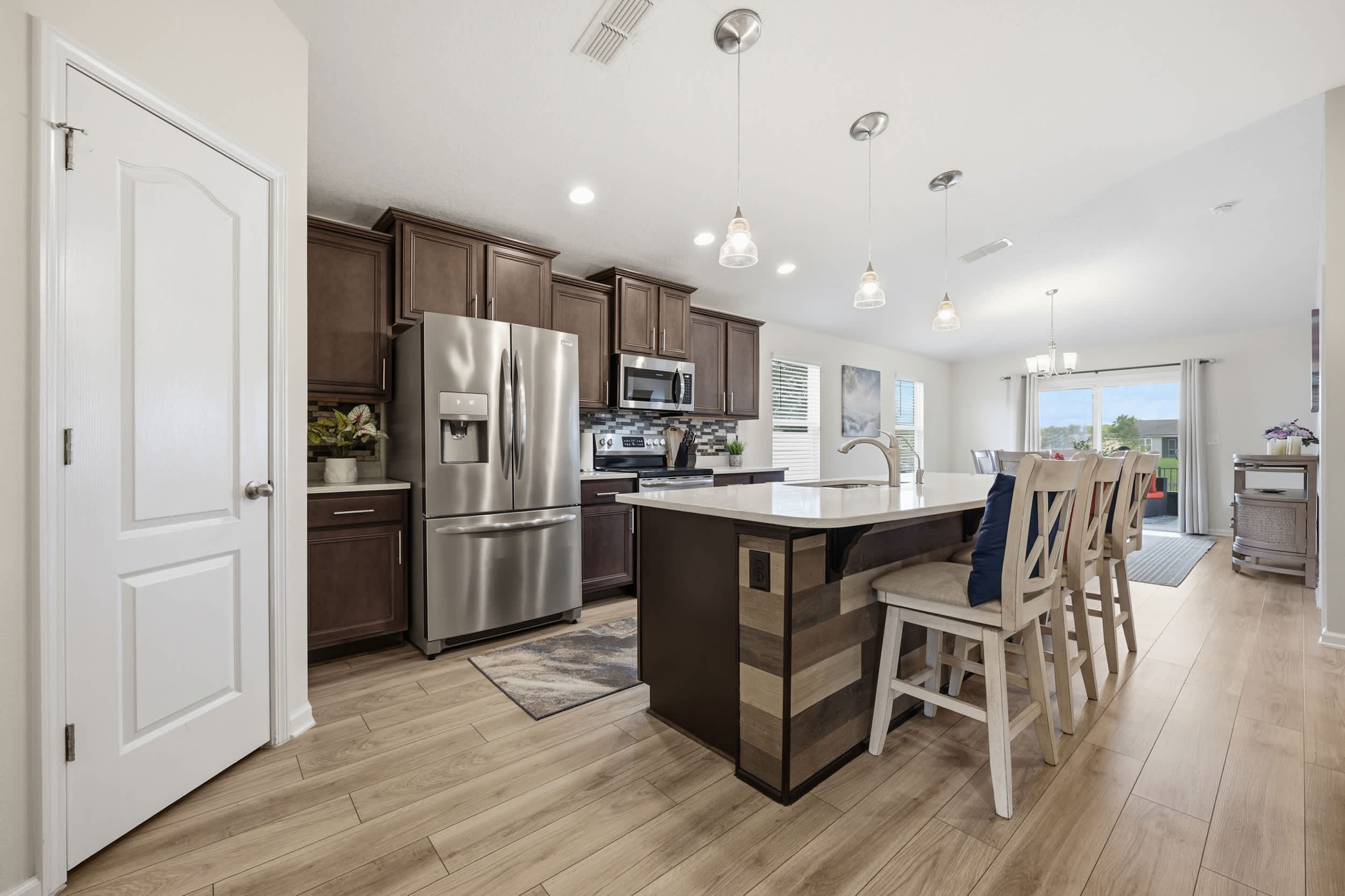 Step inside this inviting home and discover an open floor plan that seamlessly connects the living room, kitchen, and dining area. The living space is bright and airy, featuring a couch, loveseat, armchair, a desk for work or study, and a smart TV for entertainment. The fully equipped kitchen boasts dark cabinetry, white countertops, and counter seating for three, making it ideal for casual meals or morning coffee. Adjacent to the kitchen, the dining table for six provides a comfortable setting for family meals or gatherings.