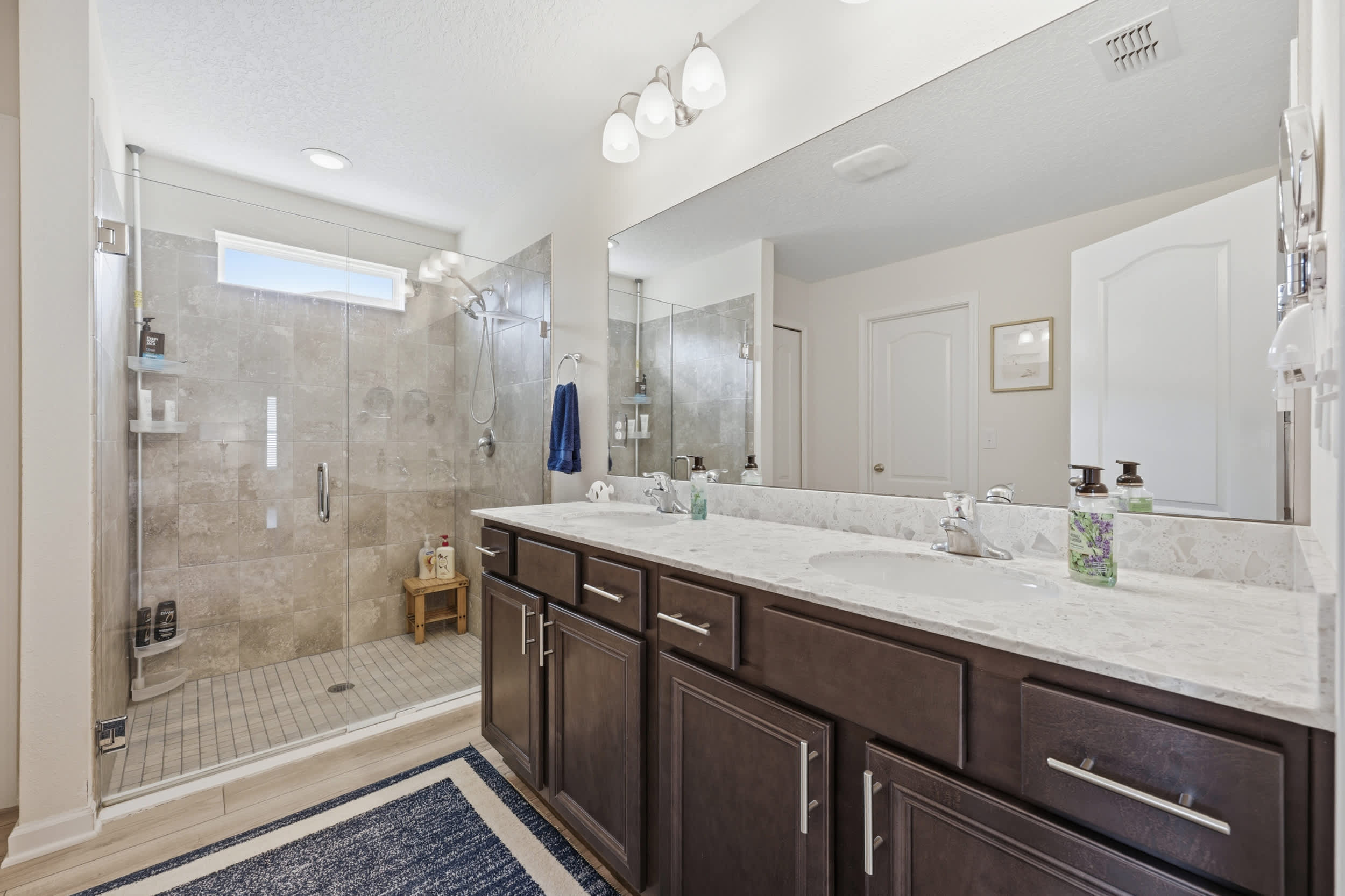 Bedroom #1 includes a queen size bed, a smart TV, and an ensuite bathroom with a dual vanity and a walk-in shower.