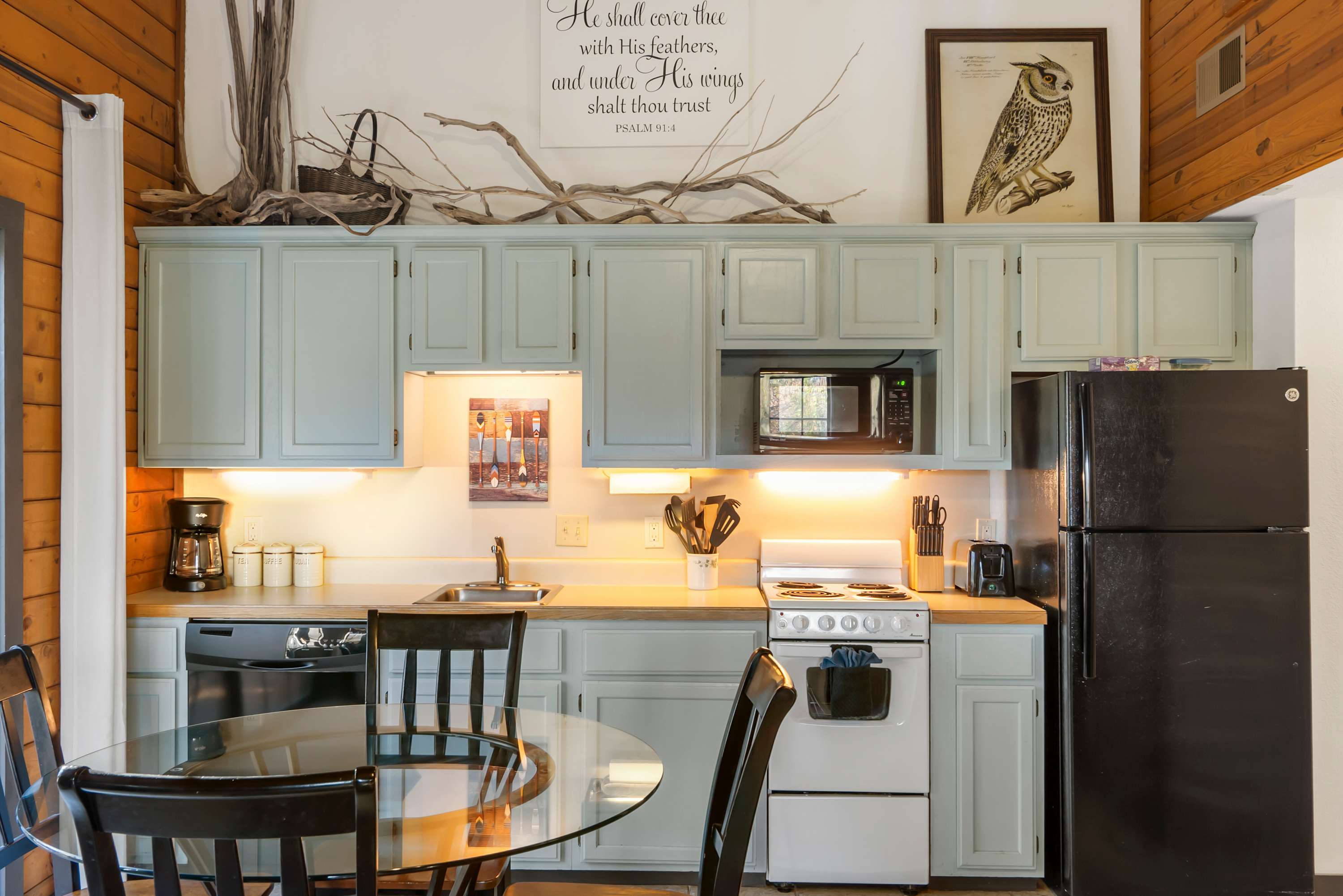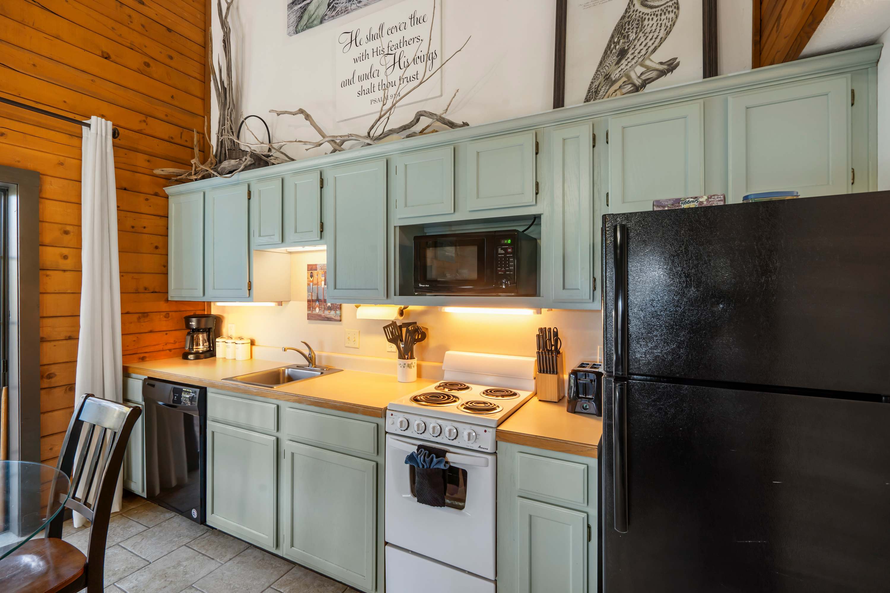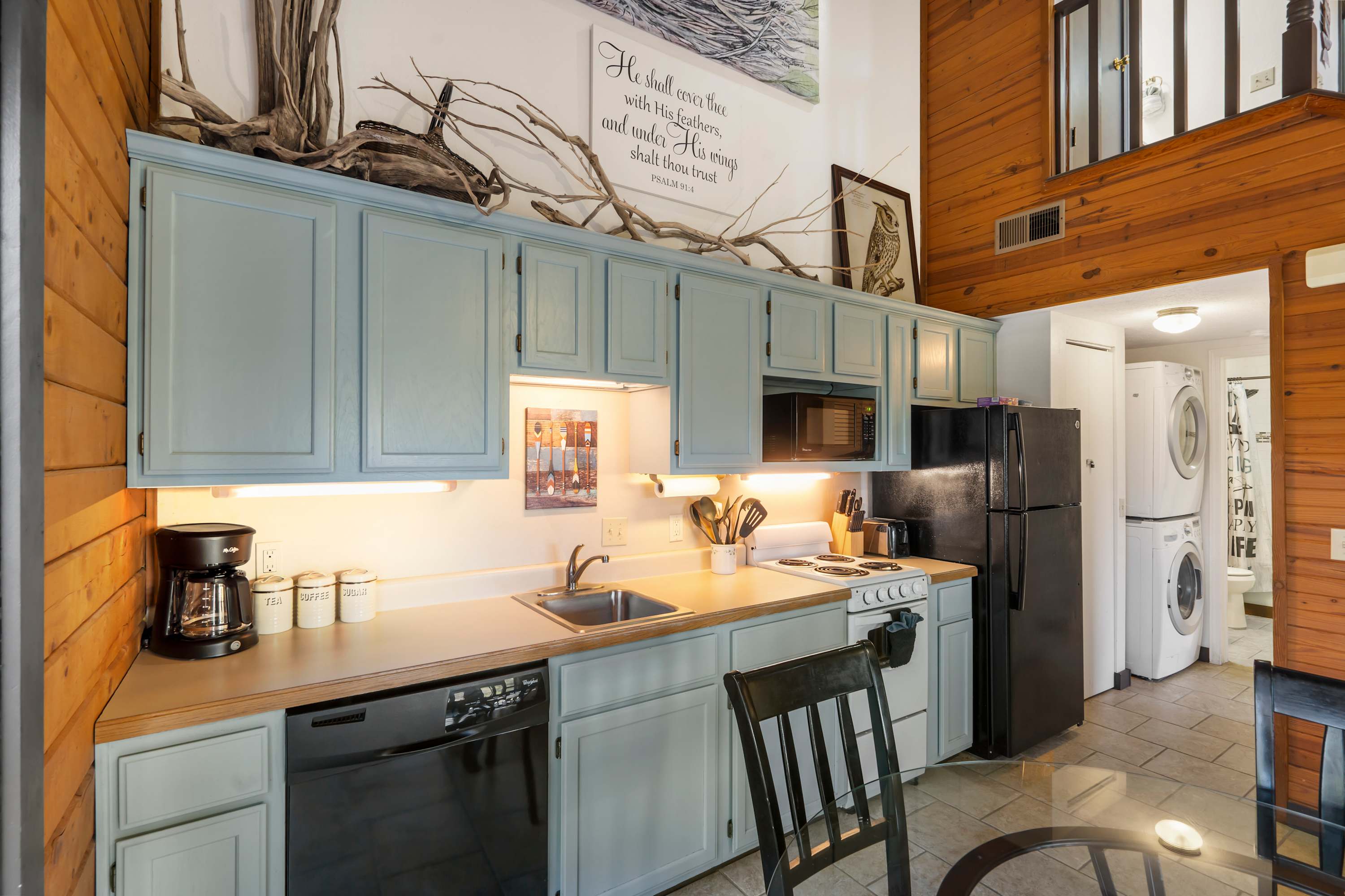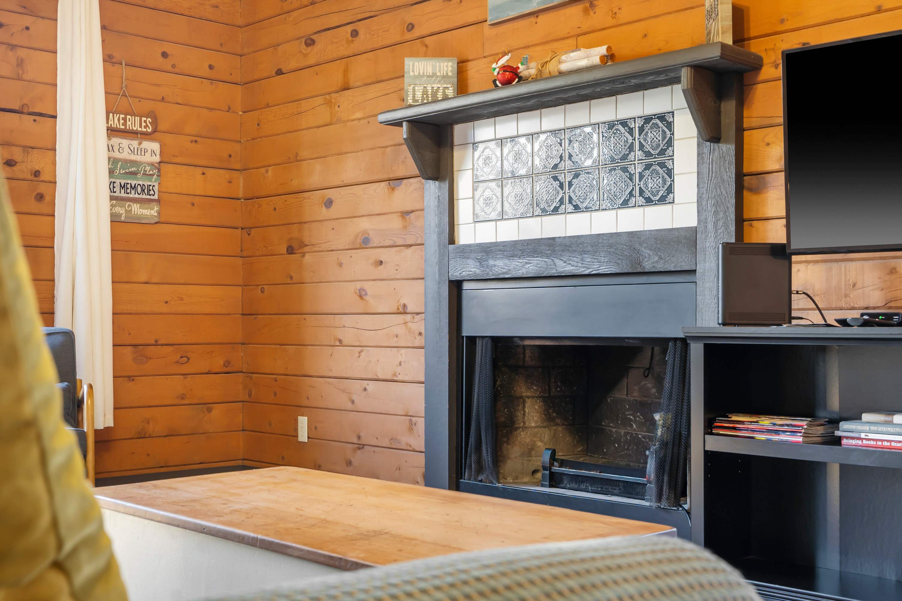 Just steps away, the compact but fully equipped kitchen features charming light-green cabinetry and offers everything you need to prepare meals during your stay. The dining table for four sits beside sliding glass doors, filling the space with natural light and providing a beautiful view of the trees outside. Open the doors to step onto the deck, where a table awaits for al fresco dining surrounded by the peaceful, wooded landscape. Rustic Shore Cabin blends comfort, character, and an unbeatable Branson location—making it the perfect home base for your next getaway.