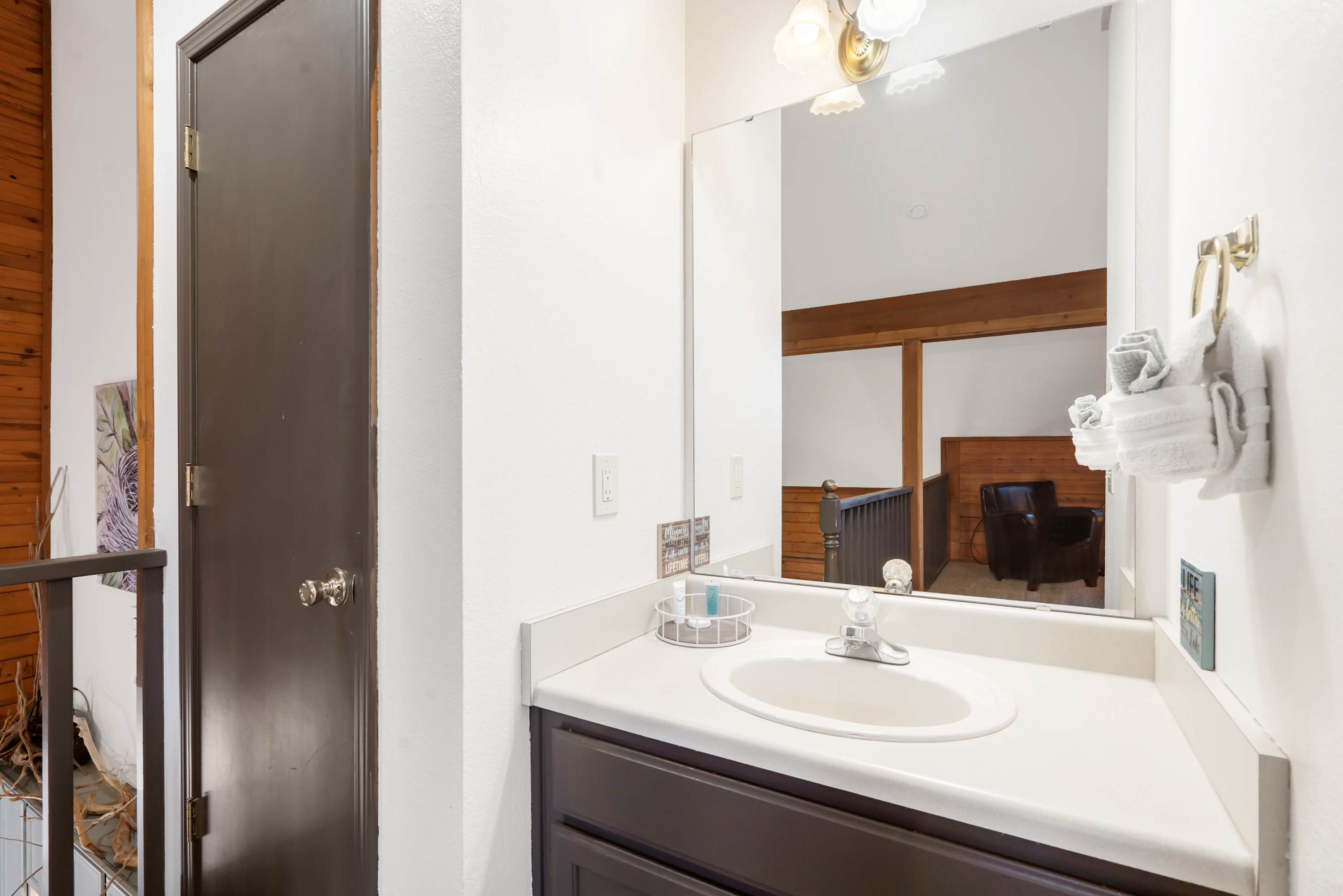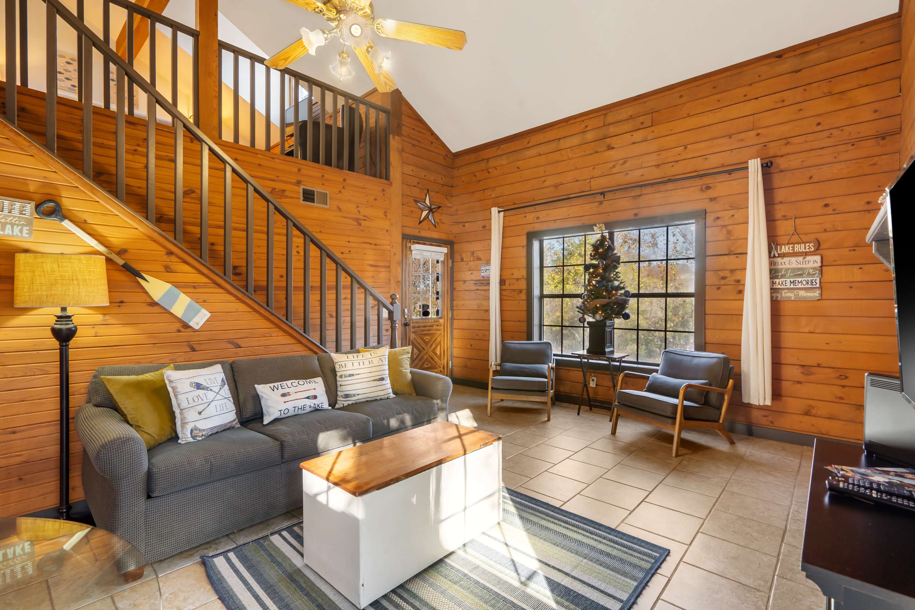 Step inside Rustic Shore Cabin and soak in the tall ceilings and authentic cabin ambiance that greet you the moment you enter. The open layout connects the living, dining, and kitchen areas, creating a welcoming flow perfect for relaxing after a day in Branson. Settle into the living room with its comfortable sofa, two armchairs, and cable TV—an ideal spot for unwinding with your favorite shows or simply enjoying the cozy cabin atmosphere.