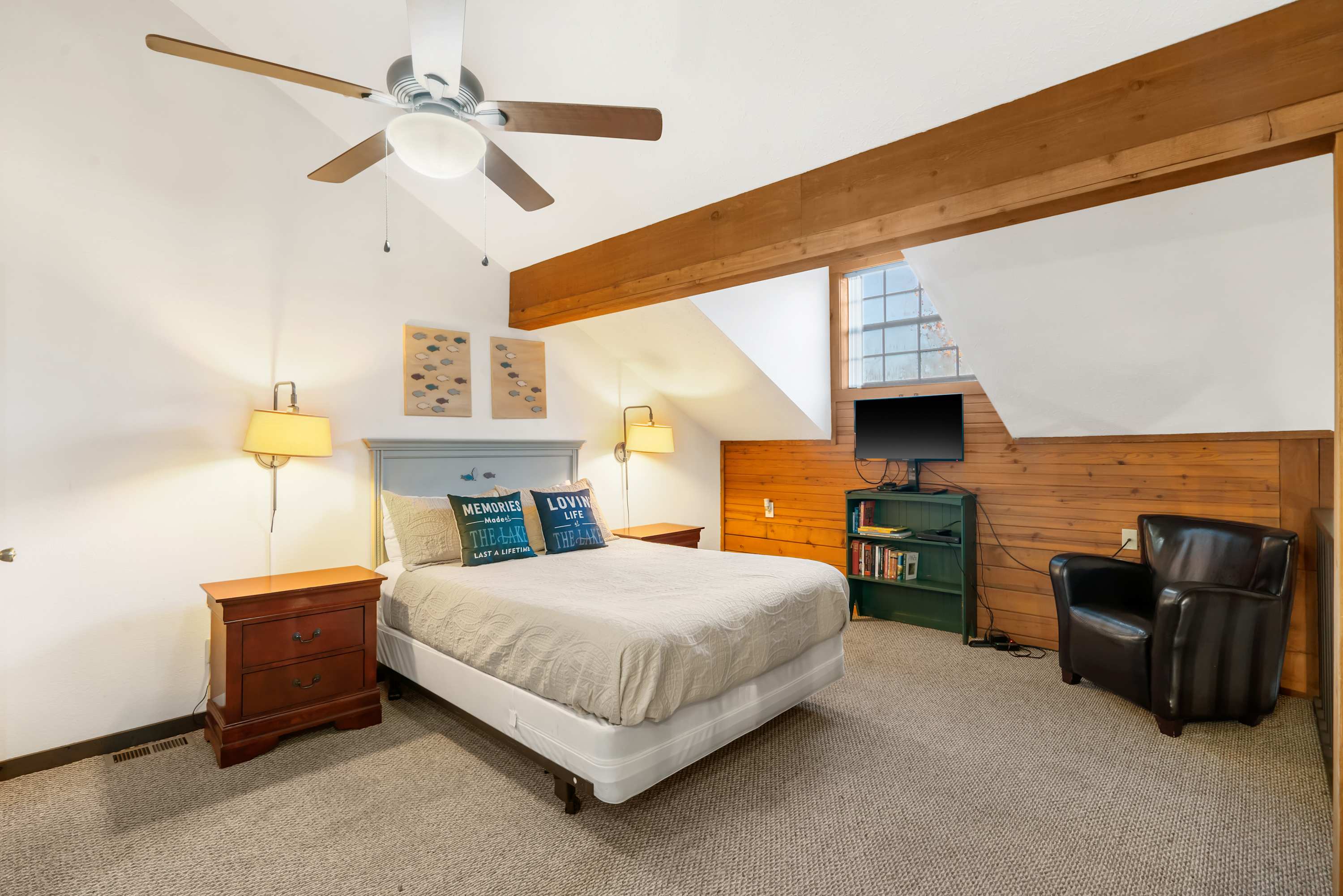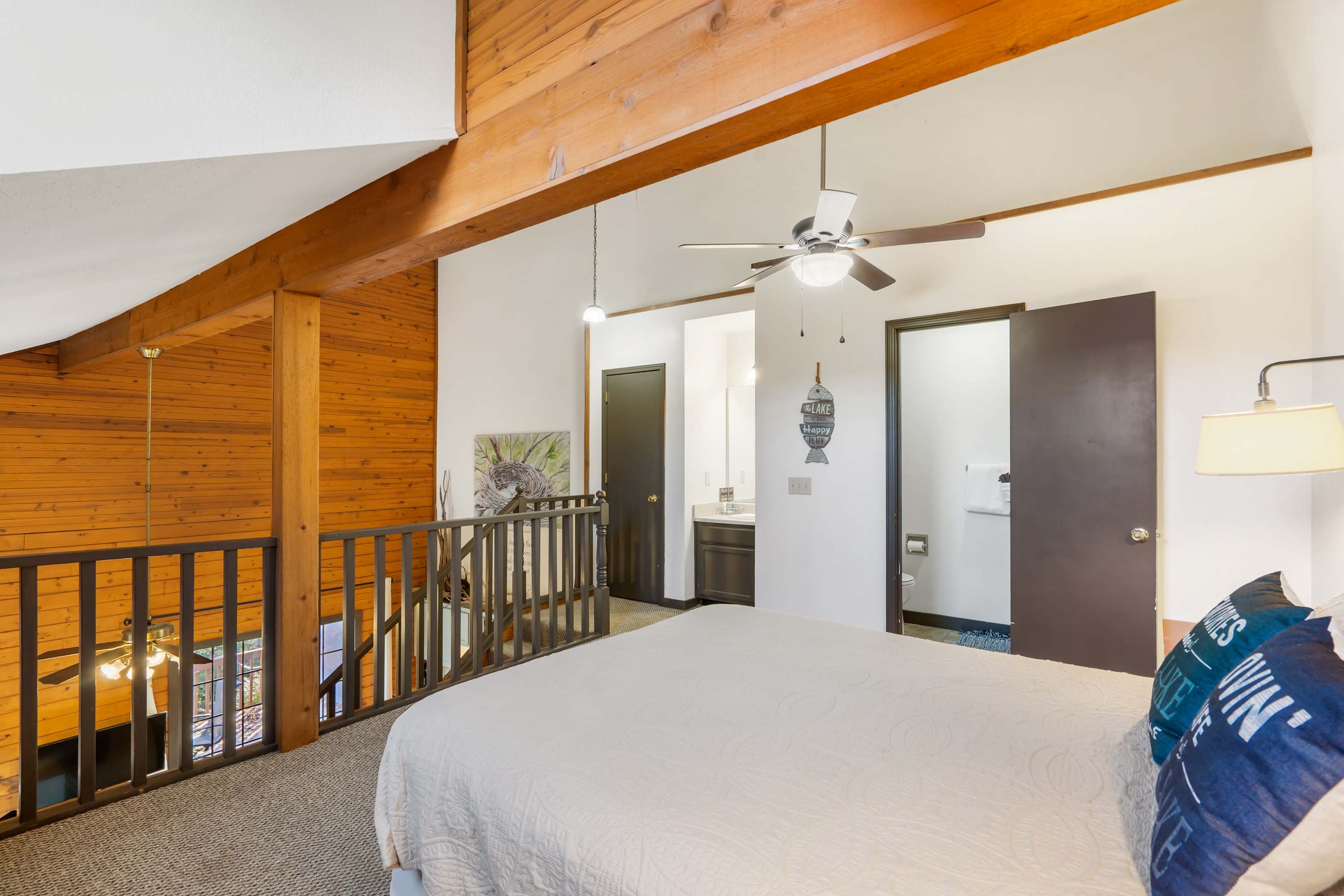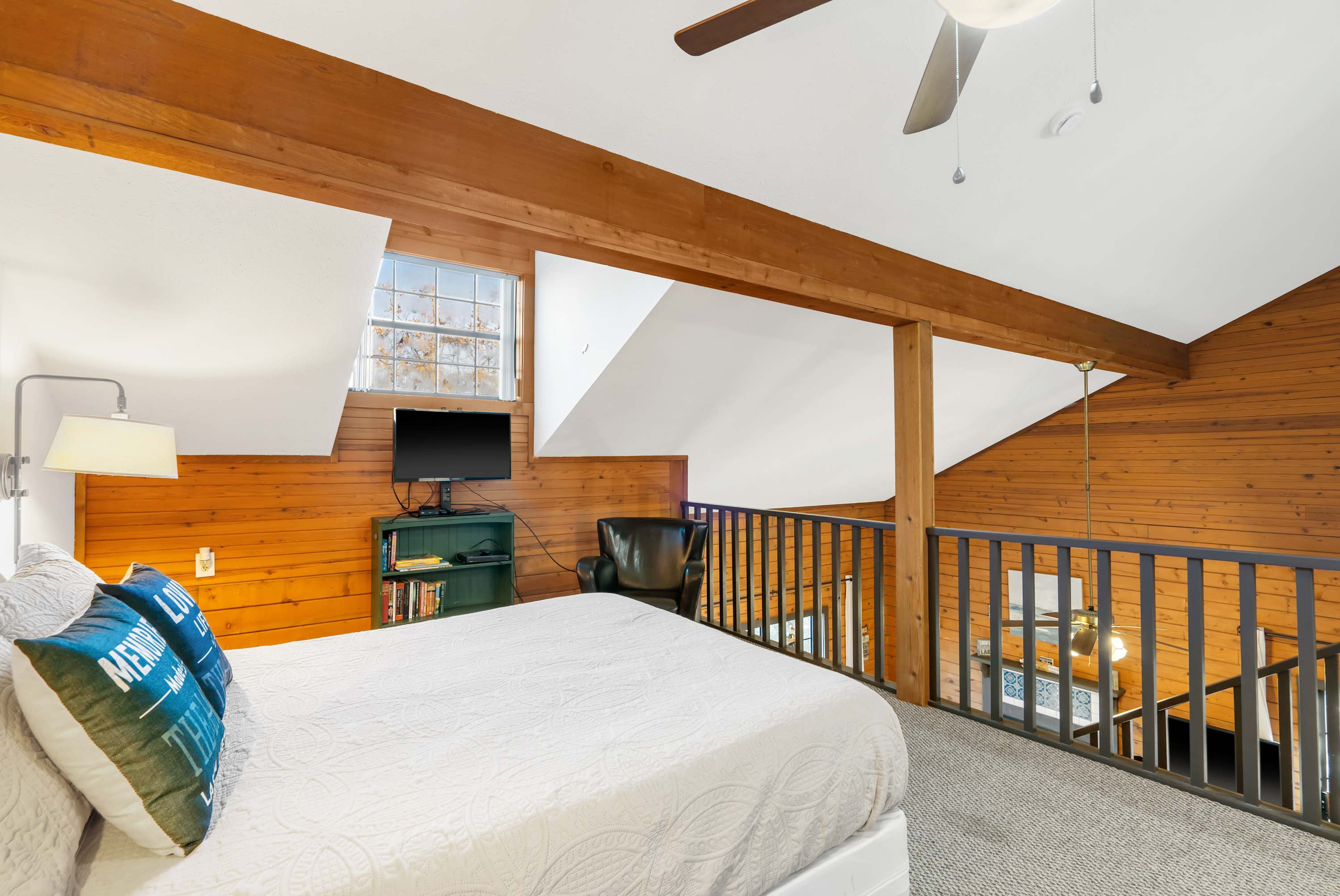 Bedroom #2 is a lofted bedroom and includes a queen size bed, a smart TV, and an ensuite bathroom with a single vanity and a walk-in shower.