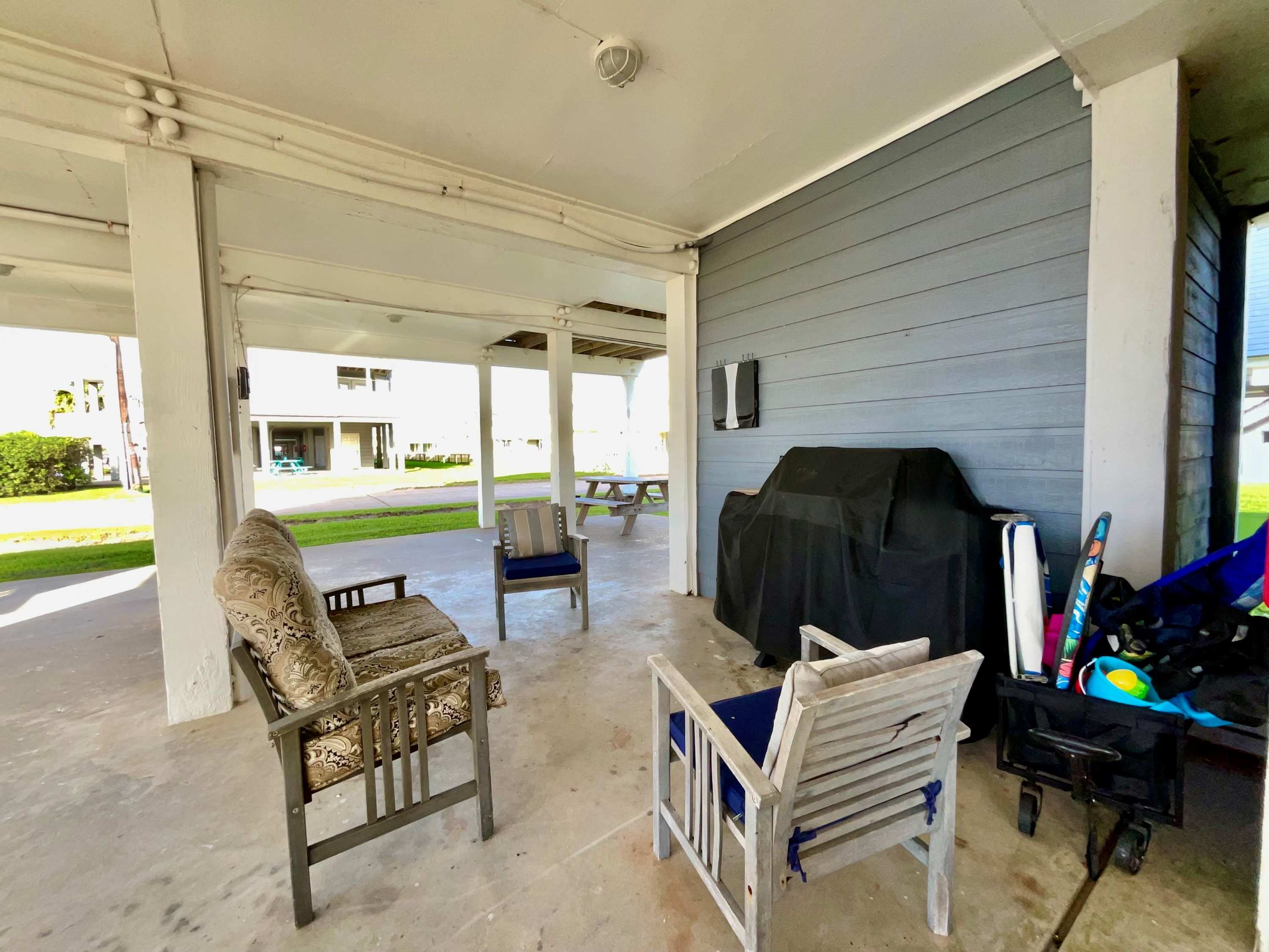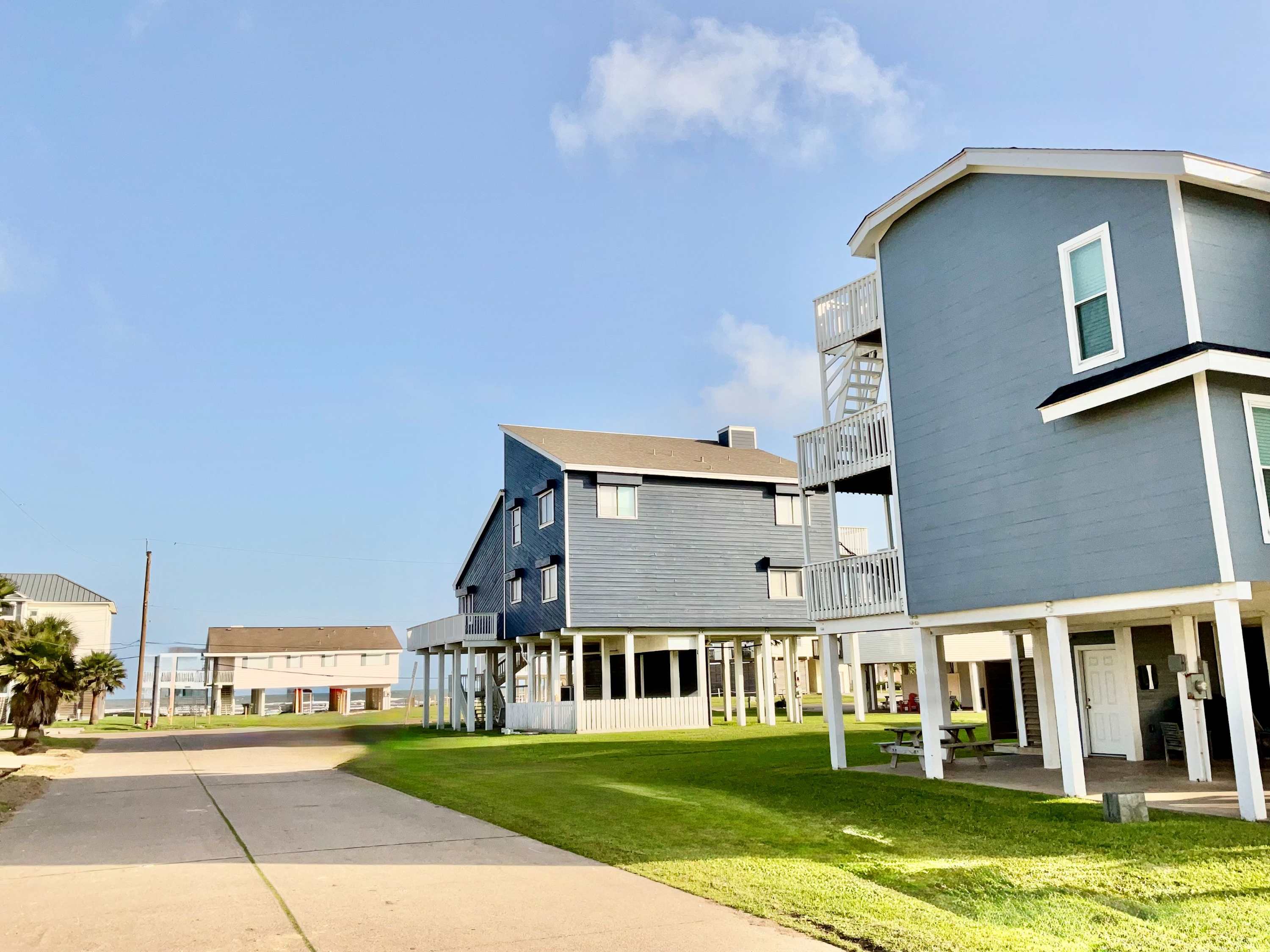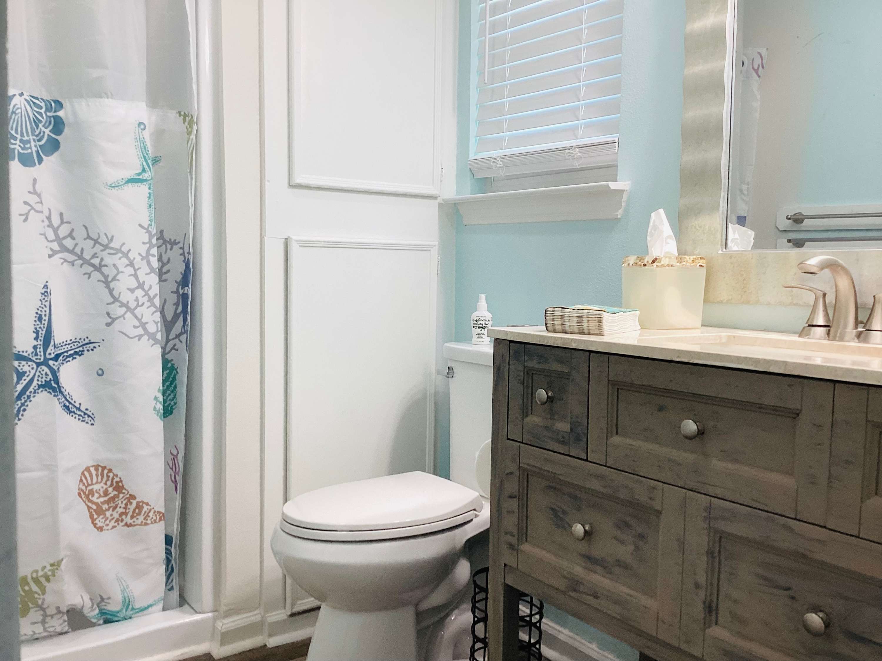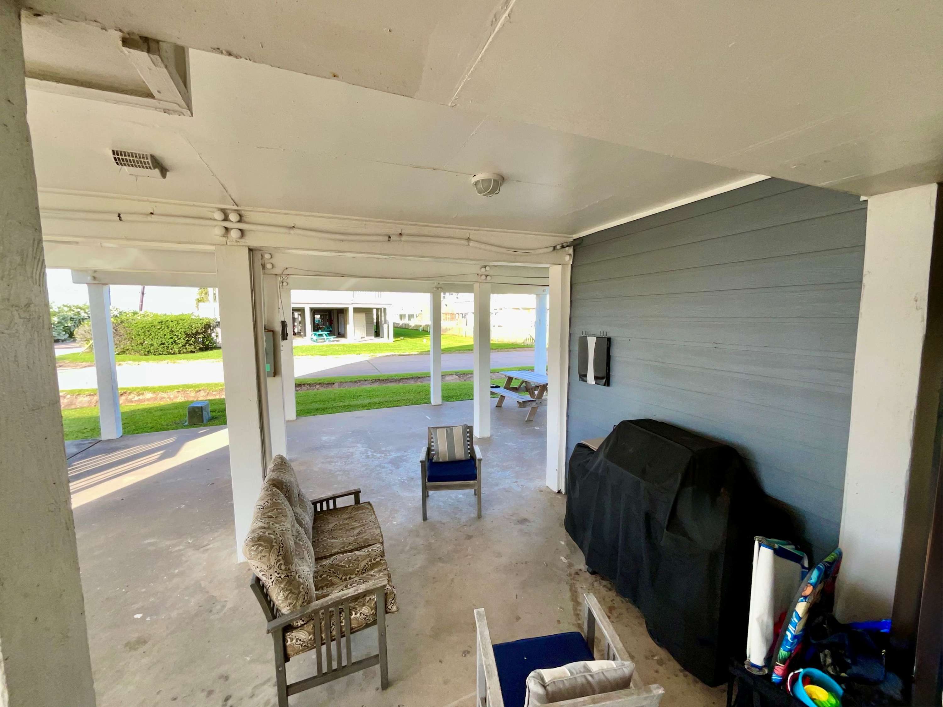 But the magic extends outdoors. Rinse off sandy toes in the outdoor shower on the first-floor patio, then enjoy casual al fresco meals at the picnic table. Head up to the second-floor balcony for refreshing breezes and ocean views—or climb to the third-floor balcony for an even more elevated perspective. Both decks are furnished with seating, giving you peaceful places to sip morning coffee, unwind at sunset, or simply soak in the salty air. With its spacious layout, coastal charm, and unbeatable proximity to the beach, Salty Solace is the perfect escape for families and friends looking to experience Galveston at its best.