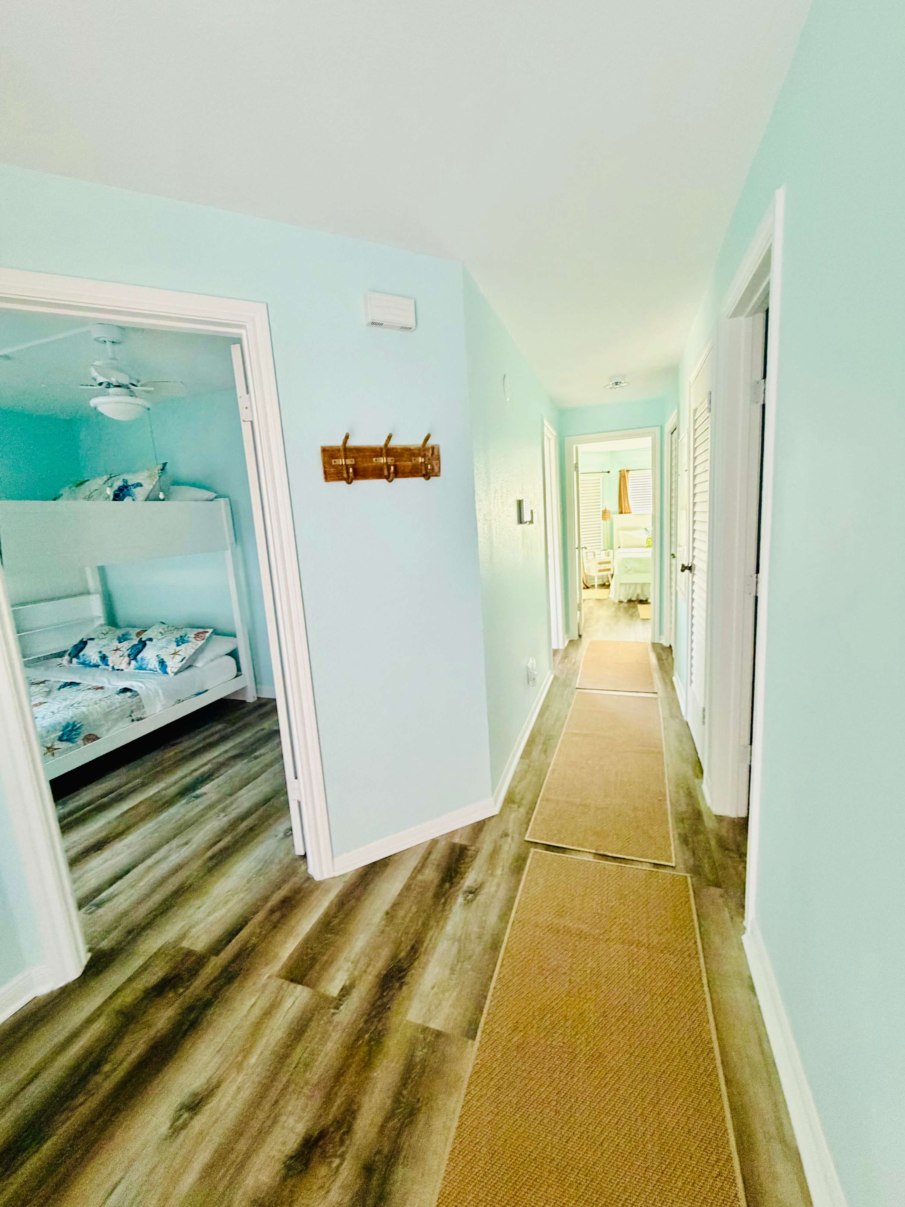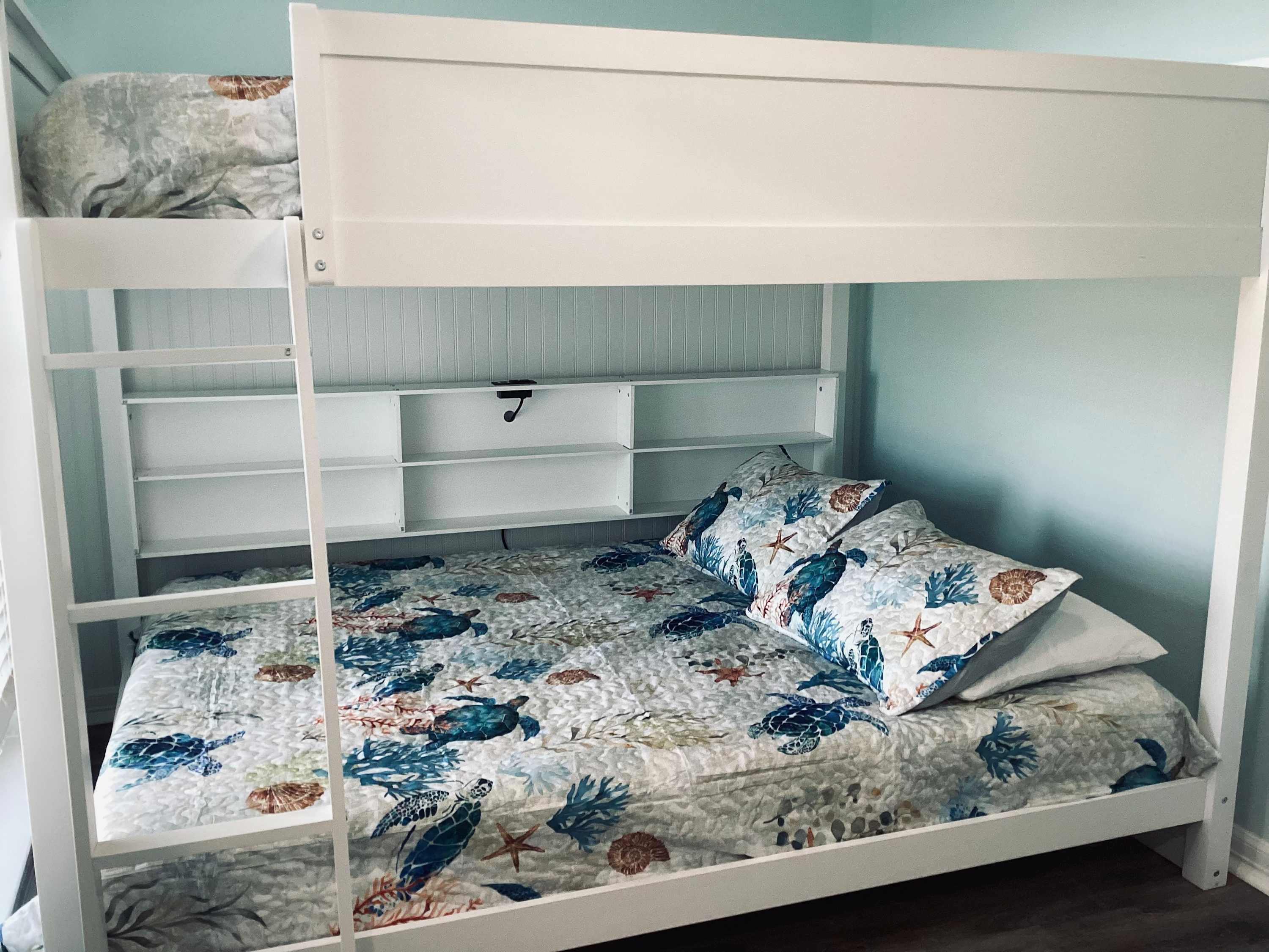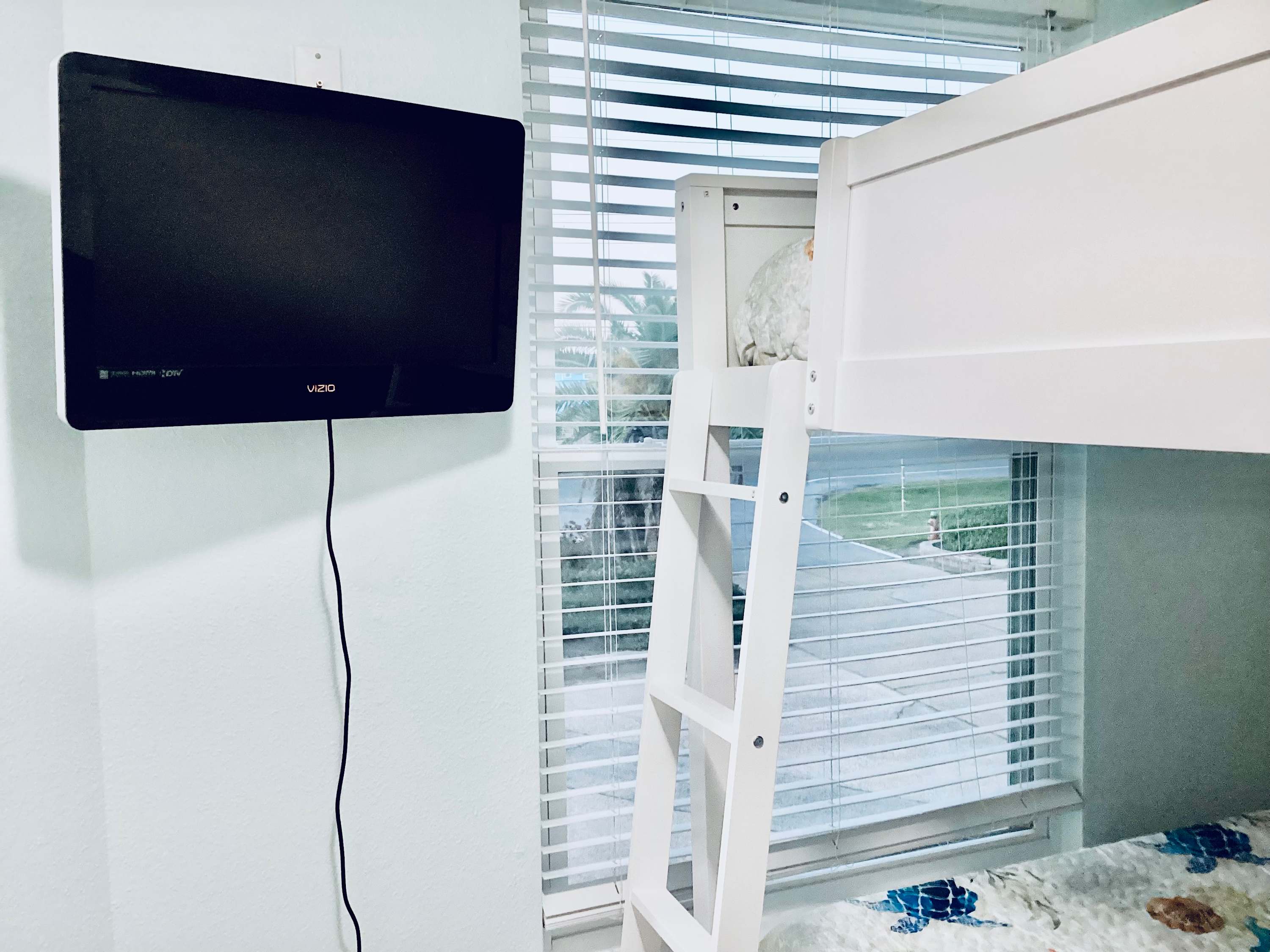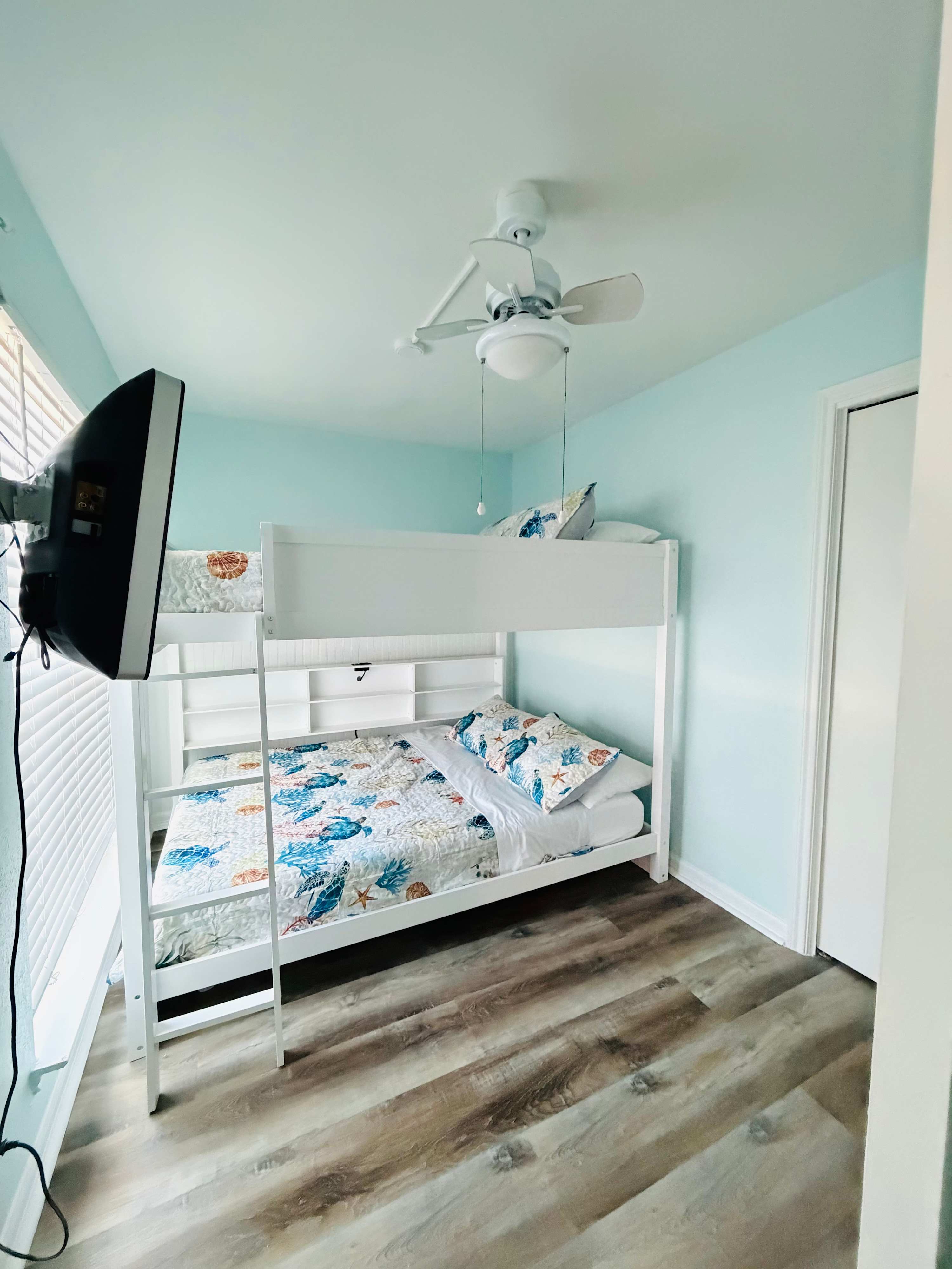 Bedroom #1 includes queen-over-queen bunk beds and a smart TV.