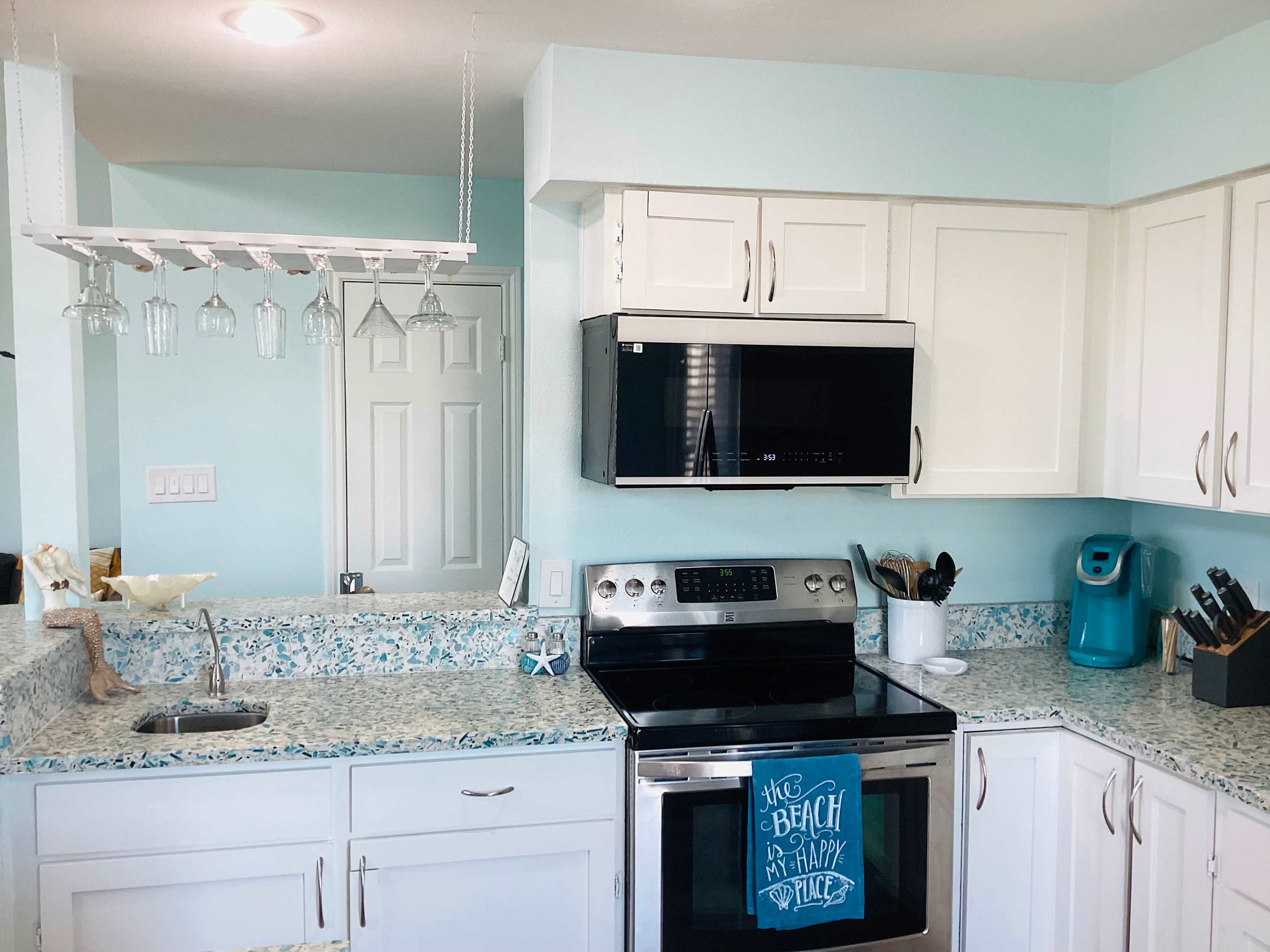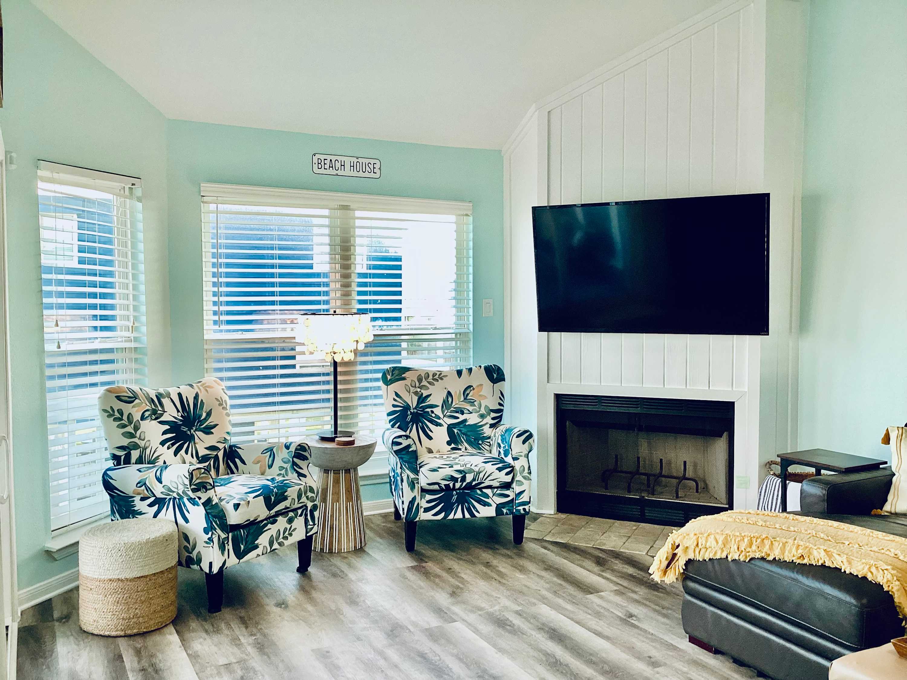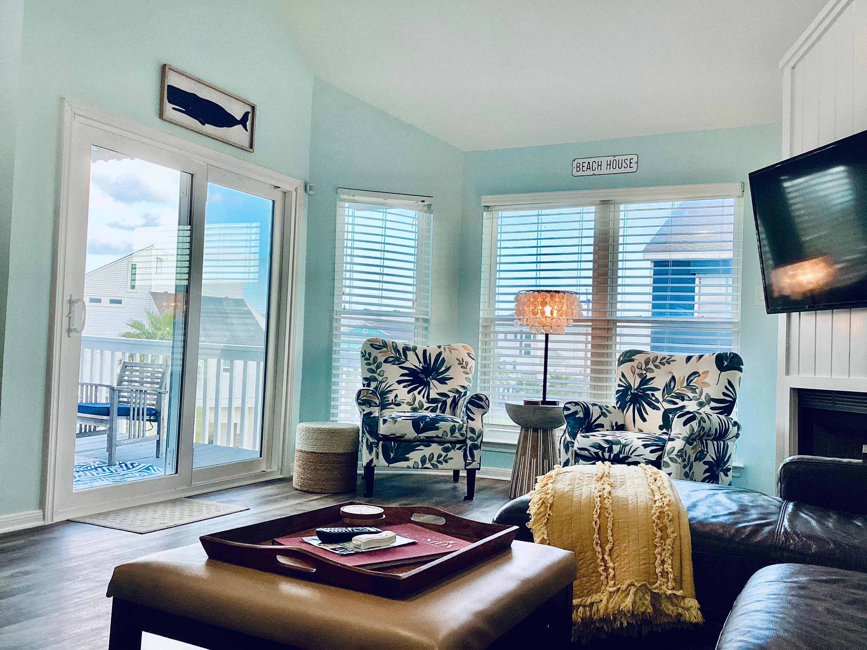 Step inside to an inviting open-concept living space designed for gathering and unwinding. The living room features an oversized couch, two armchairs, a smart TV, and a selection of board games—perfect for cozy evenings after a day in the sun. Flowing seamlessly beside it is the bright kitchen, where crystal-blue countertops bring a splash of coastal color. Stainless steel appliances, a Keurig, and counter seating for four make it easy to enjoy anything from quick snacks to group meals. The dining table for six sits just beyond, offering a comfortable spot for family dinners or laid-back brunch before heading out to the shore.