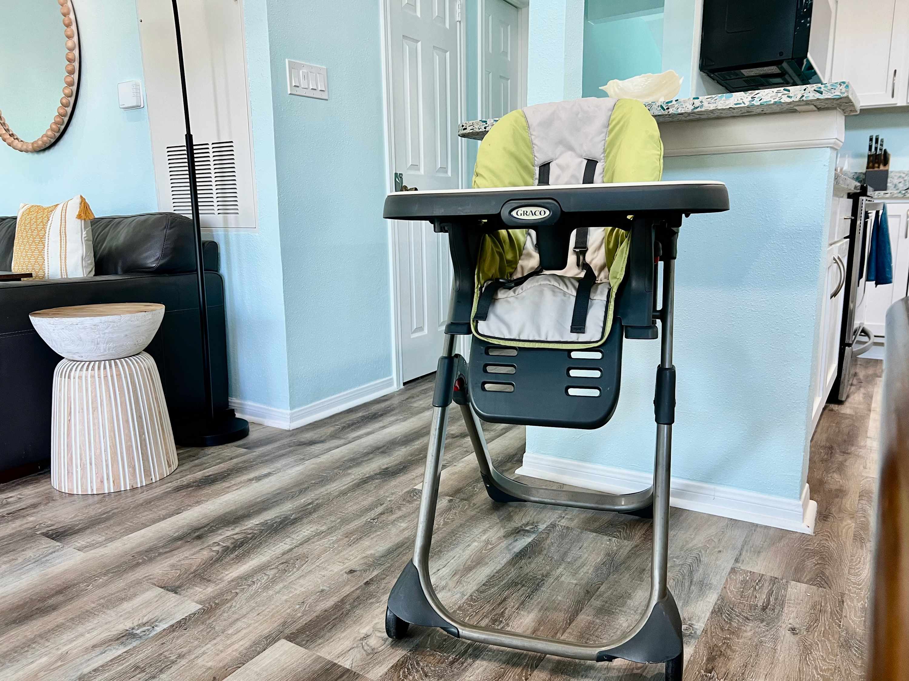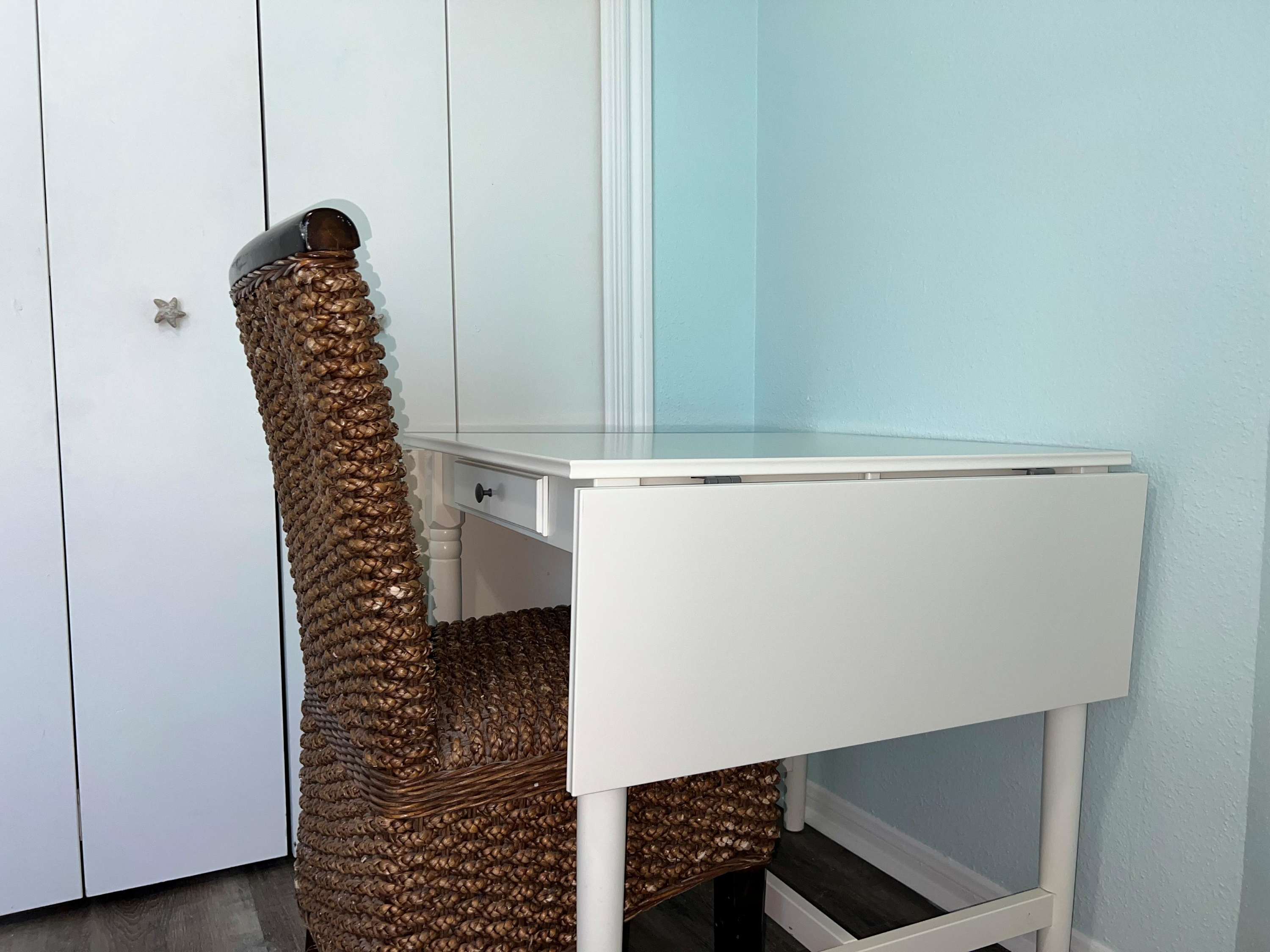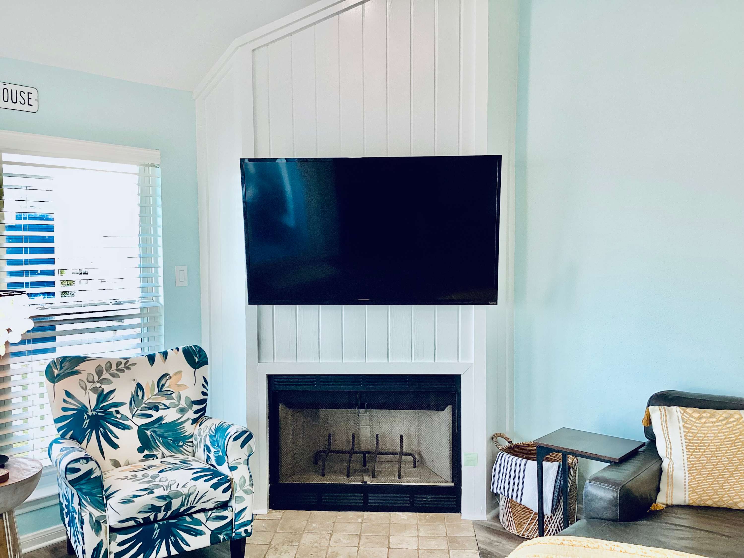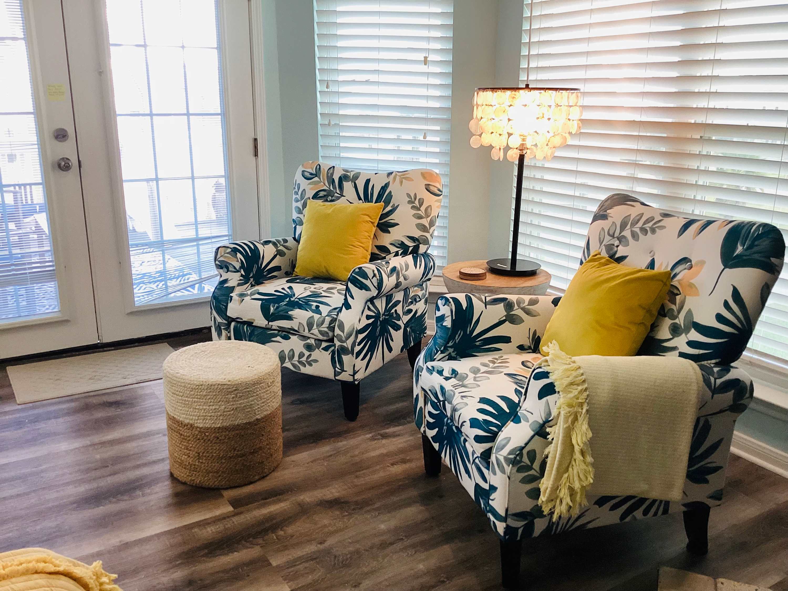 Step inside to an inviting open-concept living space designed for gathering and unwinding. The living room features an oversized couch, two armchairs, a smart TV, and a selection of board games—perfect for cozy evenings after a day in the sun. Flowing seamlessly beside it is the bright kitchen, where crystal-blue countertops bring a splash of coastal color. Stainless steel appliances, a Keurig, and counter seating for four make it easy to enjoy anything from quick snacks to group meals. The dining table for six sits just beyond, offering a comfortable spot for family dinners or laid-back brunch before heading out to the shore.