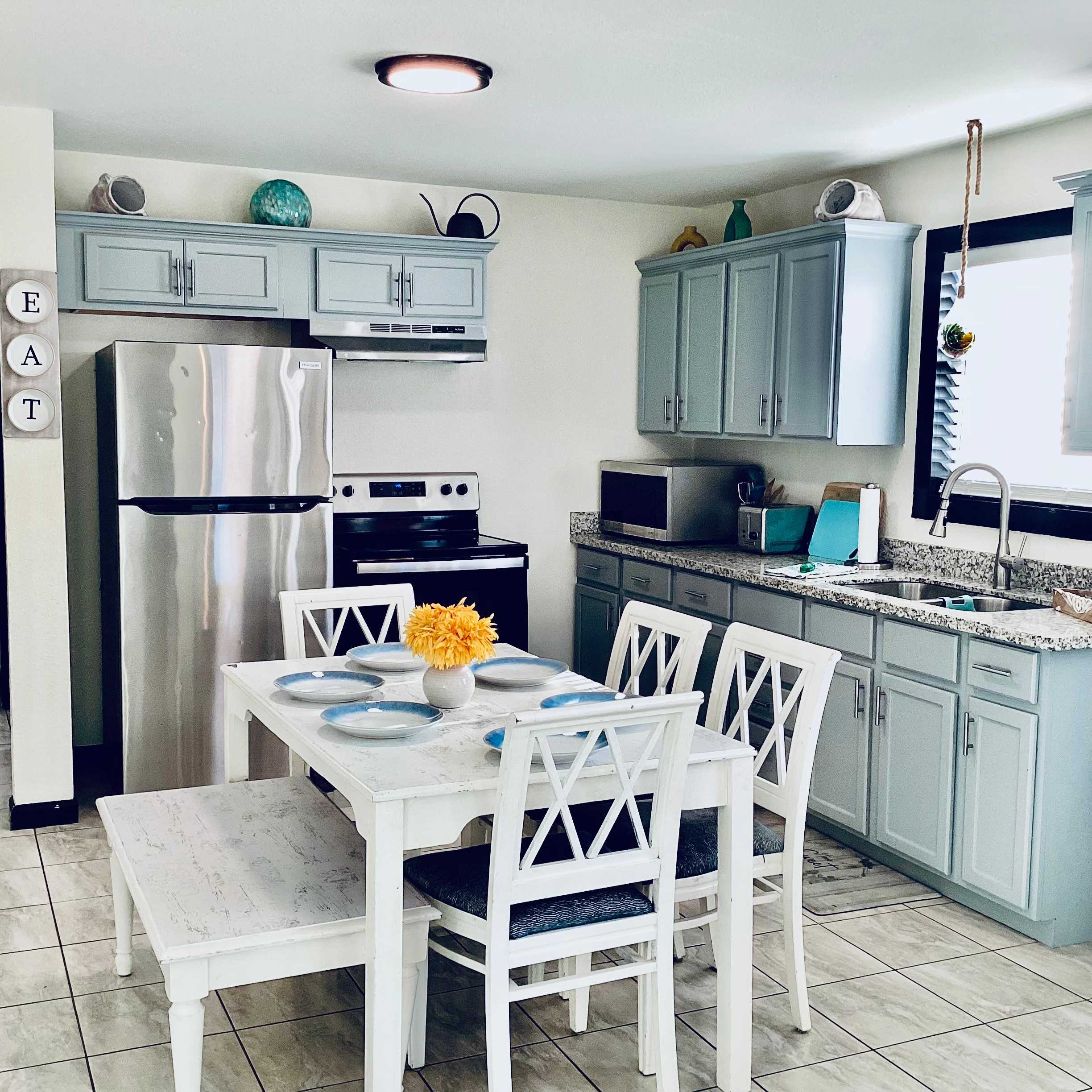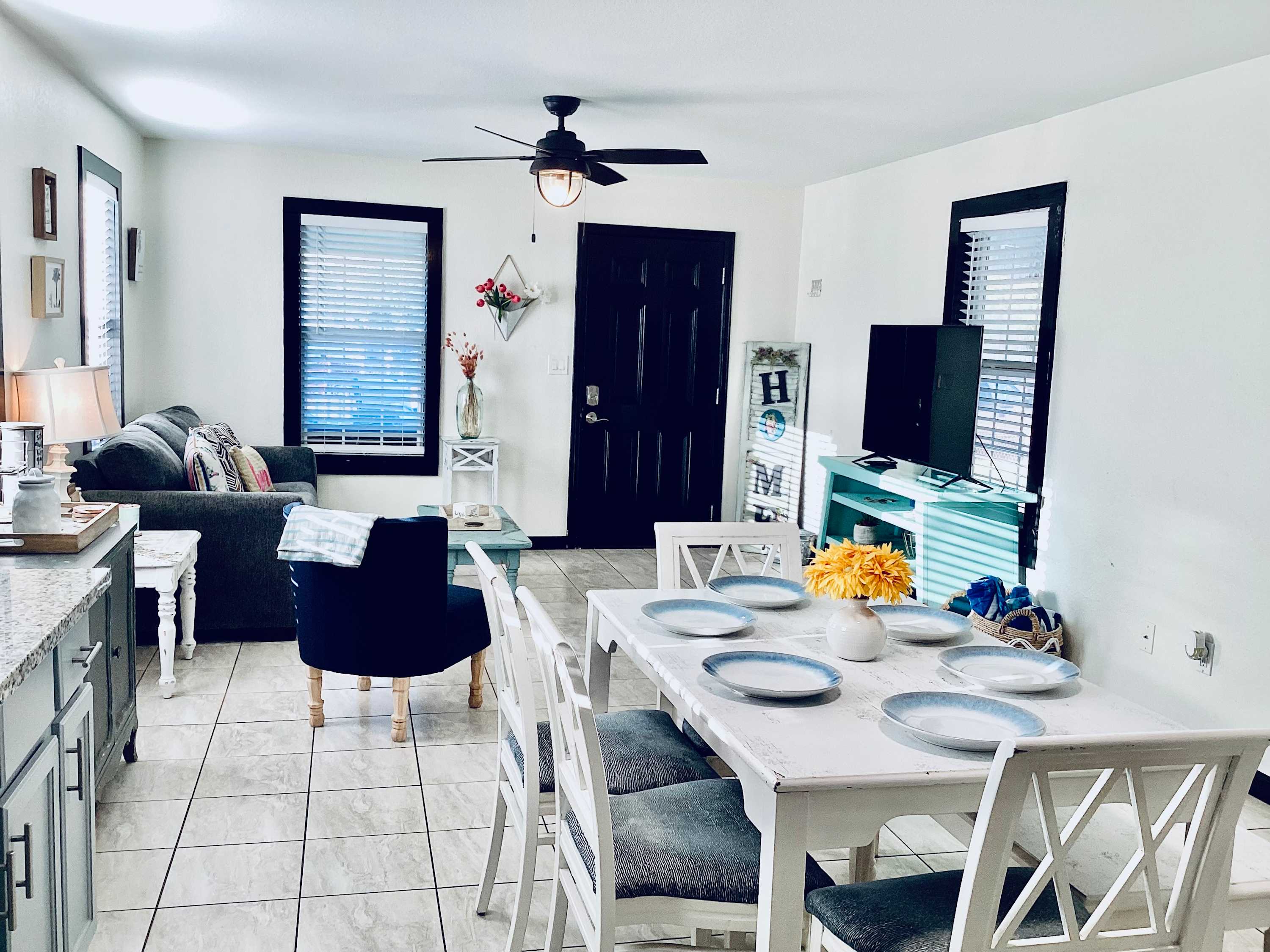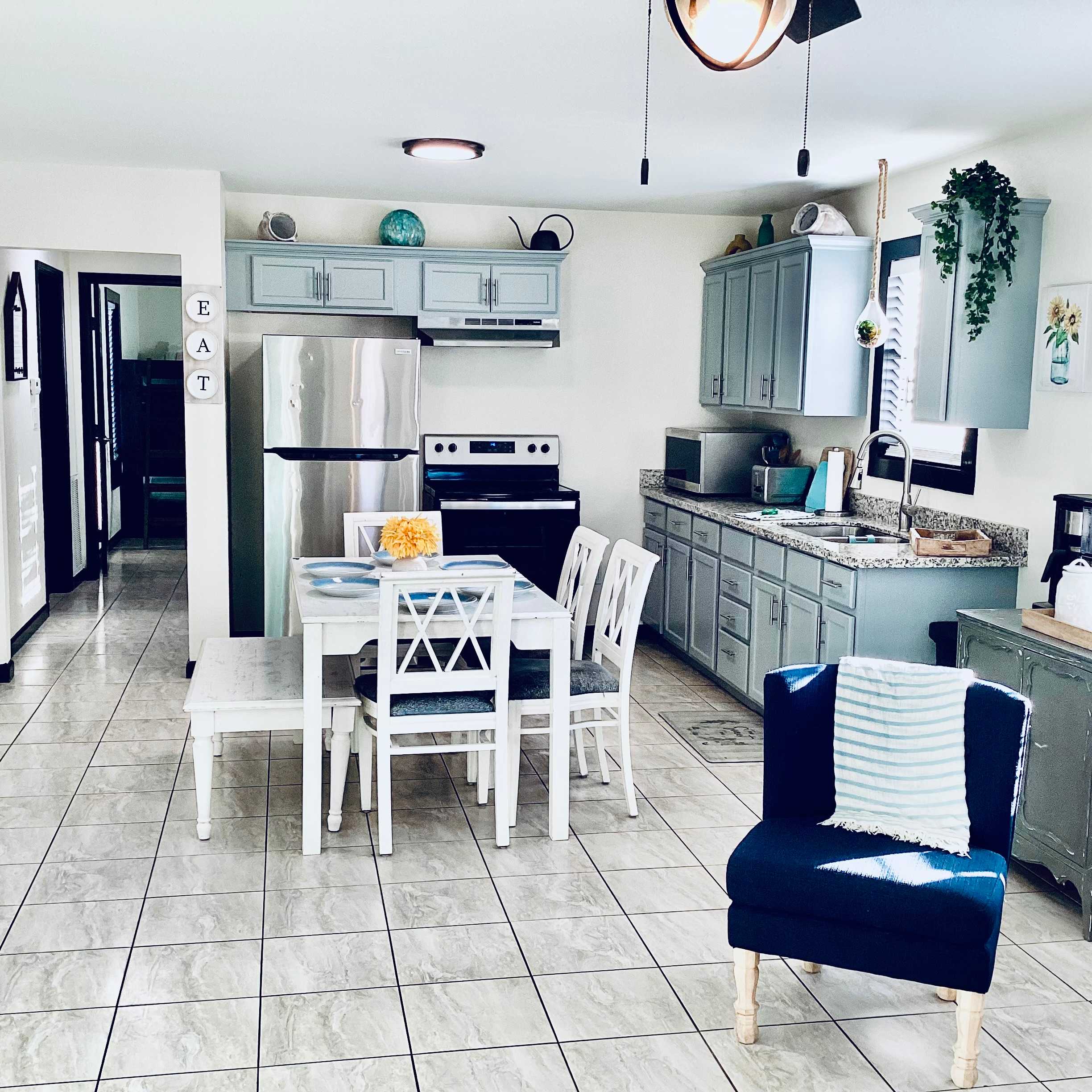 Step inside and feel instantly at home as you enter the warm, open living–kitchen–dining space. The living room invites you to unwind on a cozy couch in front of the smart TV, while natural light and chic furnishings give the space the perfect blend of charm and comfort. The kitchen continues the home’s warm and welcoming vibe with stainless steel appliances, a dedicated coffee station, and plenty of room to prepare meals together. Just steps away, the dining area offers seating for six with a mix of chairs and bench seating—ideal for family meals or lingering conversations after a fun day exploring the island.