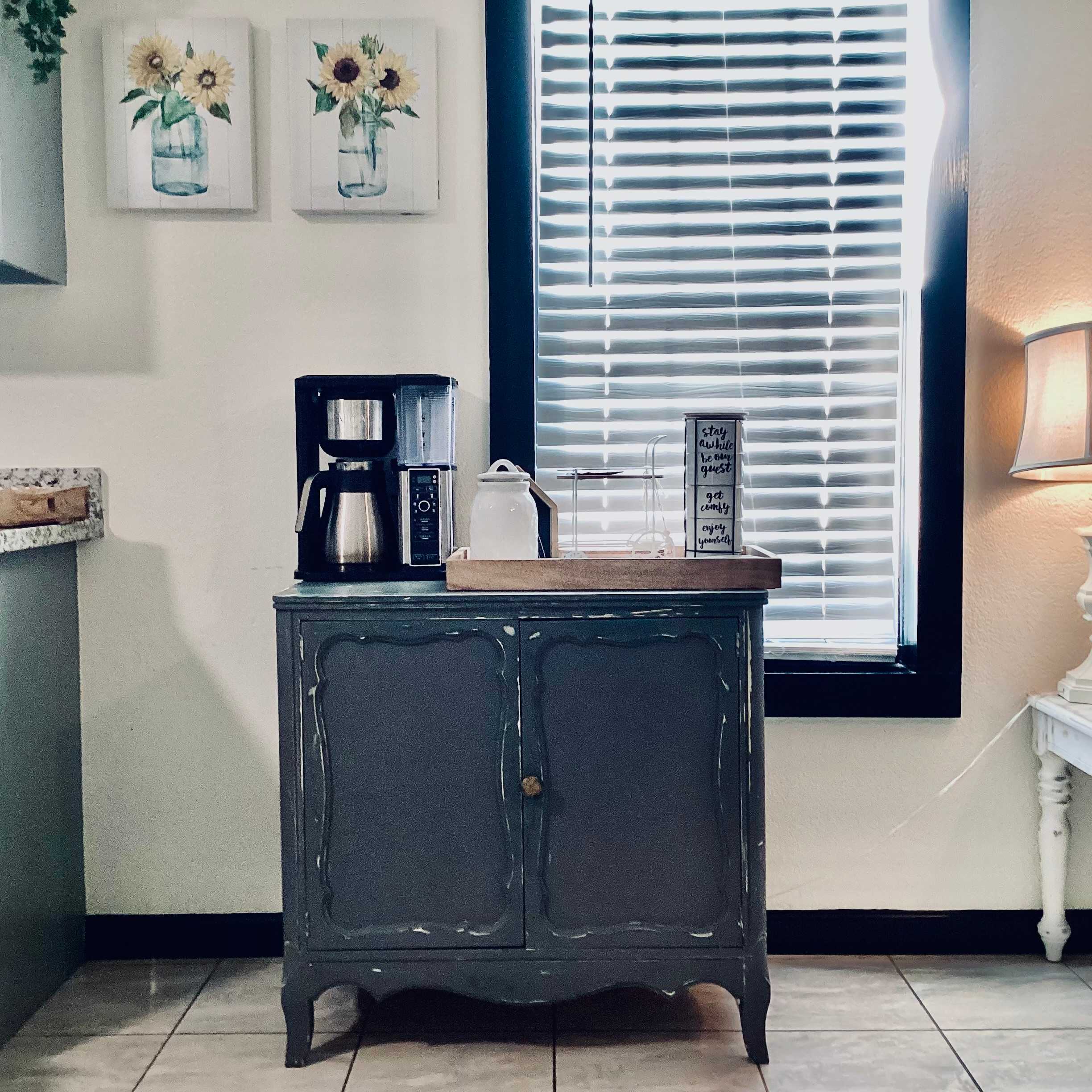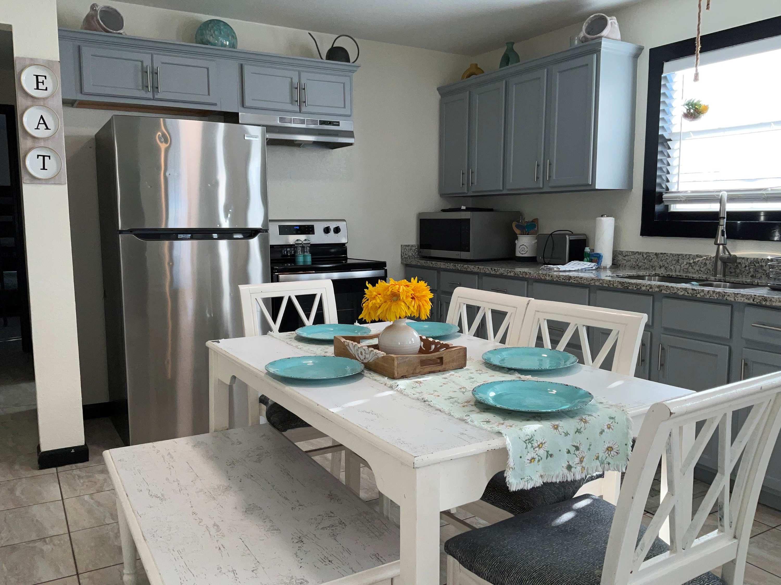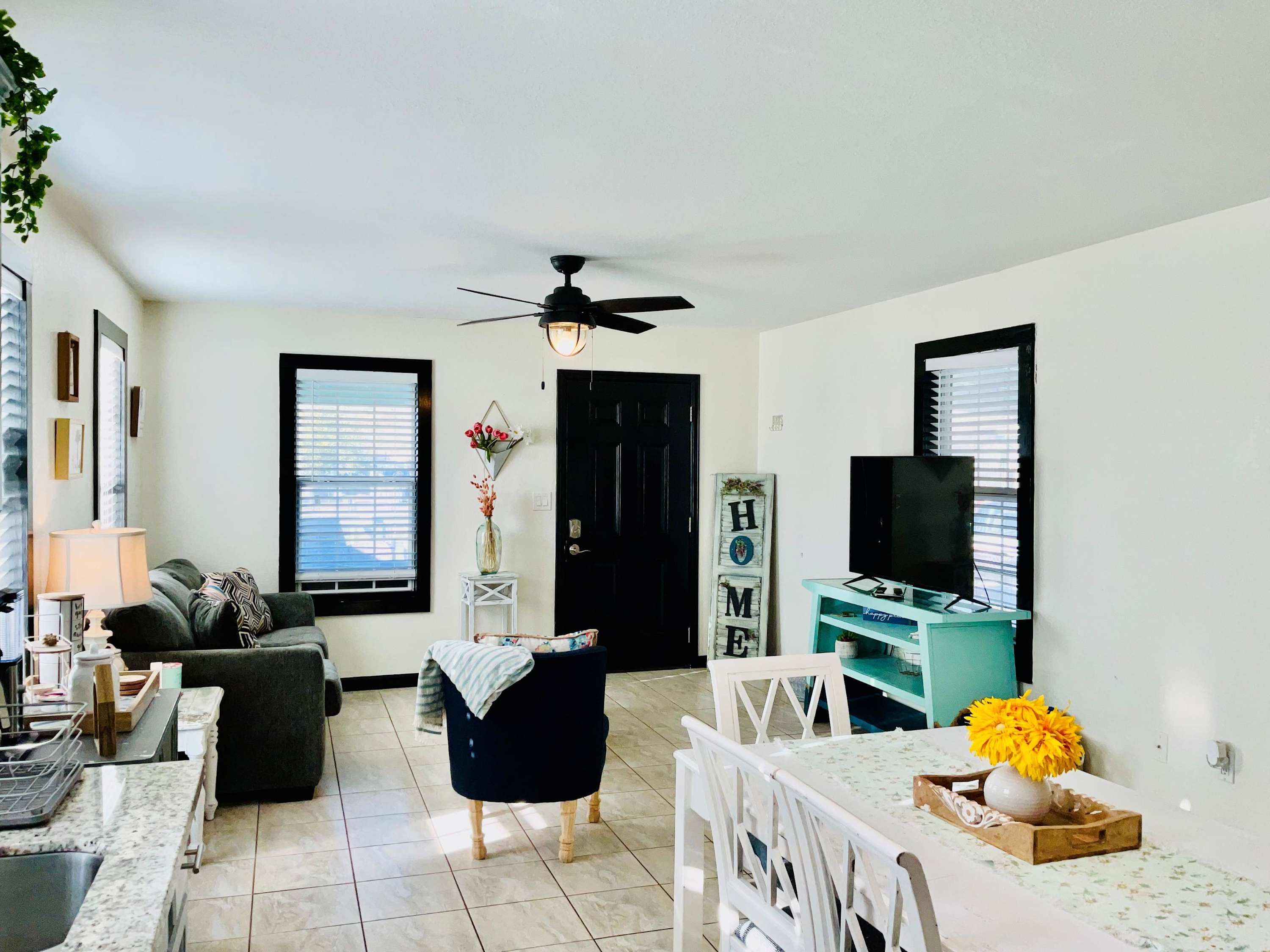 Step inside and feel instantly at home as you enter the warm, open living–kitchen–dining space. The living room invites you to unwind on a cozy couch in front of the smart TV, while natural light and chic furnishings give the space the perfect blend of charm and comfort. The kitchen continues the home’s warm and welcoming vibe with stainless steel appliances, a dedicated coffee station, and plenty of room to prepare meals together. Just steps away, the dining area offers seating for six with a mix of chairs and bench seating—ideal for family meals or lingering conversations after a fun day exploring the island.