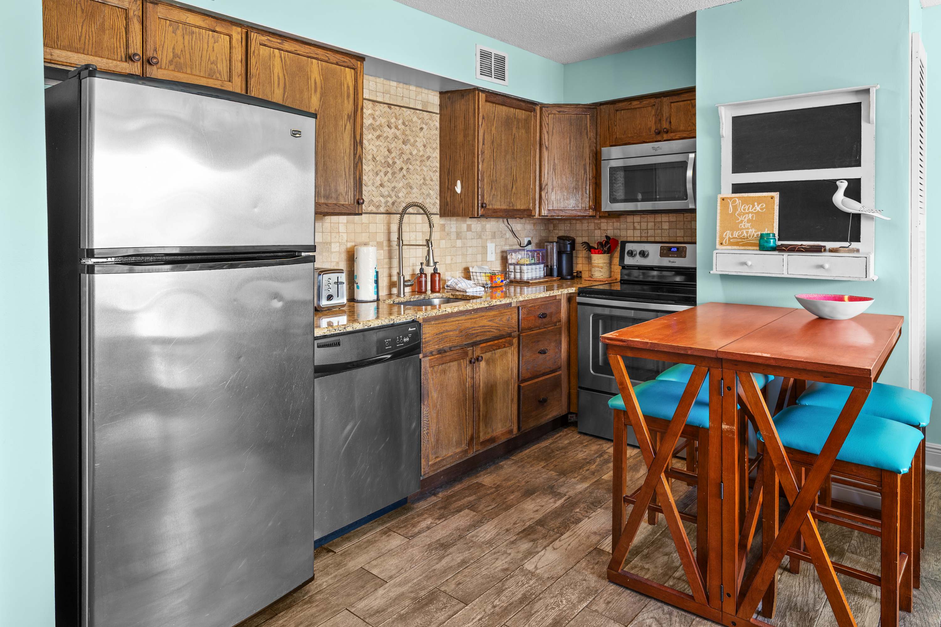 With a huge fridge to stuff all of your beach snacks and a dining table that transitions *perfectly* into a card game gathering spot, this kitchen just might end up being your favorite room in the home.