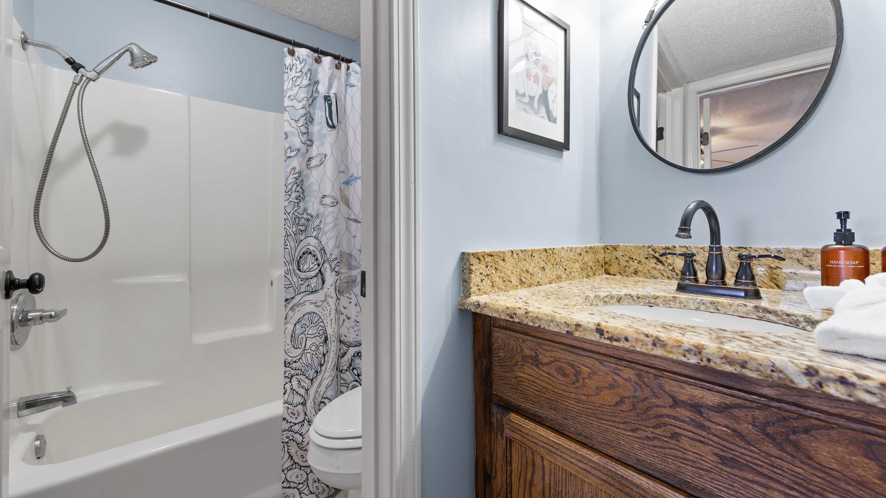 Your full bathroom has a vanity, a shower/tub combo, and a few toiletry essentials to help keep everyone fresh, clean, and sand-free during your vacation.