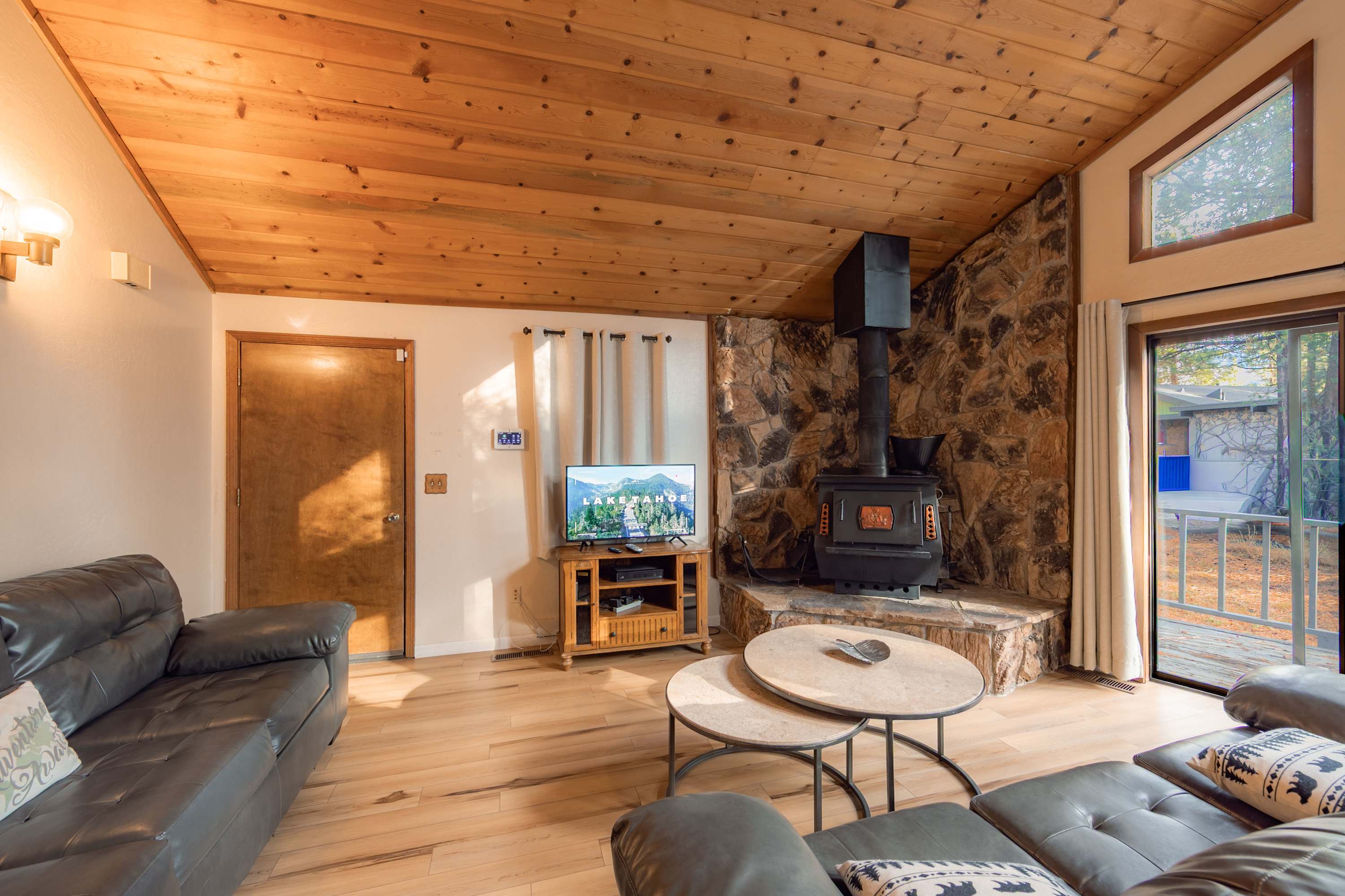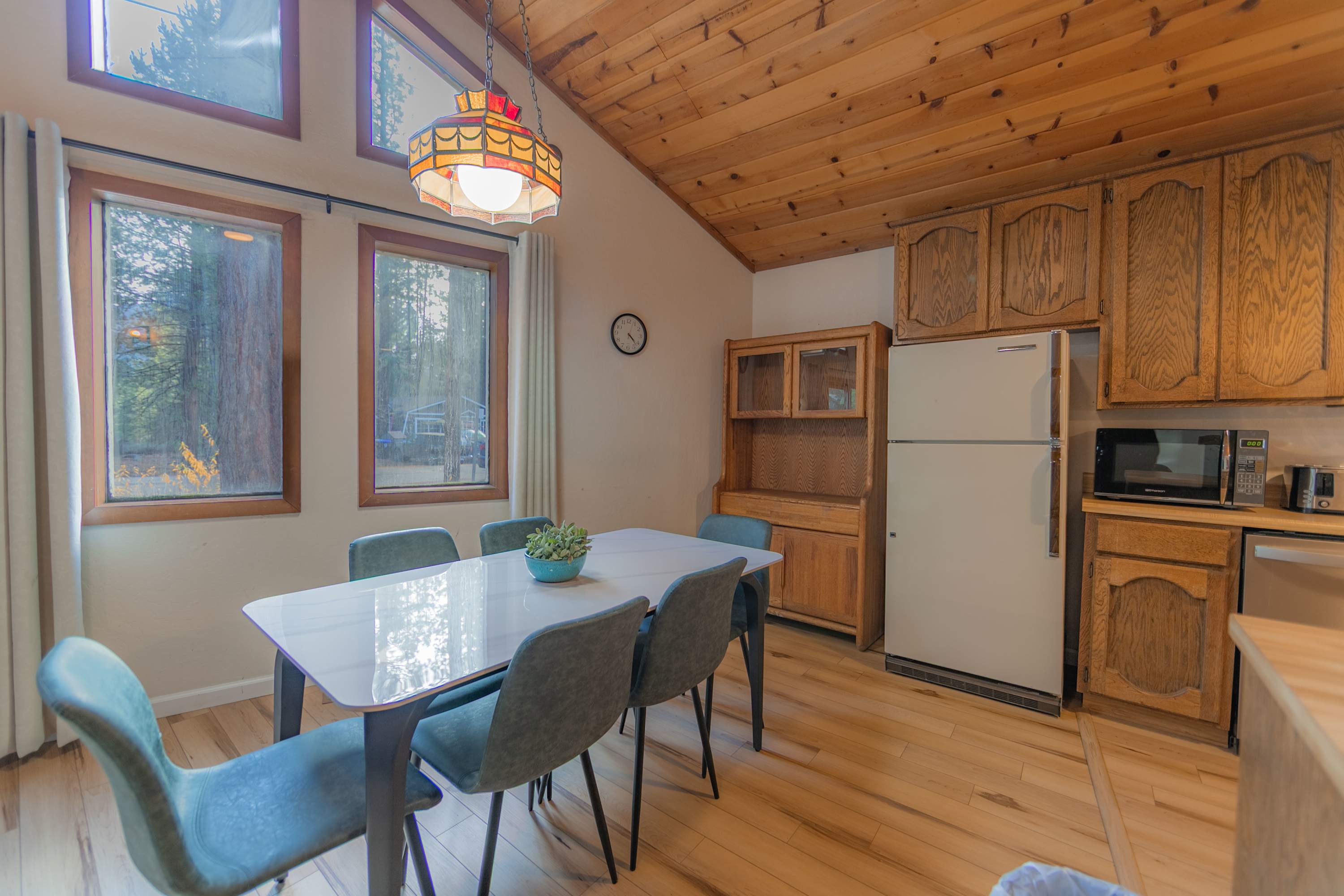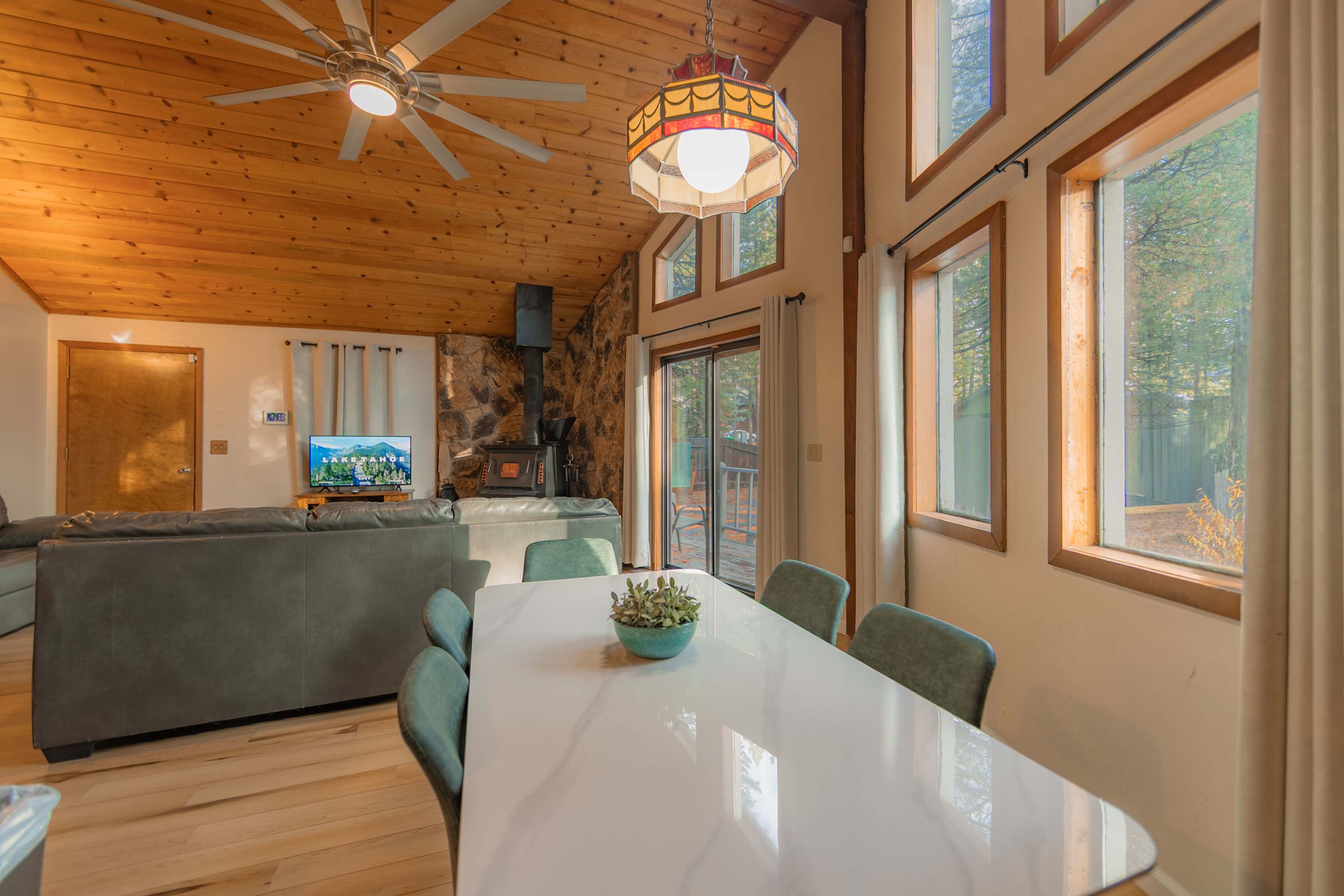 Sharing meals comes naturally at the dining table for six, where you can enjoy great food, conversation, and views of the forest surroundings. With its cozy atmosphere, classic Tahoe character, and thoughtful layout, this cabin-style retreat gives you all the comfort and charm you need for a memorable South Lake Tahoe getaway.