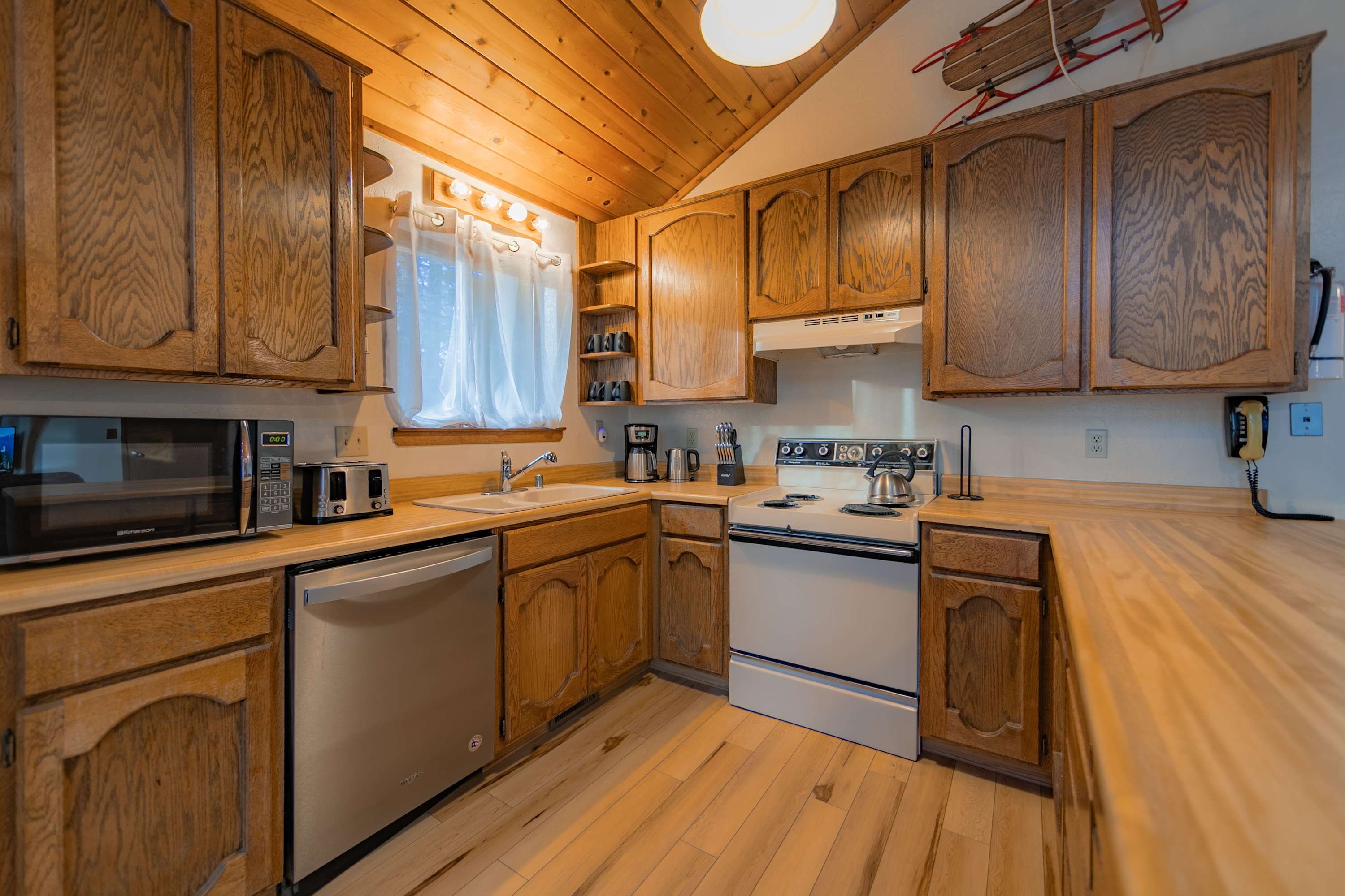 Step into a warm and inviting living room, where high peaked ceilings and abundant natural light create an open, airy feel. Settle into one of the two comfortable couches, and unwind with a movie on the cable TV after a day in the mountains. Just beyond, the charming rustic kitchen offers counter seating for four and is stocked with all the essentials you’ll need for cooking at home. Whether you’re preparing a hearty breakfast before hitting the slopes or a relaxed dinner after a day on the trails, this space makes it easy and enjoyable.