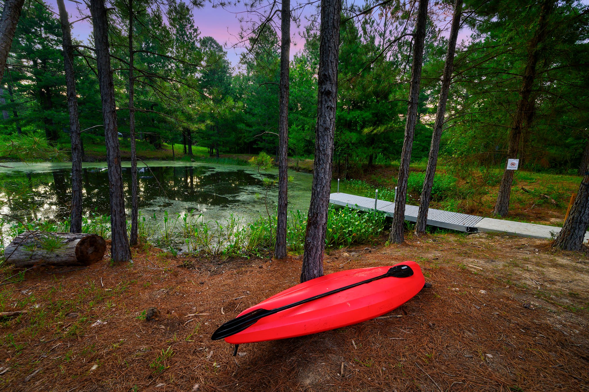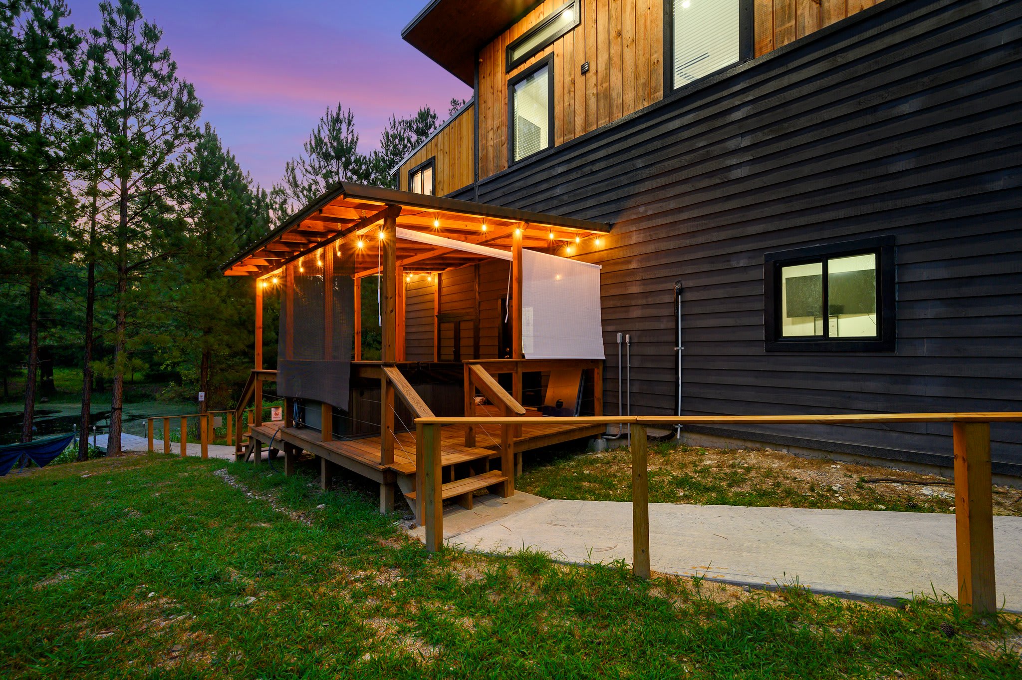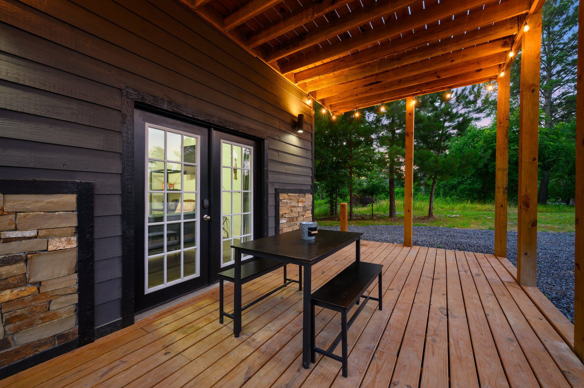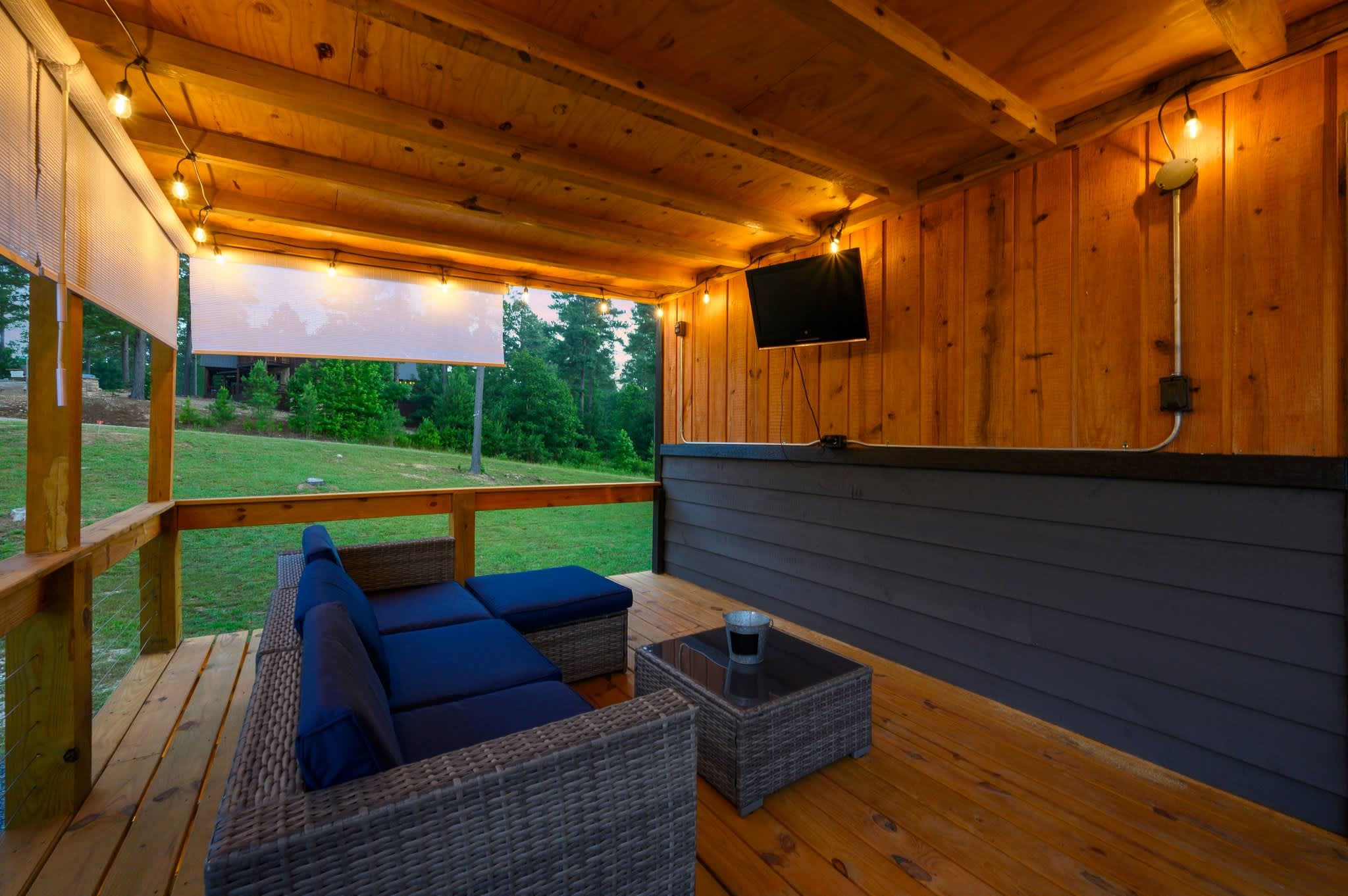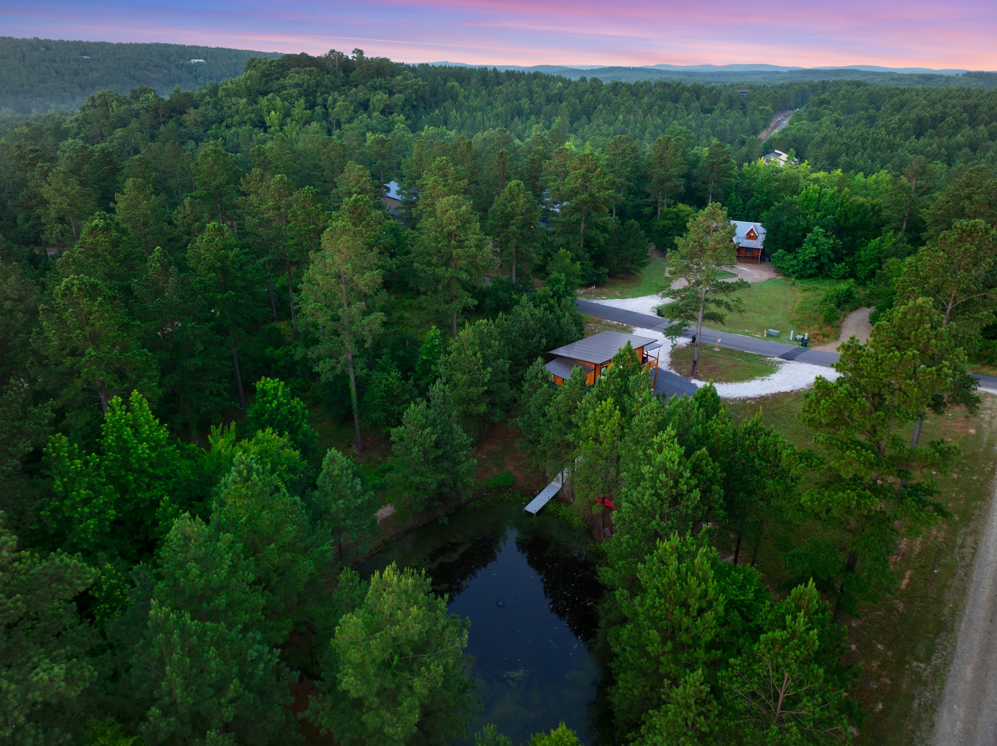 Outside, the cabin truly shines. A pond right behind the home invites you to take the provided kayak out for a peaceful paddle. The lower deck offers a table for alfresco dining and a hot tub where you can unwind beneath the stars. Head upstairs to the upper deck, where you’ll find comfortable seating, a grill, and even an outdoor smart TV—a perfect hangout space day or night. And when the evening cools, gather around the fire pit, surrounded by ample seating, for s’mores, stories, and stargazing. With its flexible two-level design, scenic pond setting, and a full suite of indoor and outdoor comforts, this Broken Bow getaway offers a stay that’s both memorable and effortlessly relaxing.