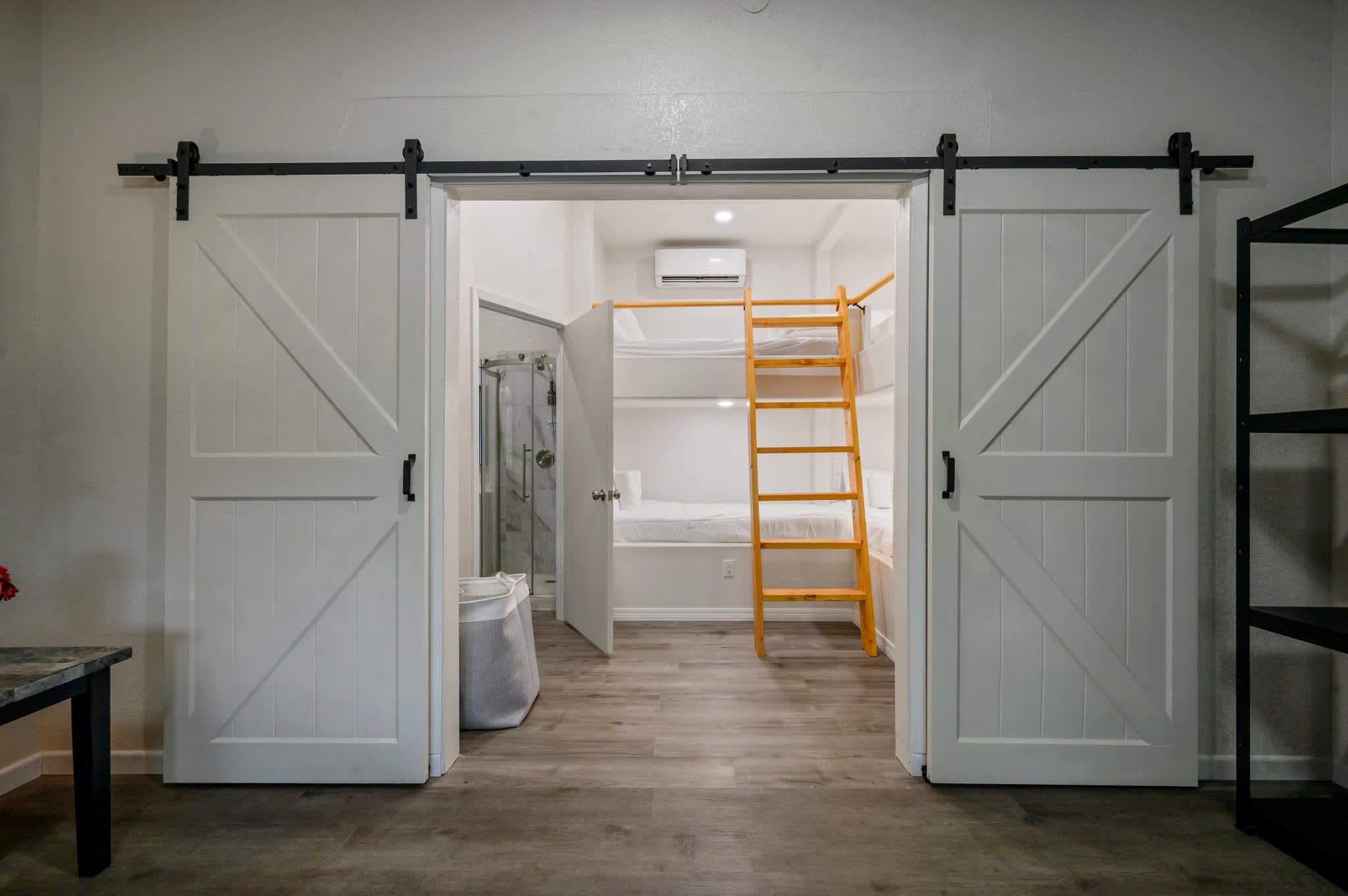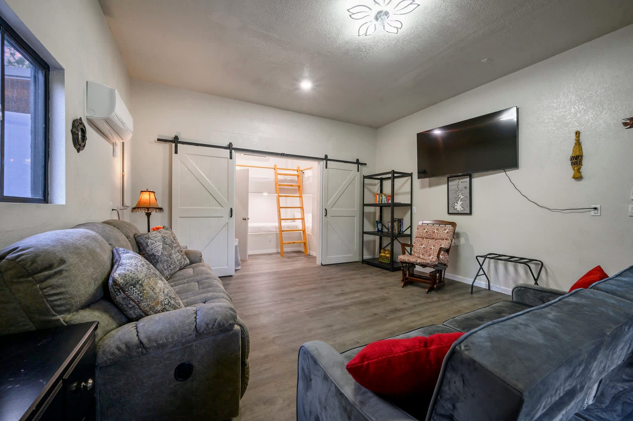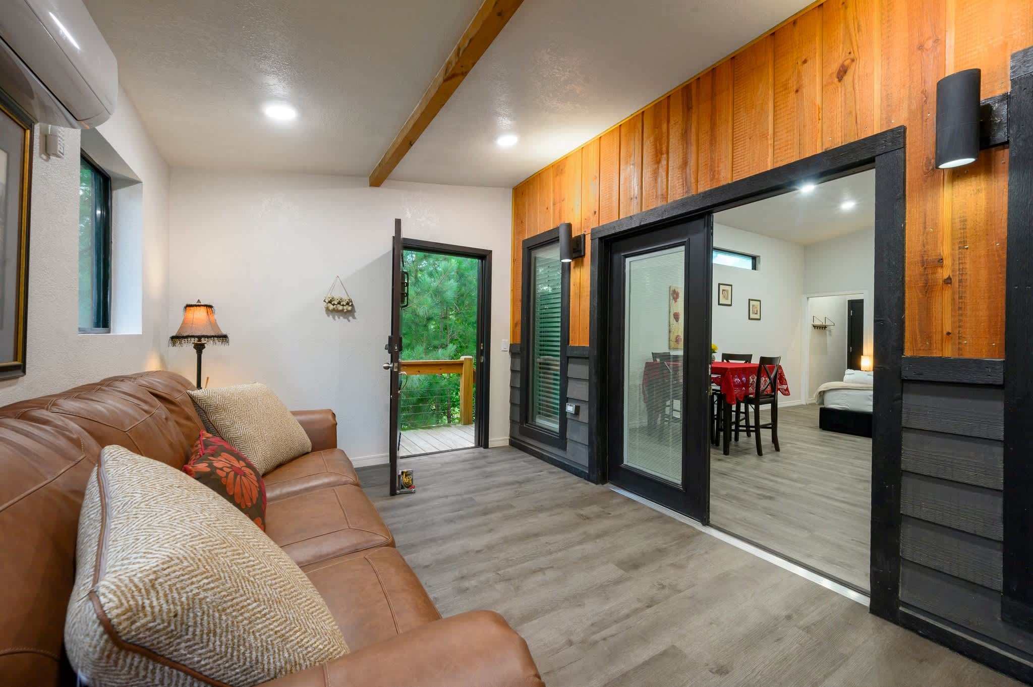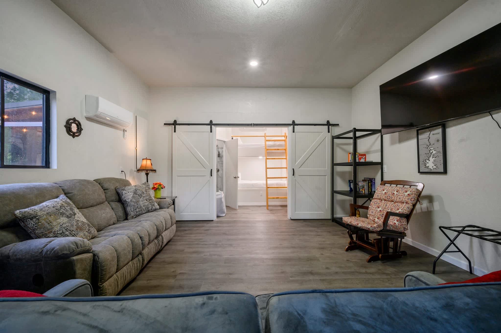 Head inside the upper level first, a private studio-style suite complete with its own compact but fully equipped kitchen, sleeping area, and bathroom—all filled with warm cabin charm. The open living area offers a couch and smart TV, perfect for cozy evenings, and a dining table for four sits beside the well-appointed kitchen featuring a Keurig for easy mornings. Slide open the door to your private balcony, where you can sip coffee in the trees or enjoy the peaceful view. Because the home’s two levels are not connected by interior stairs, the downstairs becomes a spacious retreat of its own. Walk in to find a large, airy living area with a couch, love seat, and smart TV, ideal for movie nights or relaxing after a day outdoors. Barn doors open to reveal the sleeping area, creating both openness and privacy when you need it. A selection of board games adds plenty of fun for families and groups.