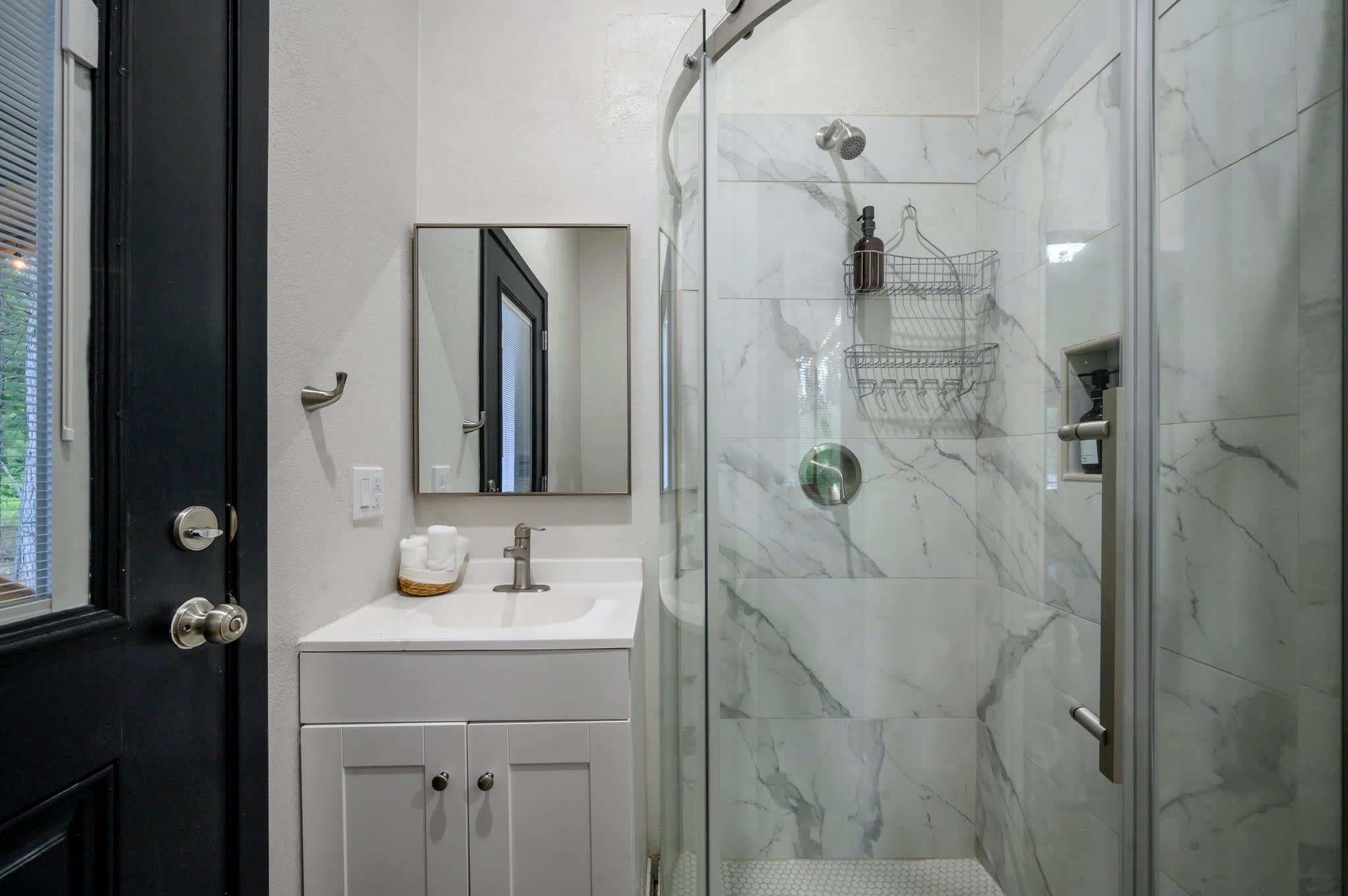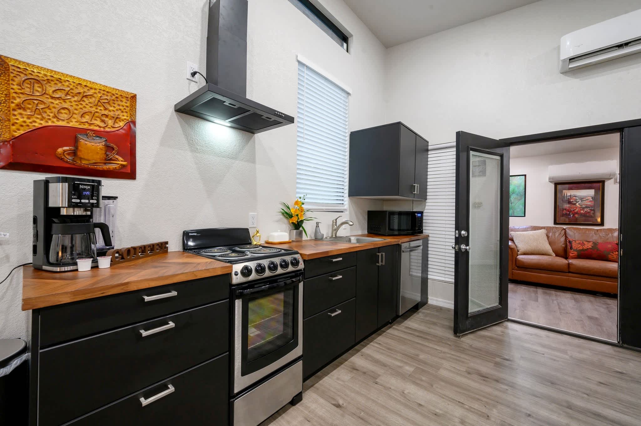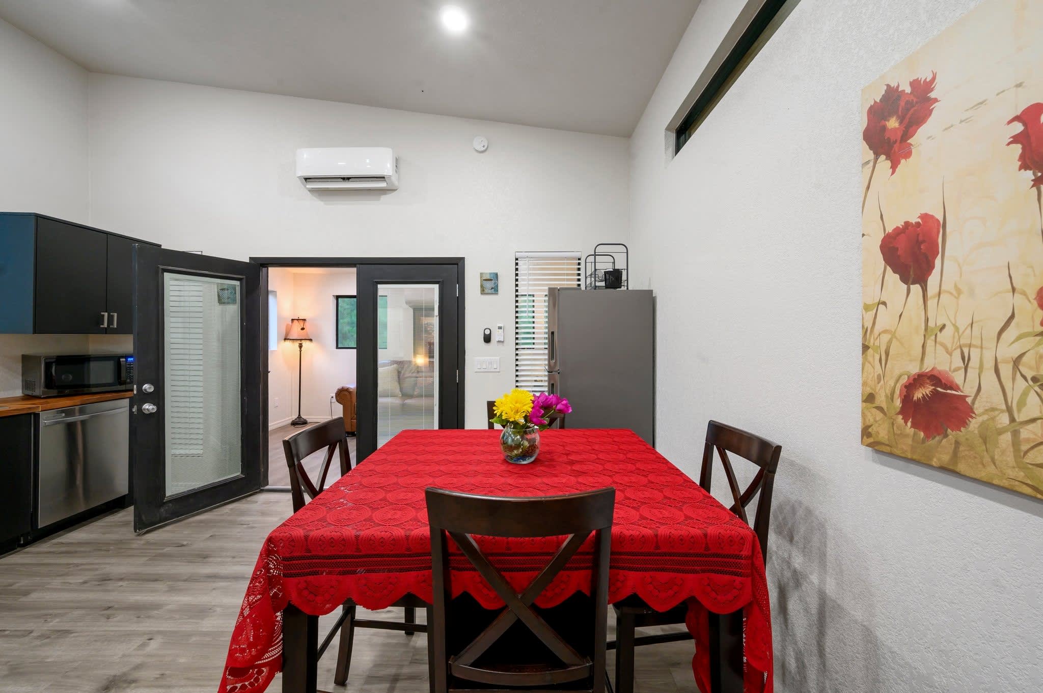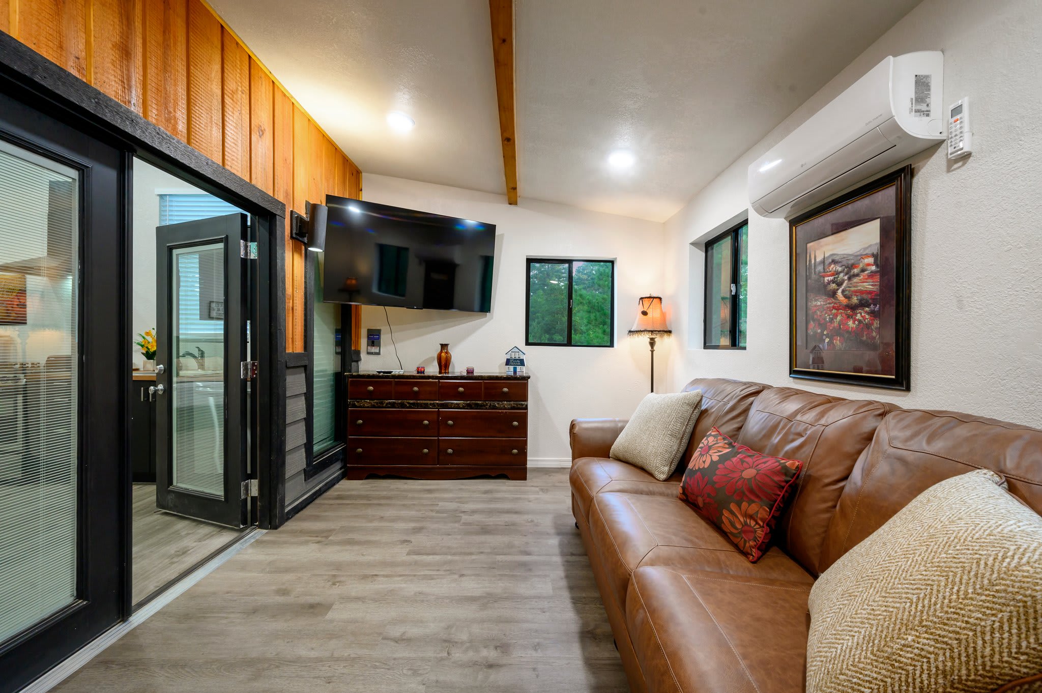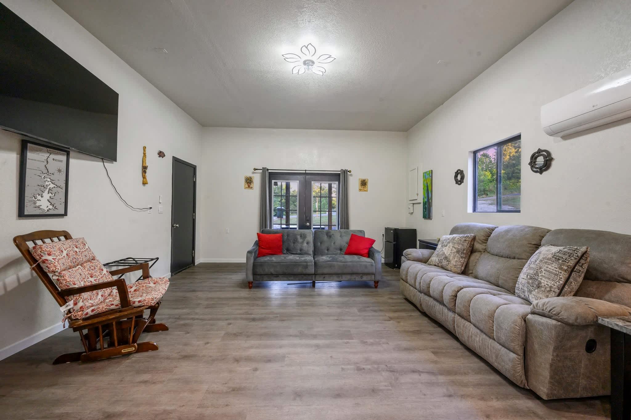 Head inside the upper level first, a private studio-style suite complete with its own compact but fully equipped kitchen, sleeping area, and bathroom—all filled with warm cabin charm. The open living area offers a couch and smart TV, perfect for cozy evenings, and a dining table for four sits beside the well-appointed kitchen featuring a Keurig for easy mornings. Slide open the door to your private balcony, where you can sip coffee in the trees or enjoy the peaceful view. Because the home’s two levels are not connected by interior stairs, the downstairs becomes a spacious retreat of its own. Walk in to find a large, airy living area with a couch, love seat, and smart TV, ideal for movie nights or relaxing after a day outdoors. Barn doors open to reveal the sleeping area, creating both openness and privacy when you need it. A selection of board games adds plenty of fun for families and groups.