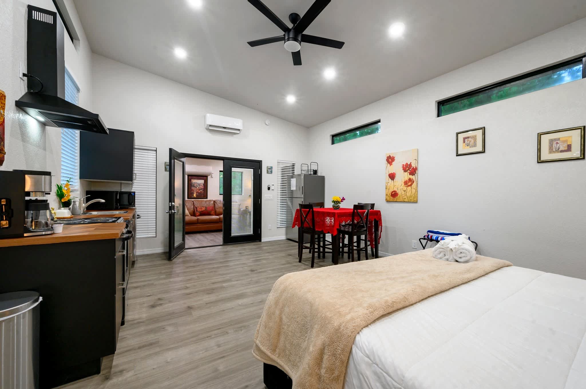This home comfortably sleeps 6 guests between 1 private bedroom and a studio style space.