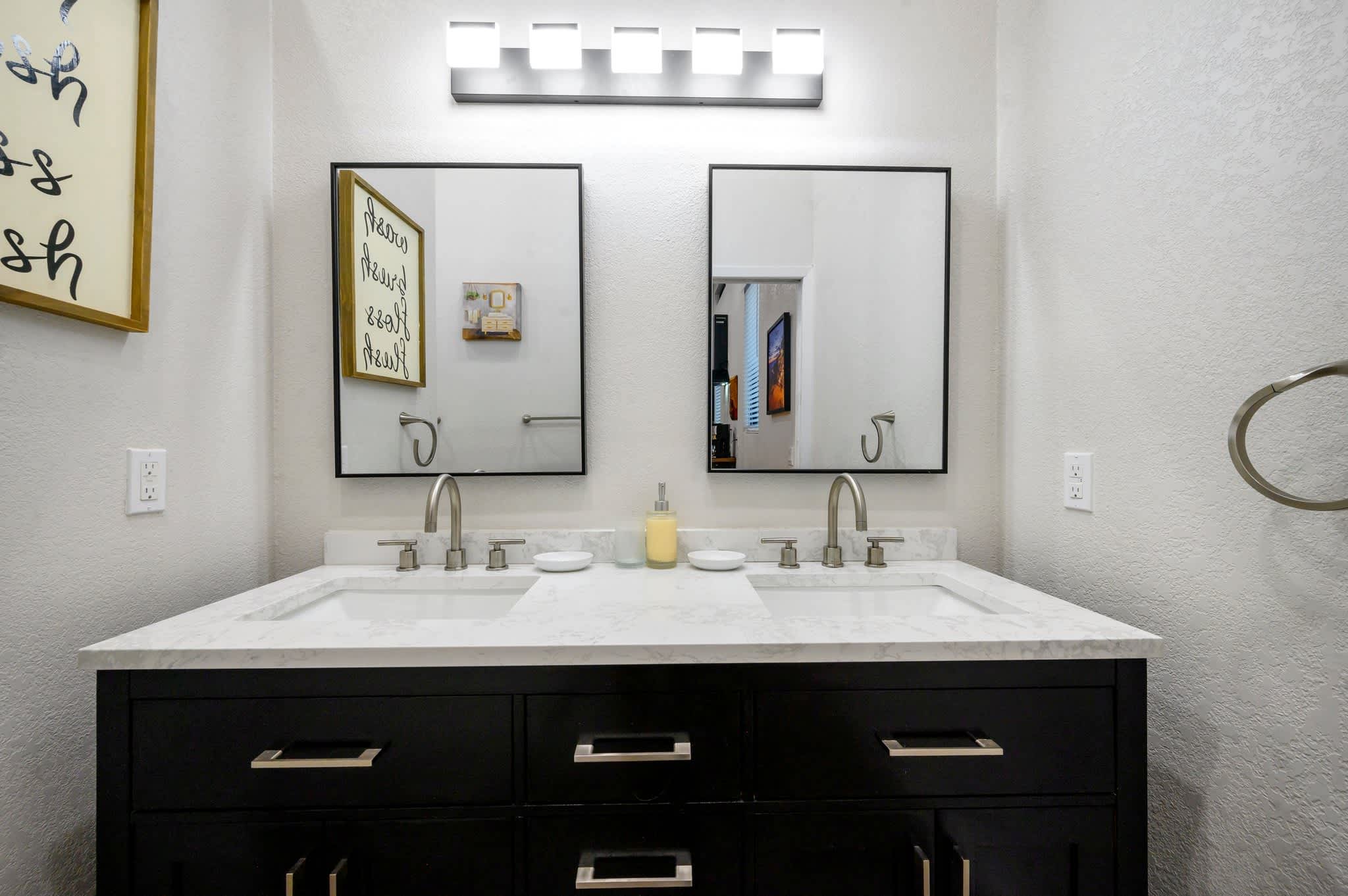 Bedroom #1 includes a 2 twin-over-twin bunk beds, a smart TV, deck access, and an ensuite bathroom with a dual vanity and a shower/tub combo.