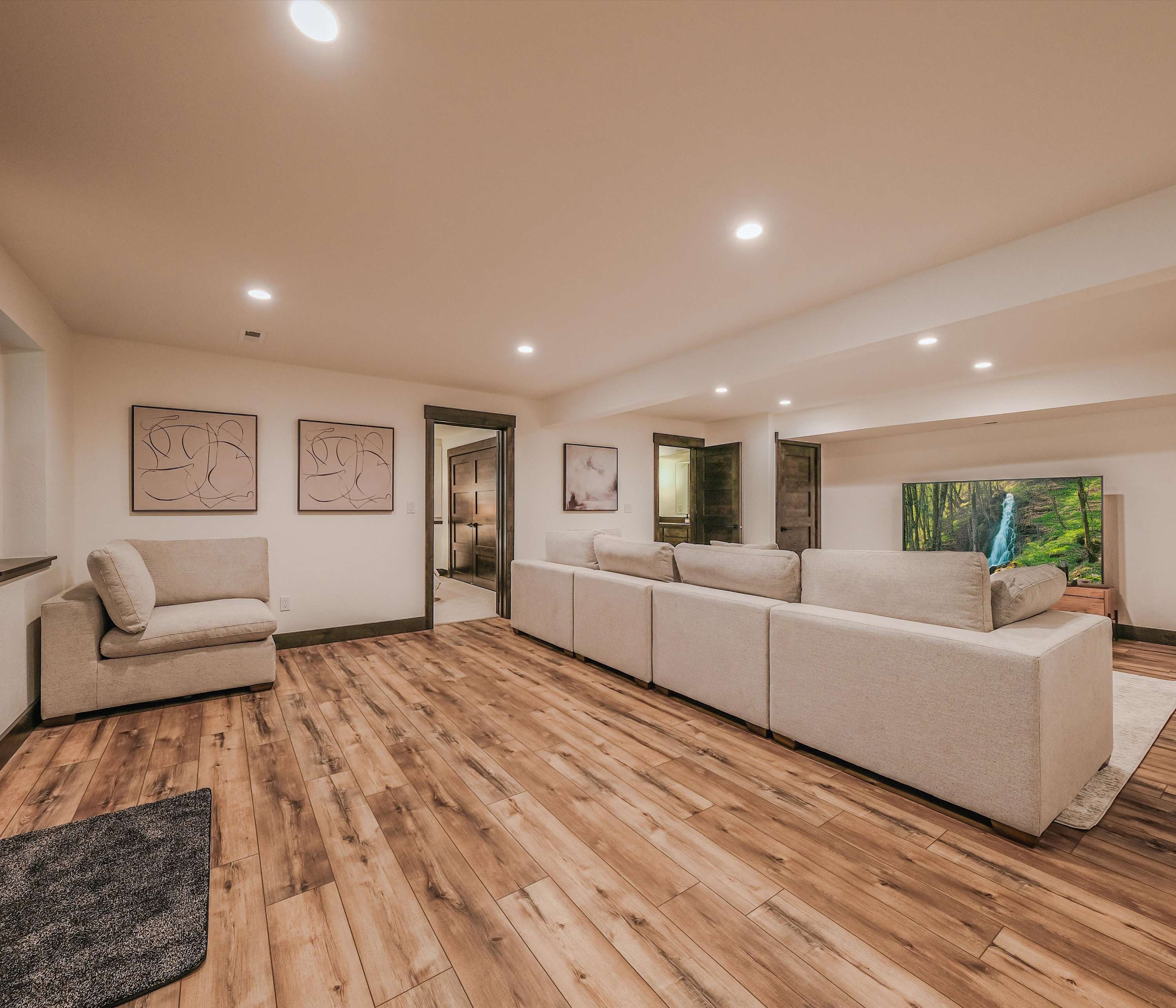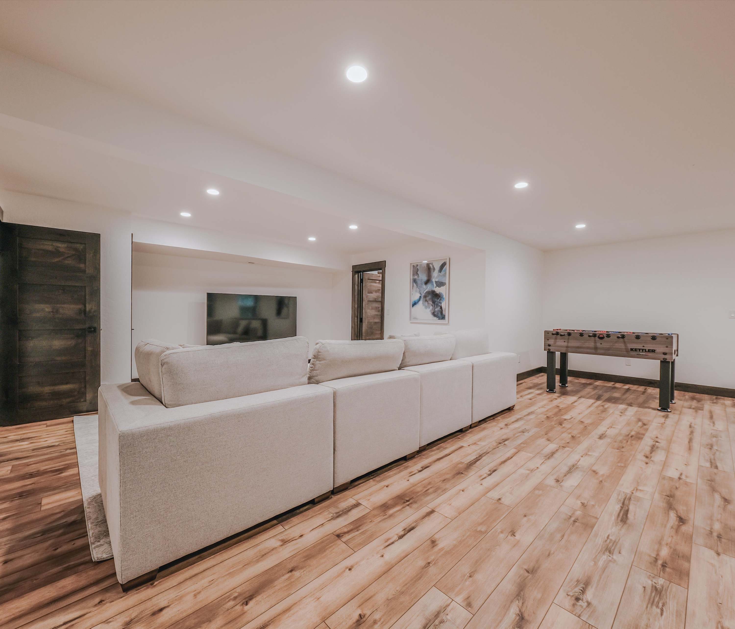 Just a few steps away, a dedicated office provides a quiet workspace with inspiring vistas, complete with a desk and armchair for the ultimate comfort. And when the sun sets but you’re not quite ready to be done for the day, the spacious game room downstairs delivers plenty of fun with a foosball table, smart TV, and an oversized couch ideal for movie nights or lounging together.