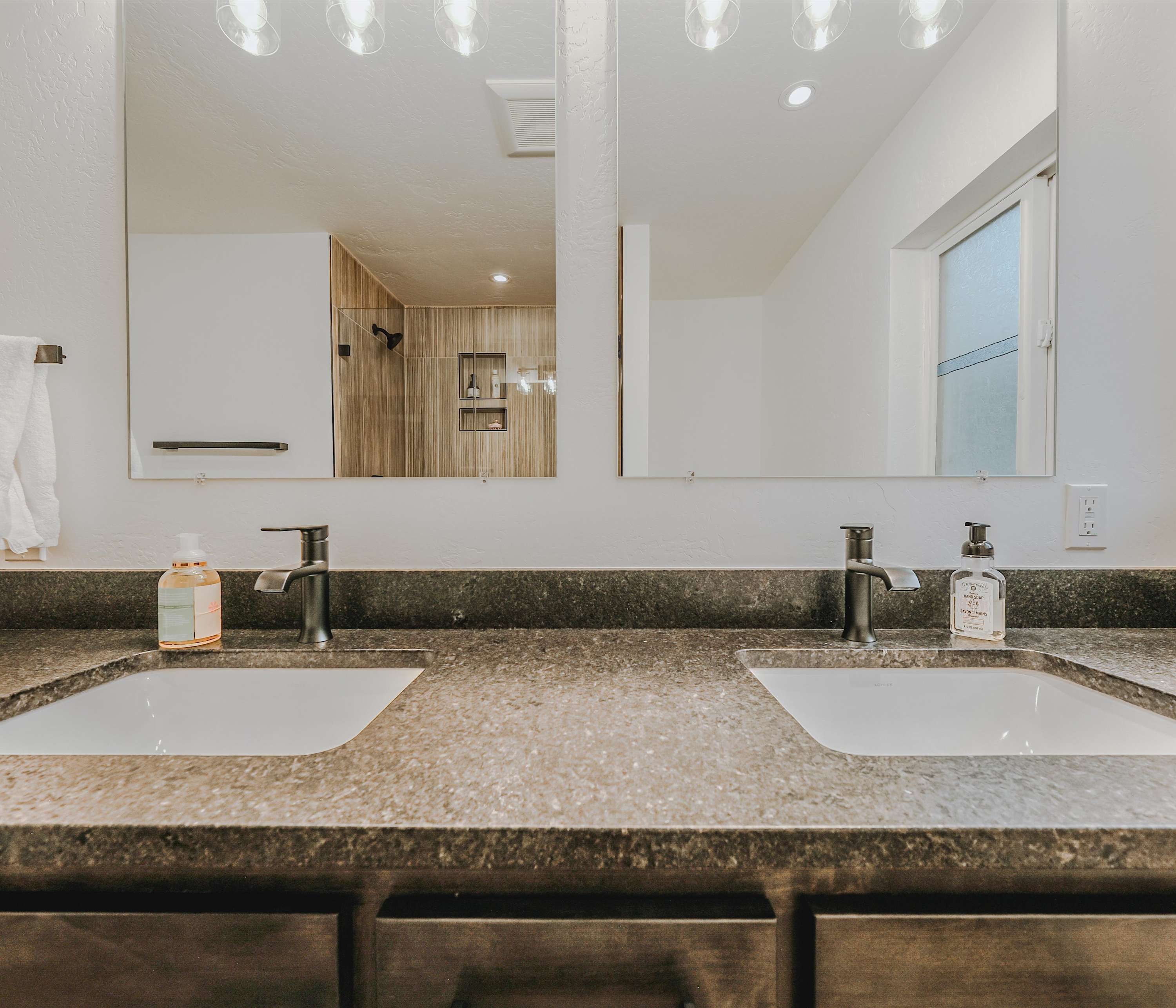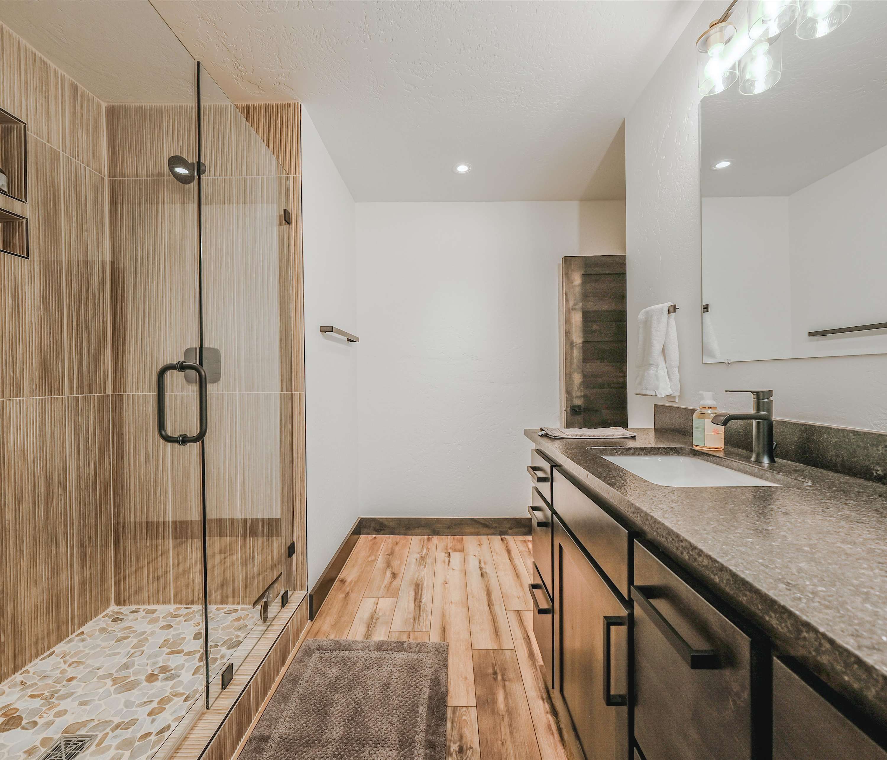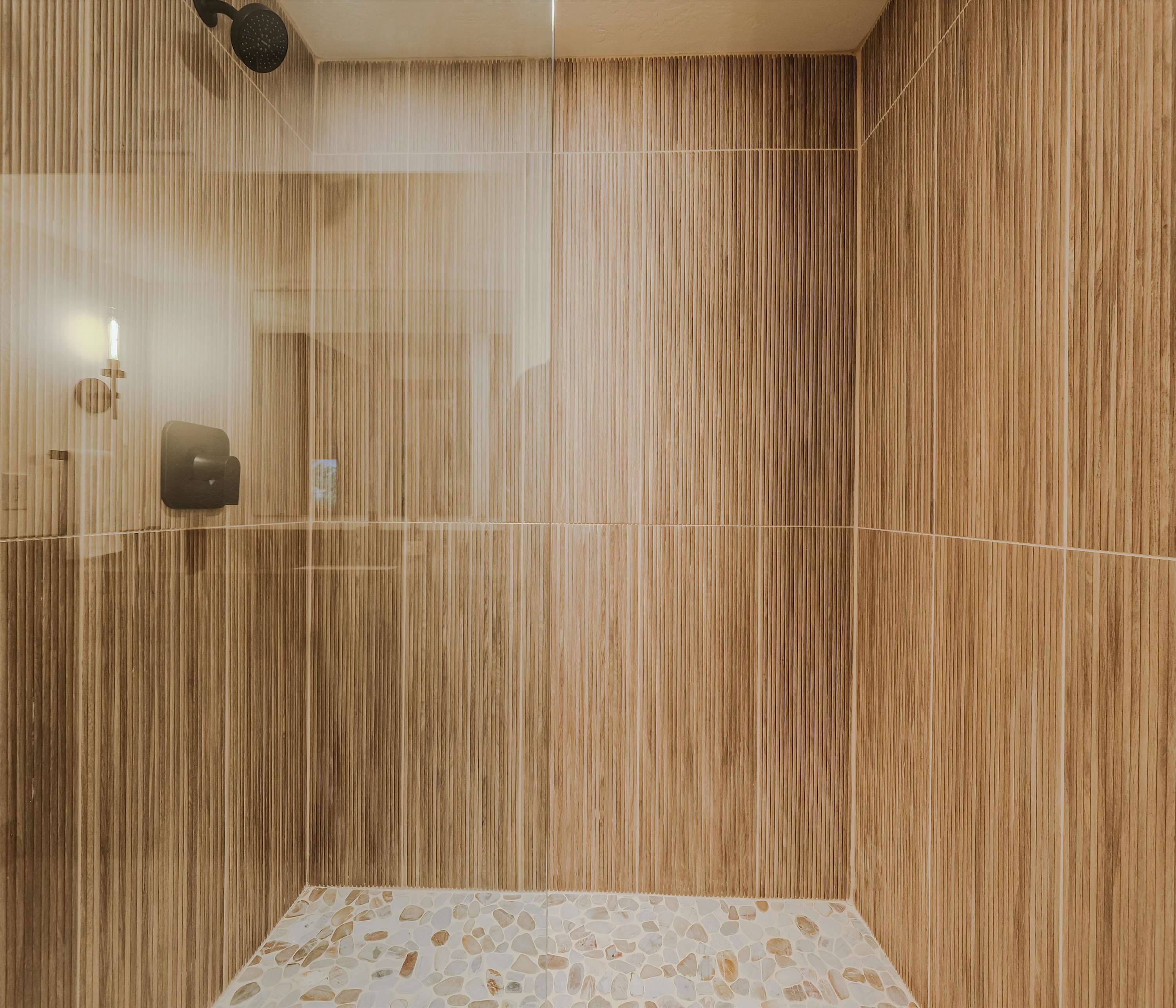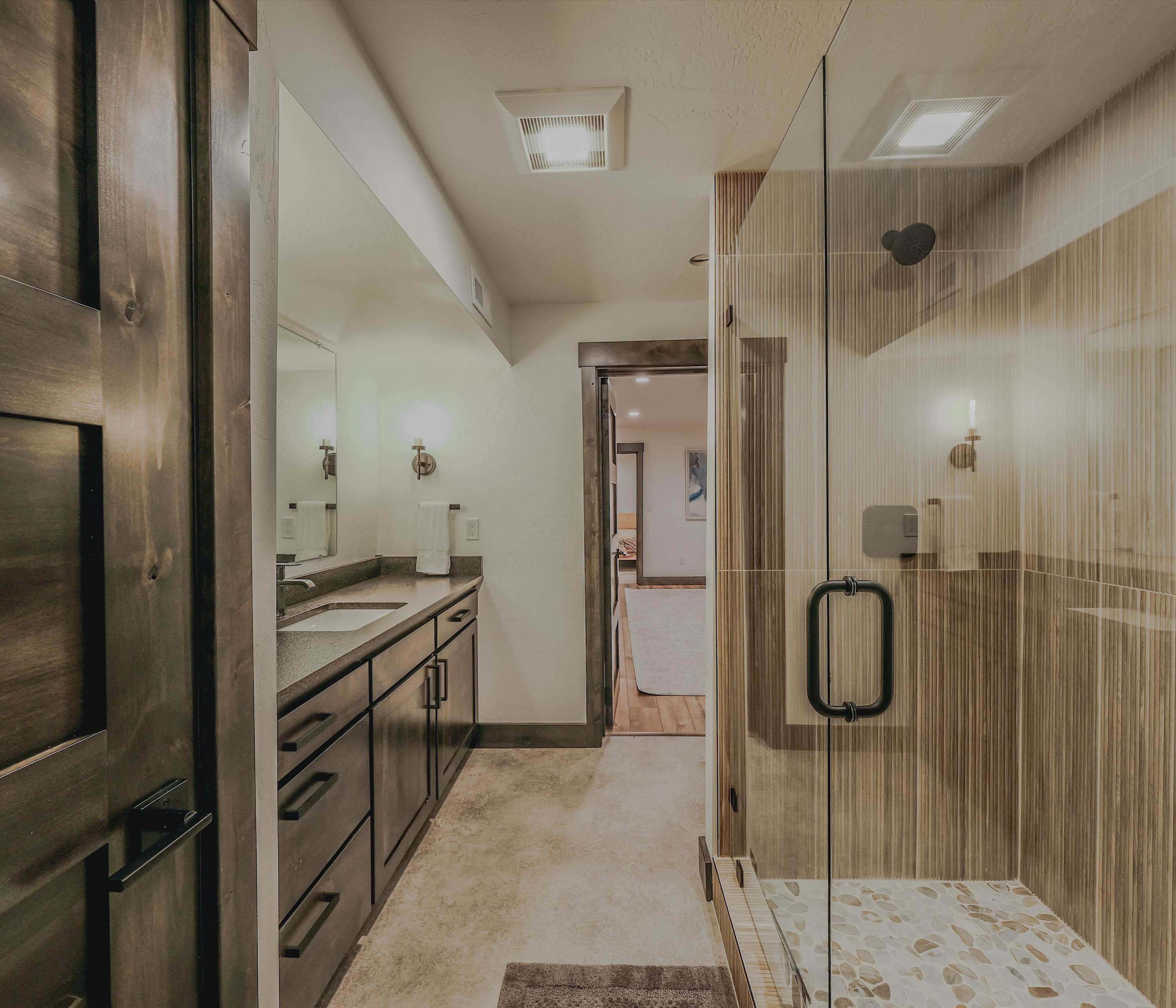 Bedroom #1 includes a king size bed, a smart TV, and an ensuite bathroom with a dual vanity and a walk-in shower.