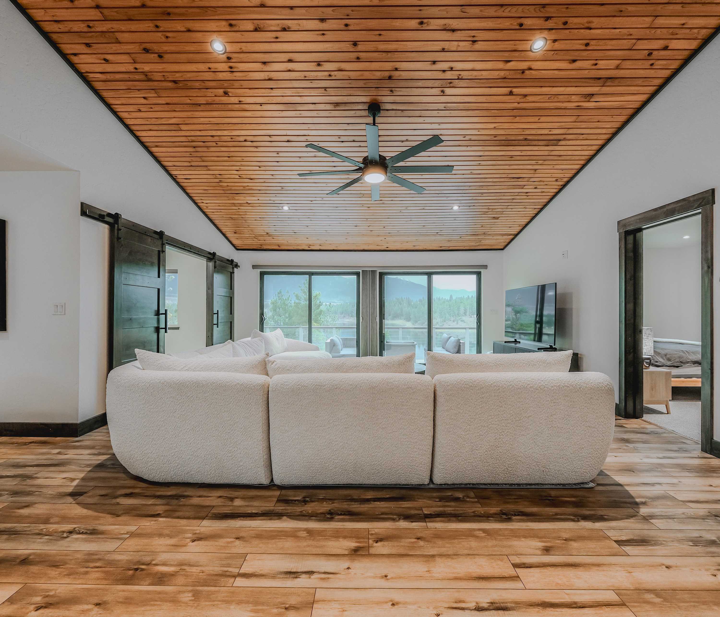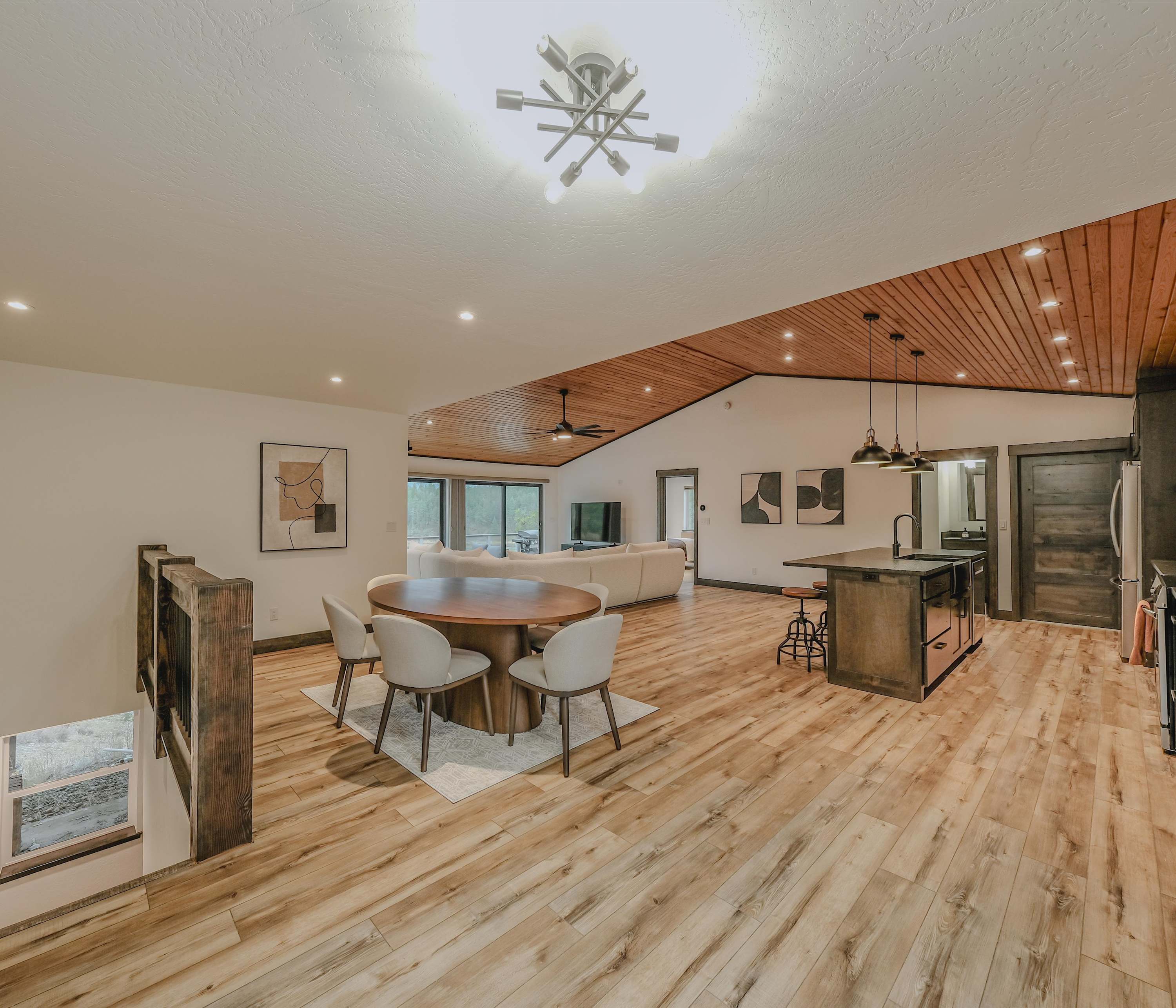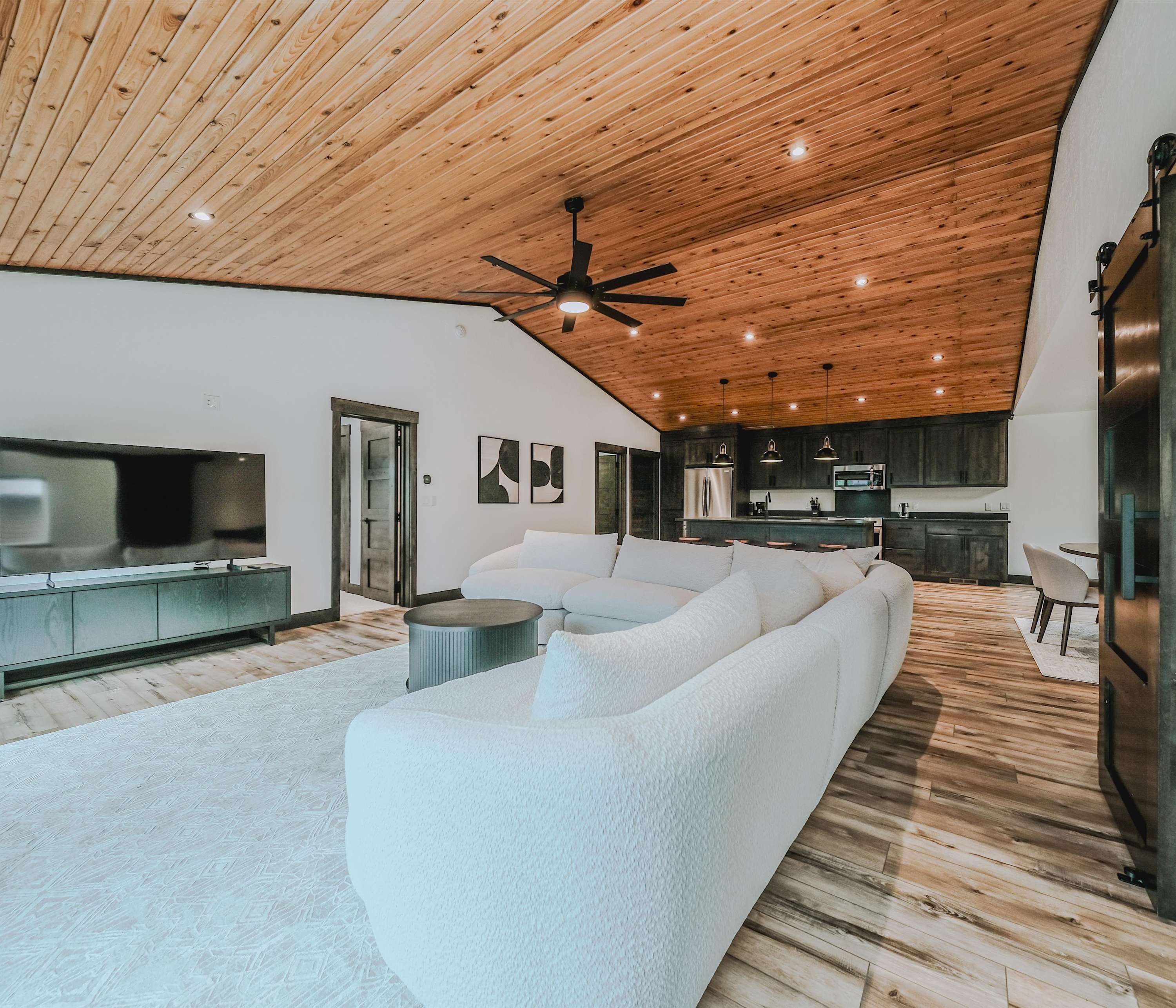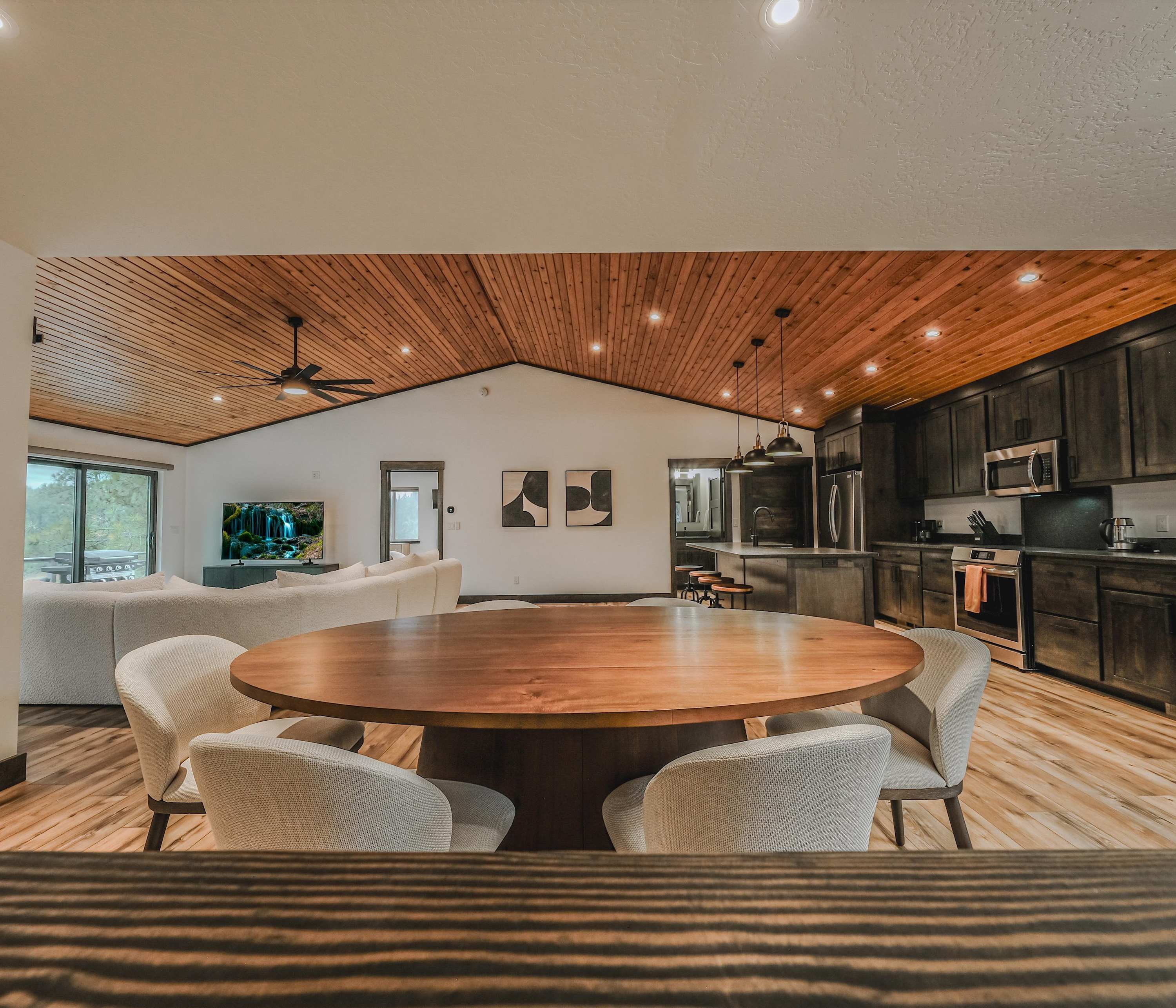 Back inside, you’ll find a modern rustic interior where comfort meets nature. The open-concept living room welcomes you with a cozy couch facing both a smart TV and wide lake views—perfect for relaxing after a day on the water. The kitchen flows seamlessly from here, offering dark cabinetry, stainless steel appliances, and counter seating for four, while a dining table for six sits nearby for shared meals with a view.