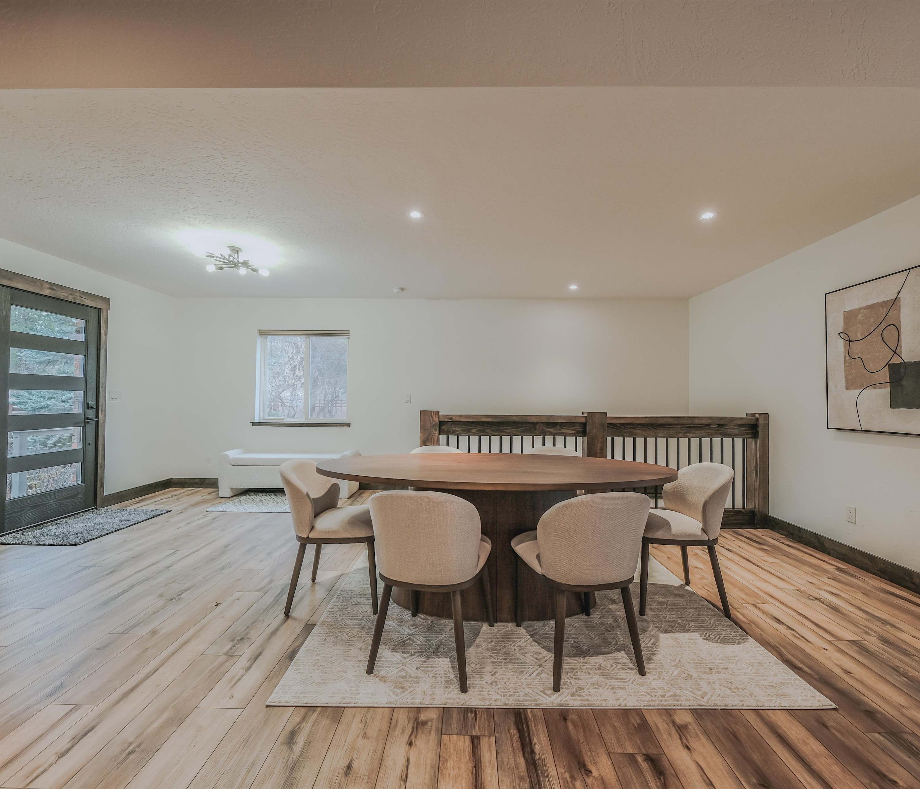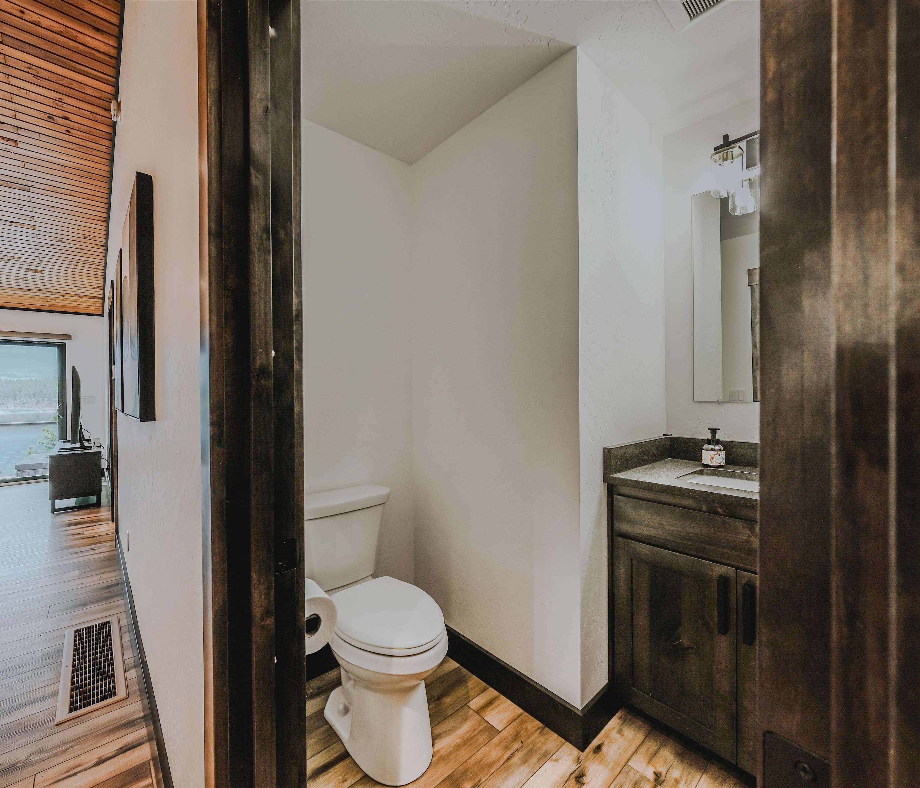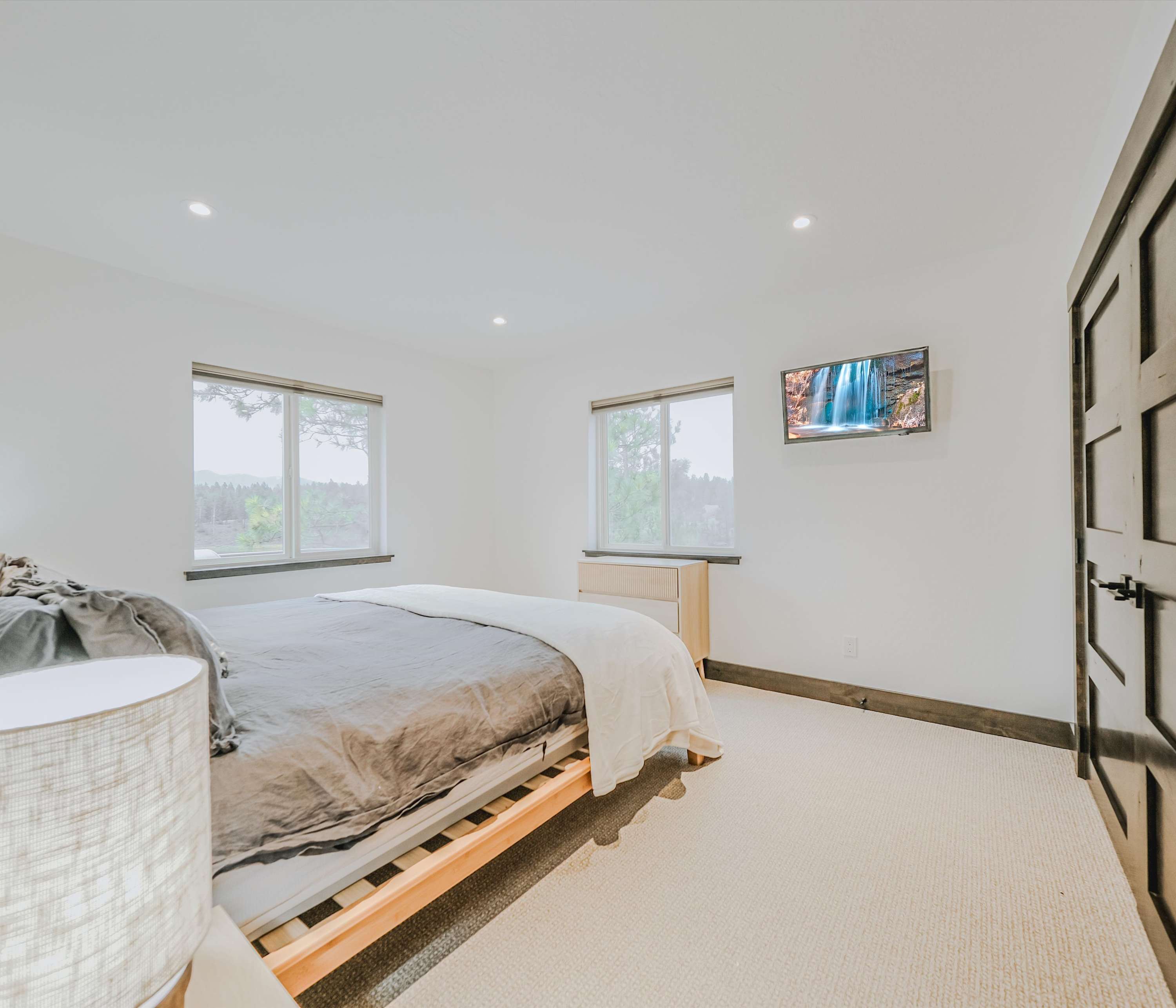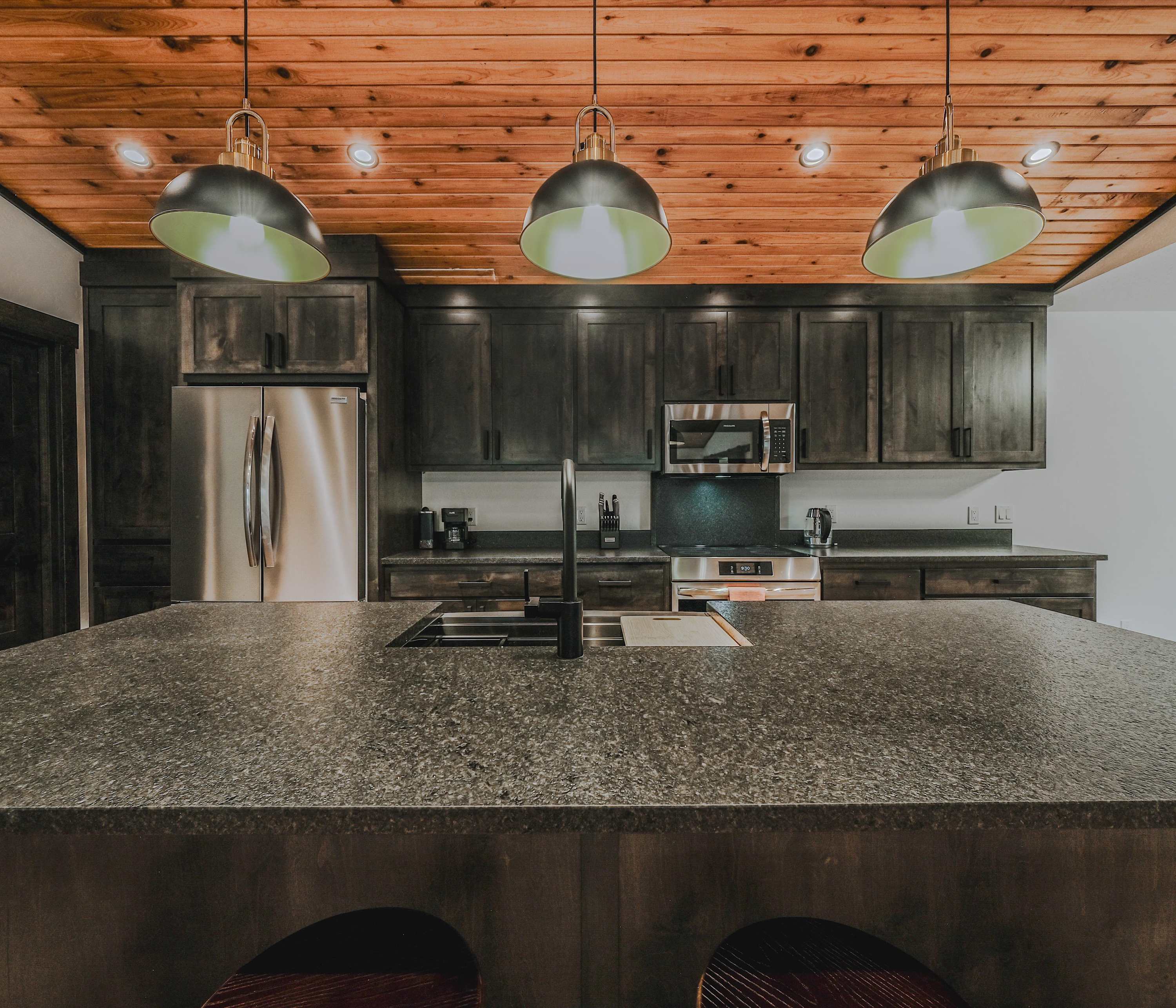 Back inside, you’ll find a modern rustic interior where comfort meets nature. The open-concept living room welcomes you with a cozy couch facing both a smart TV and wide lake views—perfect for relaxing after a day on the water. The kitchen flows seamlessly from here, offering dark cabinetry, stainless steel appliances, and counter seating for four, while a dining table for six sits nearby for shared meals with a view.